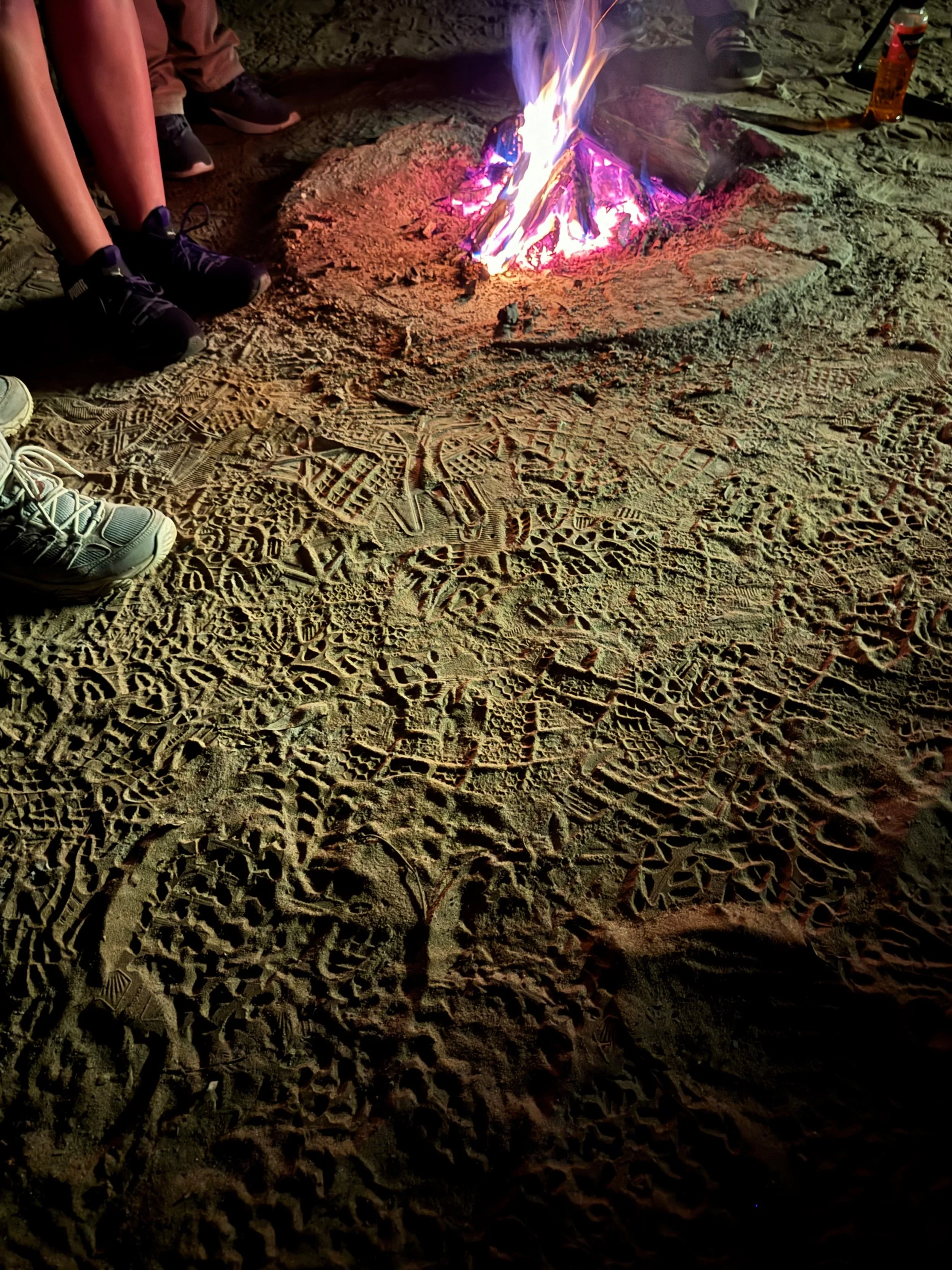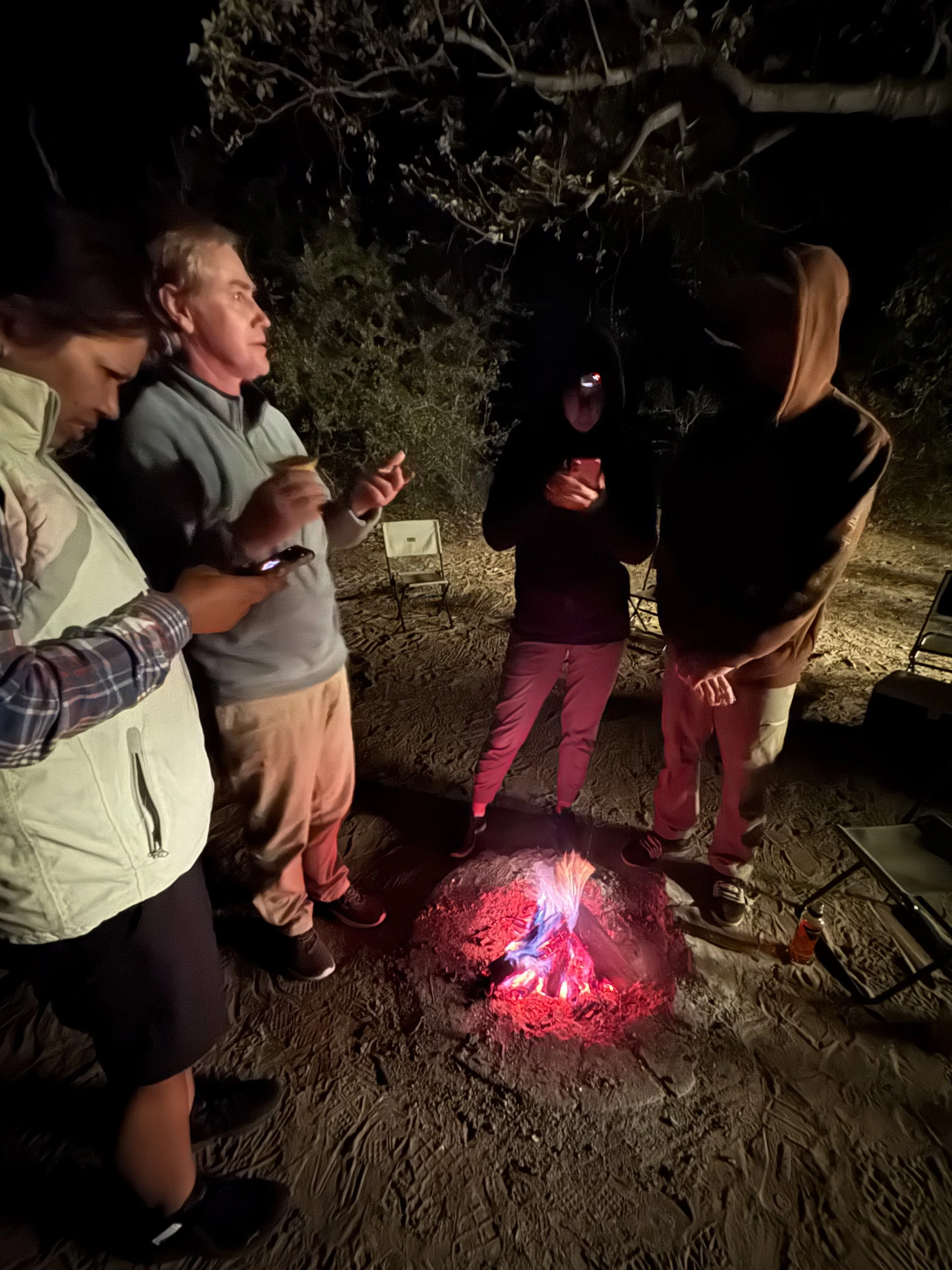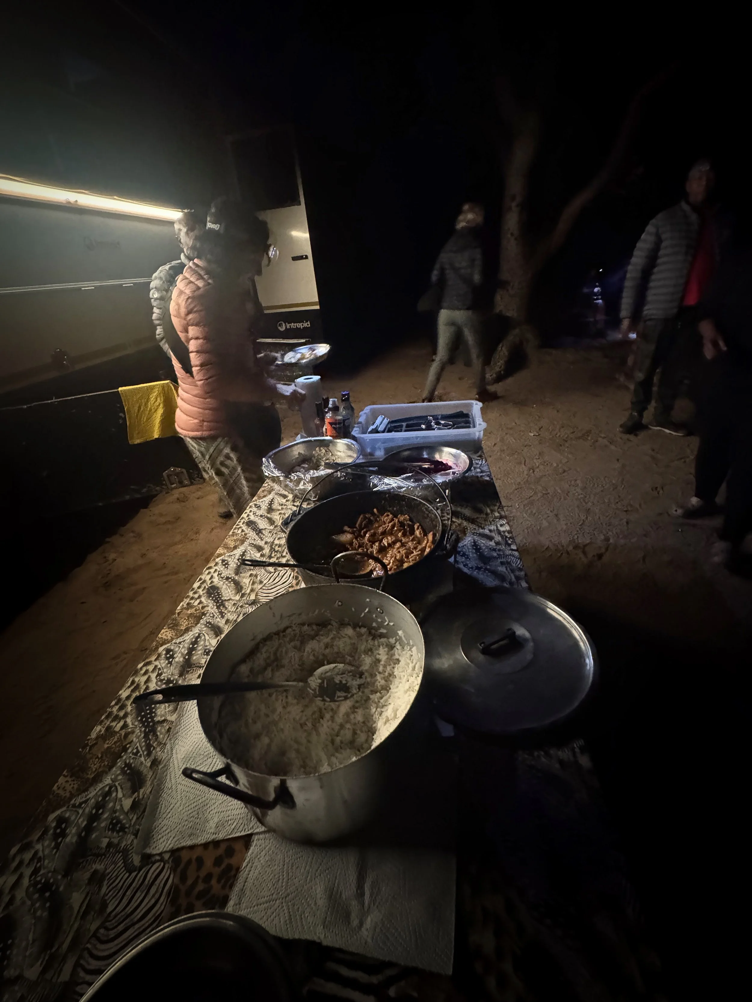 By our return Nola was in full swing and the camp kitchen, essentially boxes hinged from the side of the bus may well have been a Parisian Michelin starred establishment such was the care, devotion and pride exhibited by Nola in it. Our hands were to be unquestionably washed for like Capt. James Cook and his fight against scurvy, Nola’s commitment to cleanliness made perfect sense given our environment and the fact it was shared serving and communal eating. There were no tables, only the stability of joined knees balancing a warm plate of hot food and a mug of your desired vice making repeated patterns in the thinly grained sand of natures floor. Rickety camp chairs in the middle of a rhino statuary delivered exactly per the brochure putting us all in the most dreamlike state. We have no recollection of what was on the menu tonight save the fact it was absolutely delicious and on the right side of wholesome given the day we had experienced. The troop was split into 5 equal groups based on immediate seating arrangements for washing up detail that would rotate though the course of our journey and soon after some rum, and even darker liquids, were retrieved from the bottom of our bags for appropriate airing.