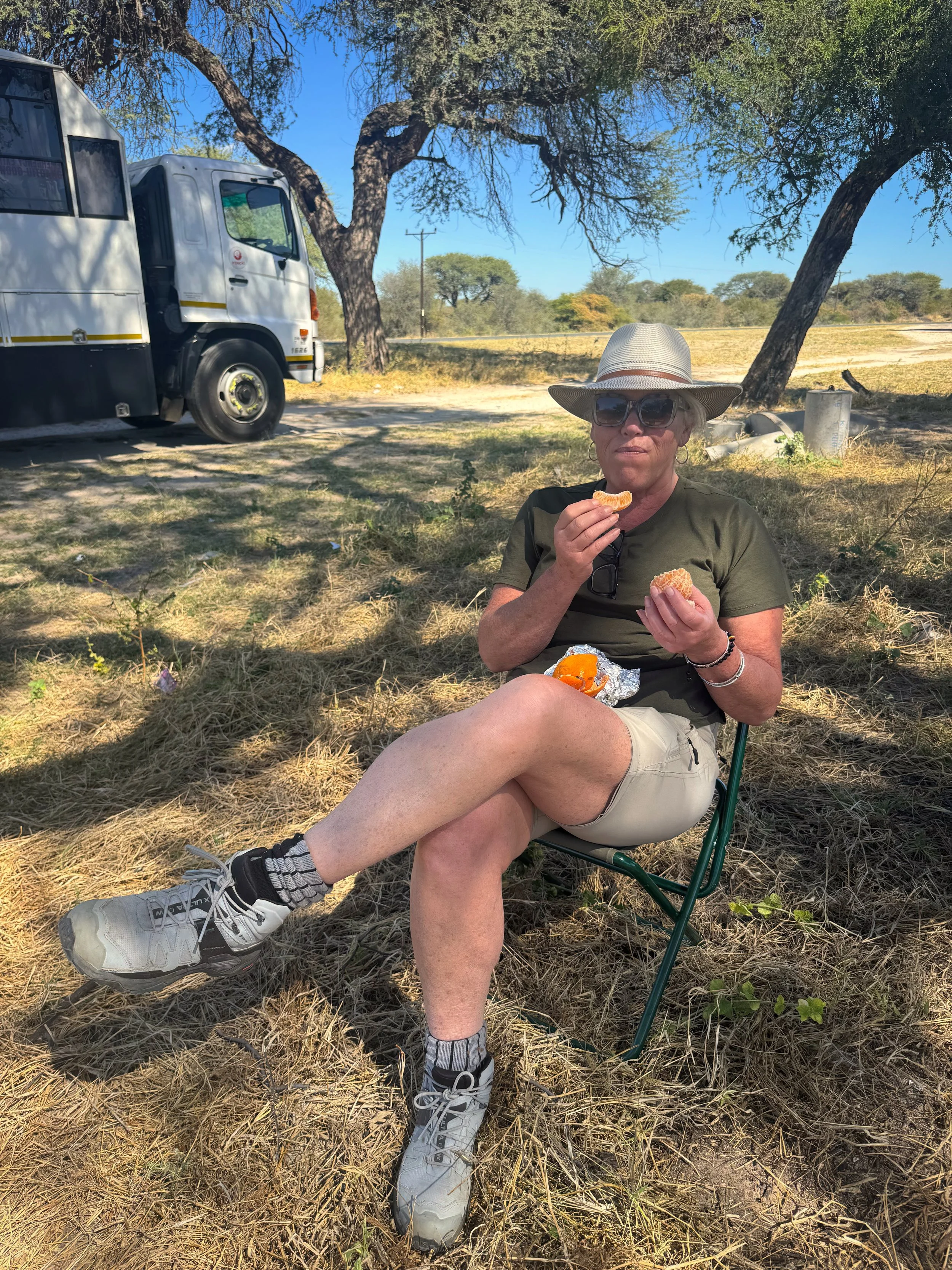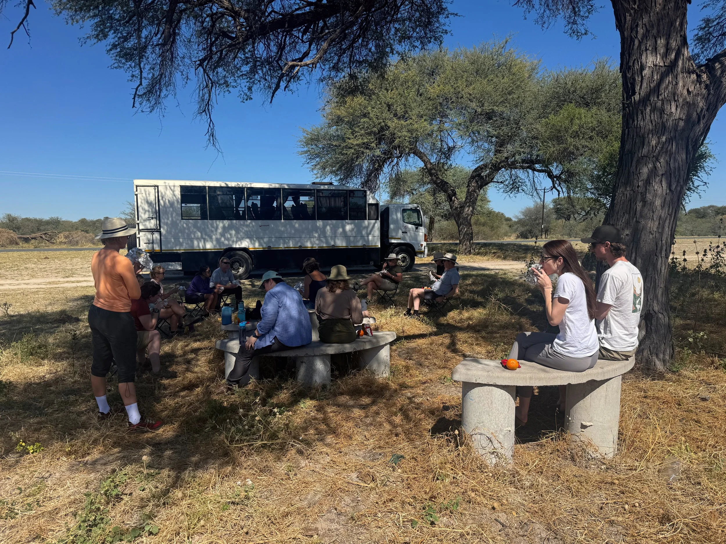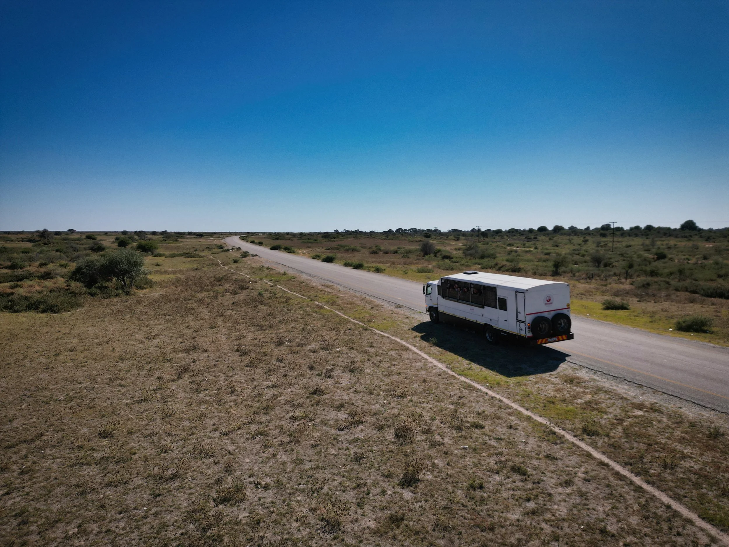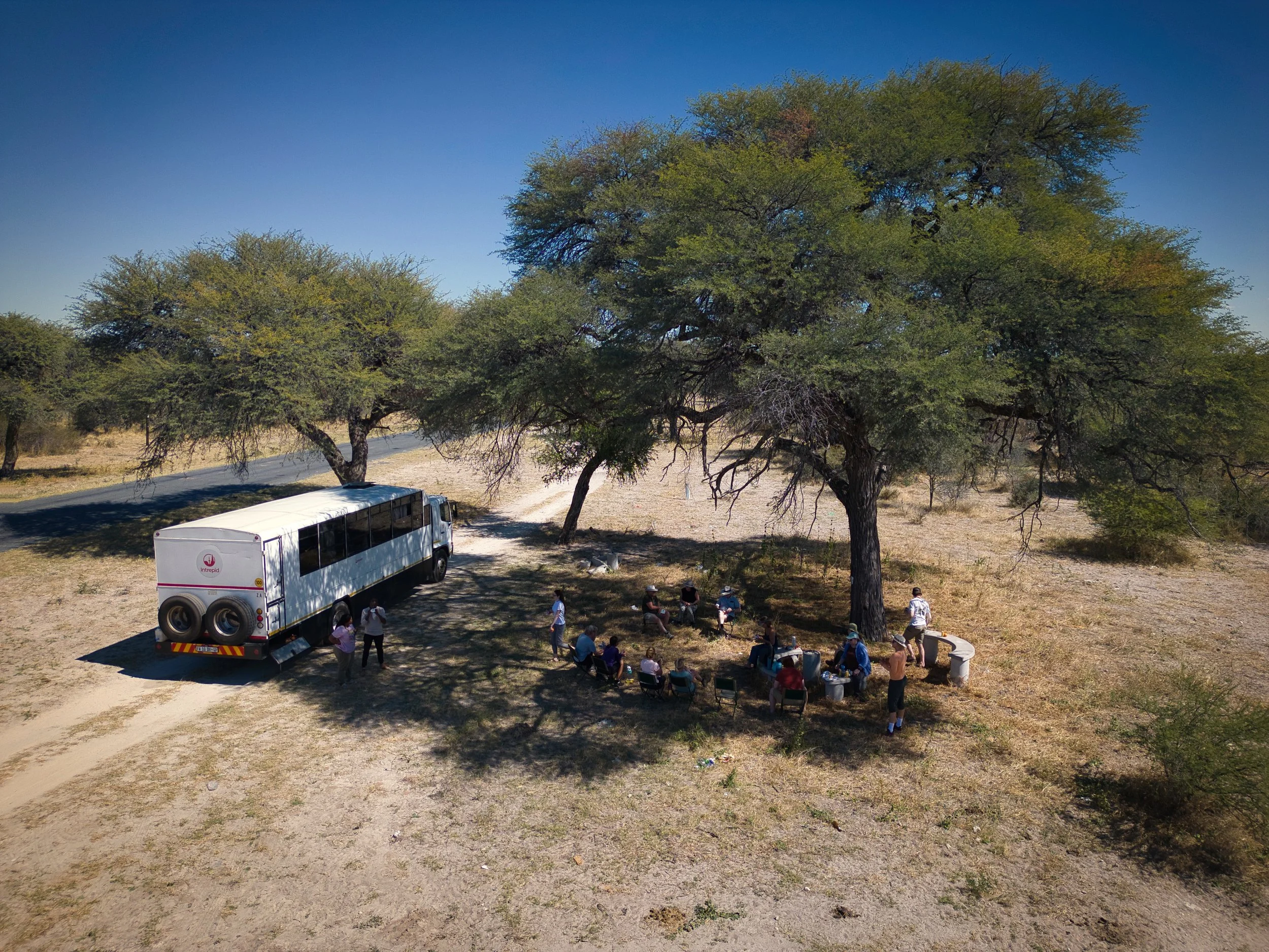 This section also allowed Fatpap to send Derek skyward for some establishing shots and all important footage for the soon to be released travel video. In howling crosswinds whipped across the Kalahari, Derek as always performed superbly capturing some bangers otherwise unattainable. At some point we also stopped for lunch prepared by Nola that morning consisting of chicken wraps, fruit, snacks and juice and under the shade of an Acacia tree the group thankfully alighted to scoff aforementioned lunch and prepare the arse for another long sector onto Maun.