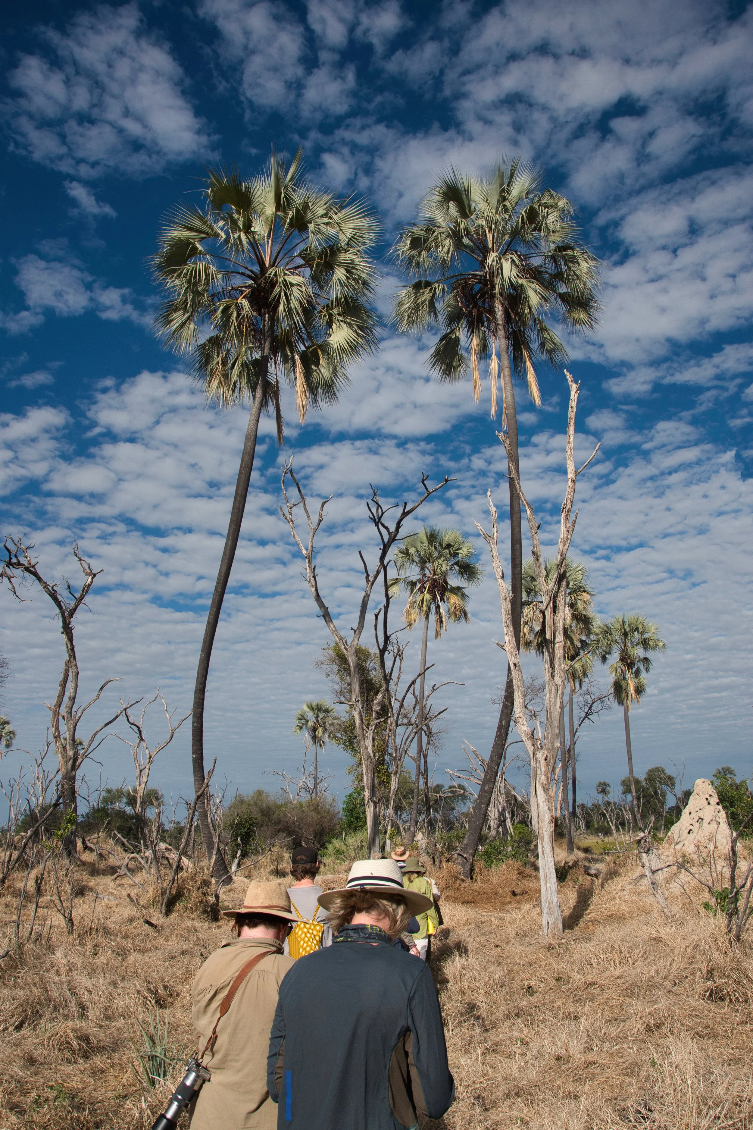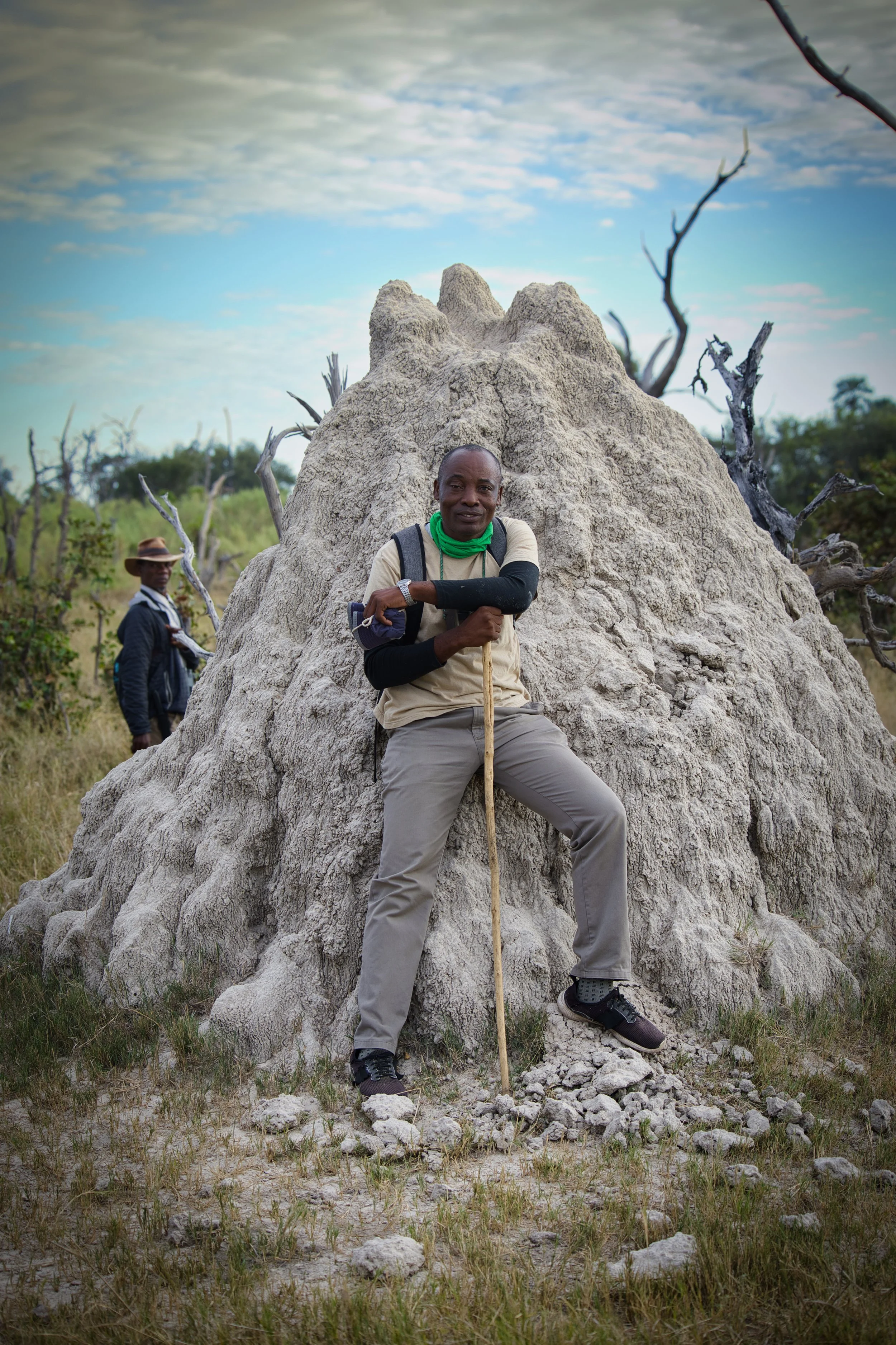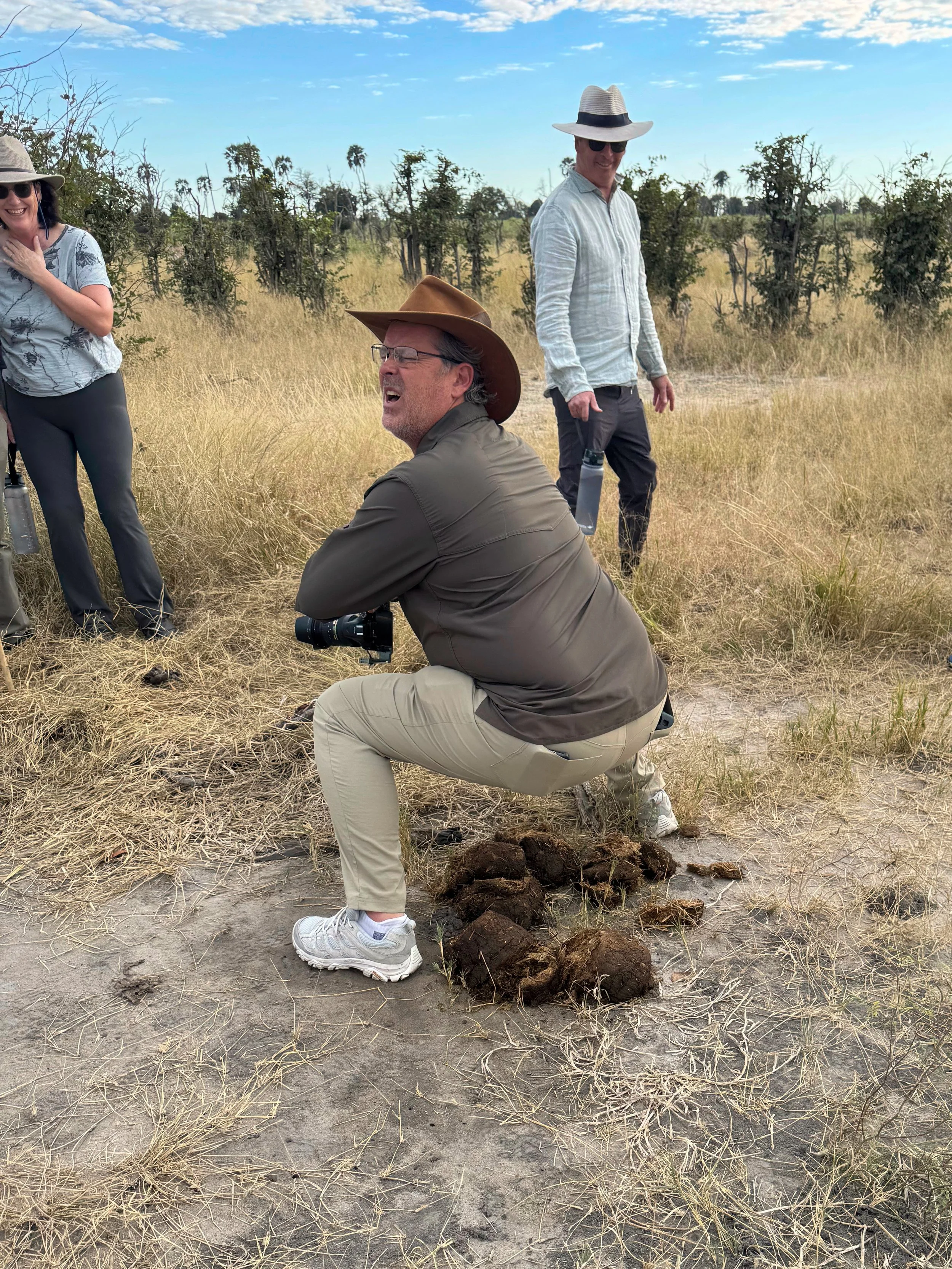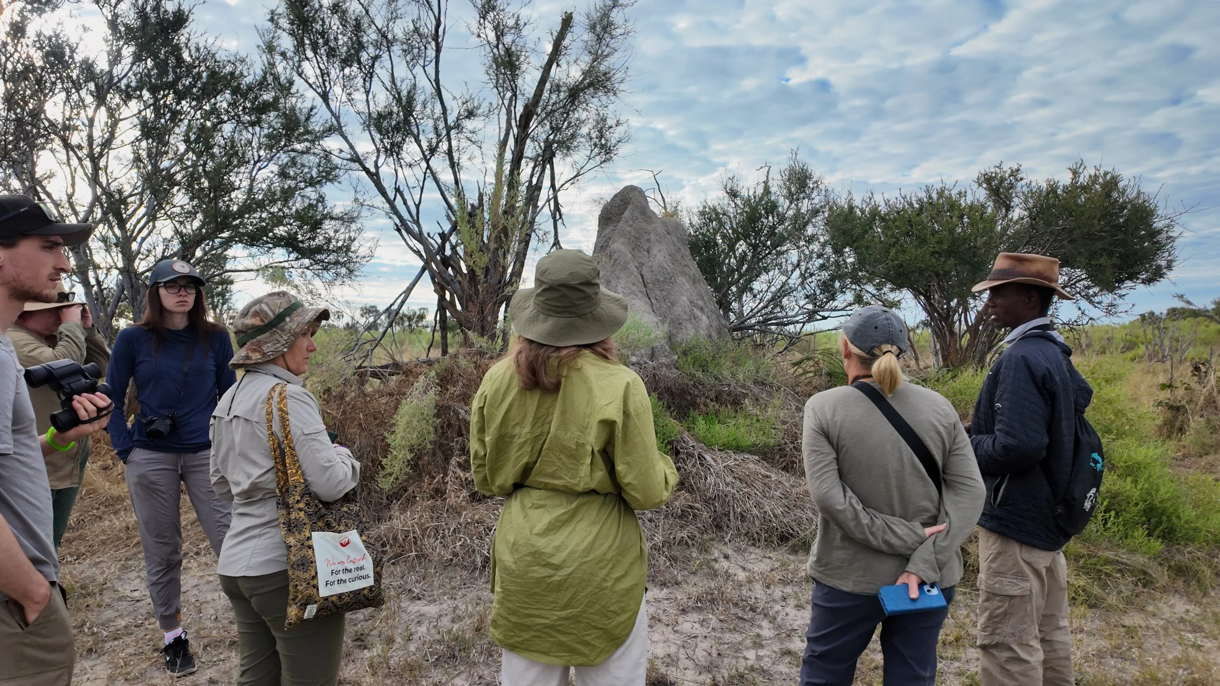 Vegetation was primarily a combination of shrubs and grasses but the Okavango Delta is home to a diverse range of tree species including iconic baobabs, figs, and palms which have adapted to the unique wetland environment. These trees play a vital ecological role providing food and shelter for wildlife and hold cultural significance for local communities. Throughout the walk the guides pointed out the unmistakable patterns of animal behaviour, particularly when feeding, together with fresh lion prints they astutely steered us away from. Termite mounds peppered the landscape containing yet another bio-society within the complex African terrain while freshly produced elephant dung brought on any number of childish jokes.