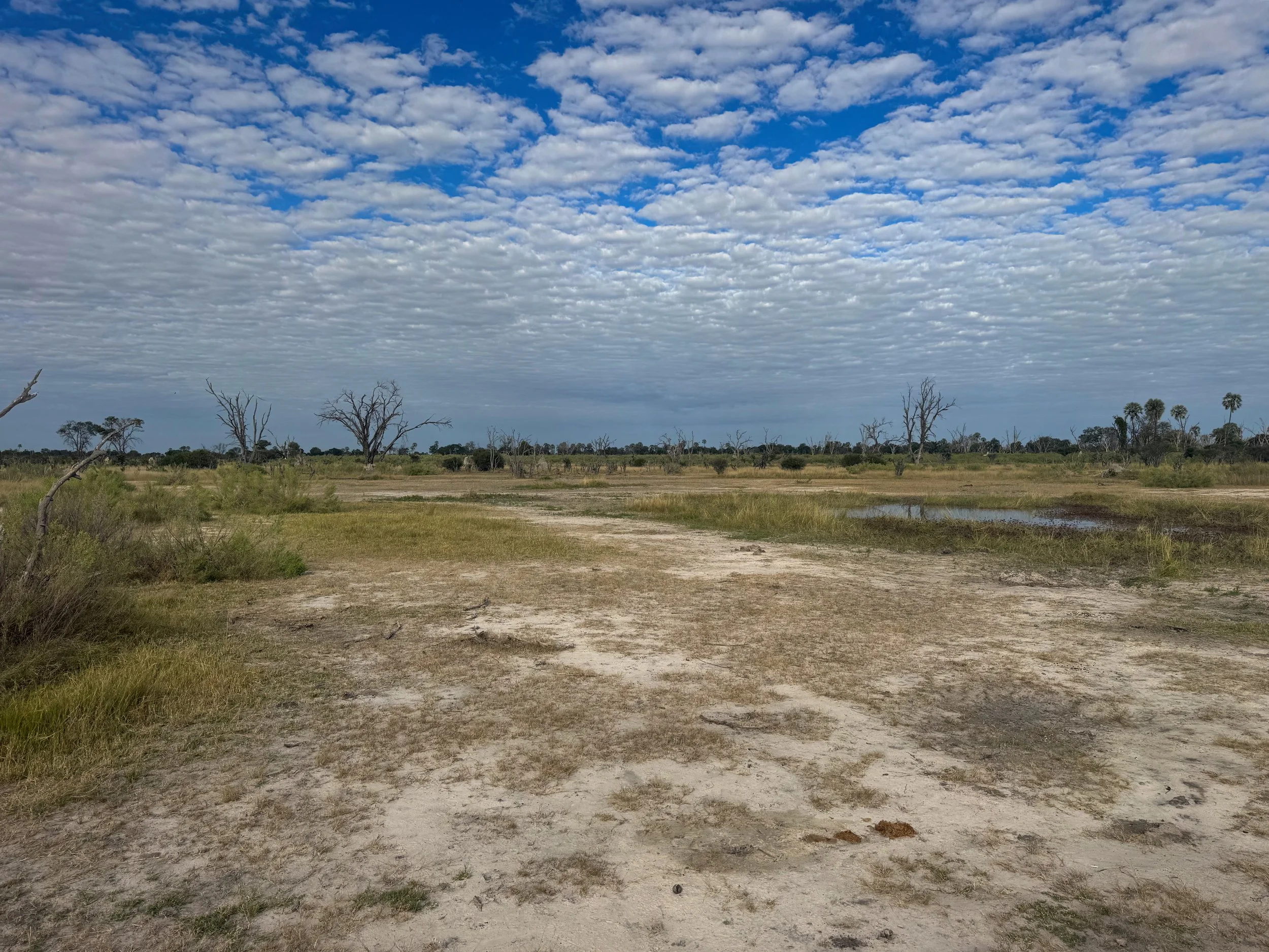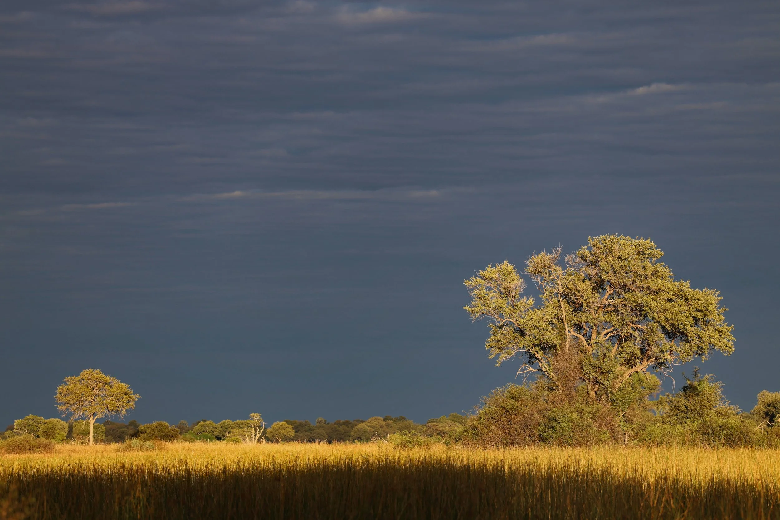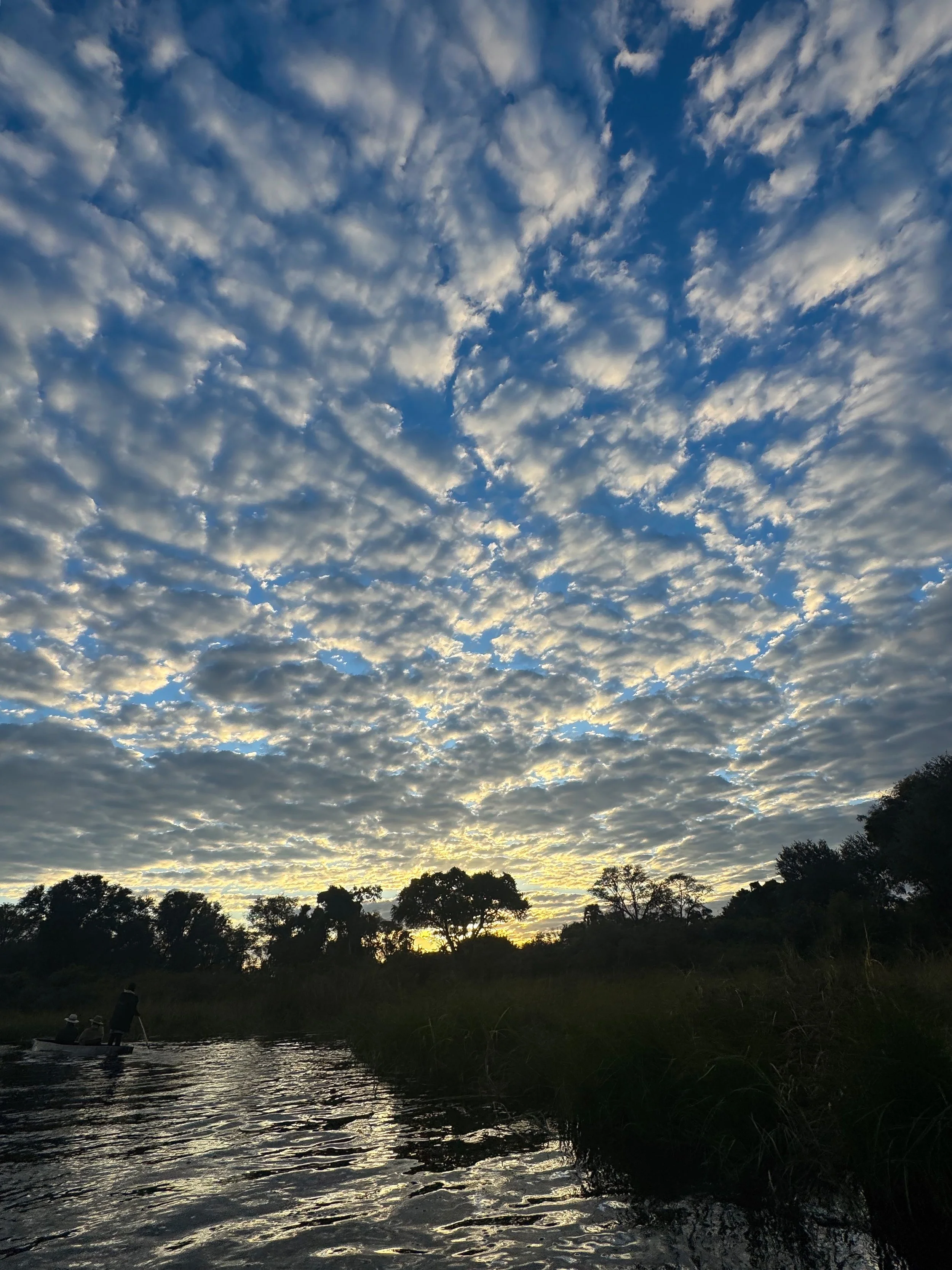 As yesterday finished so today would start but with the first leg via mokoro. With the vivid colours of sunrise faded what remained was a brilliant blue sky matted by altocumulus cloud formations tinged by a golden brush at their upper reaches. North of camp we poled for only a short while before disembarking to start our foot safari. Westward a bank of heavy clouds defied other sectors of sky fighting with the rising sun to produce the most stunning palate of golden light framed against a grey tempest backdrop.