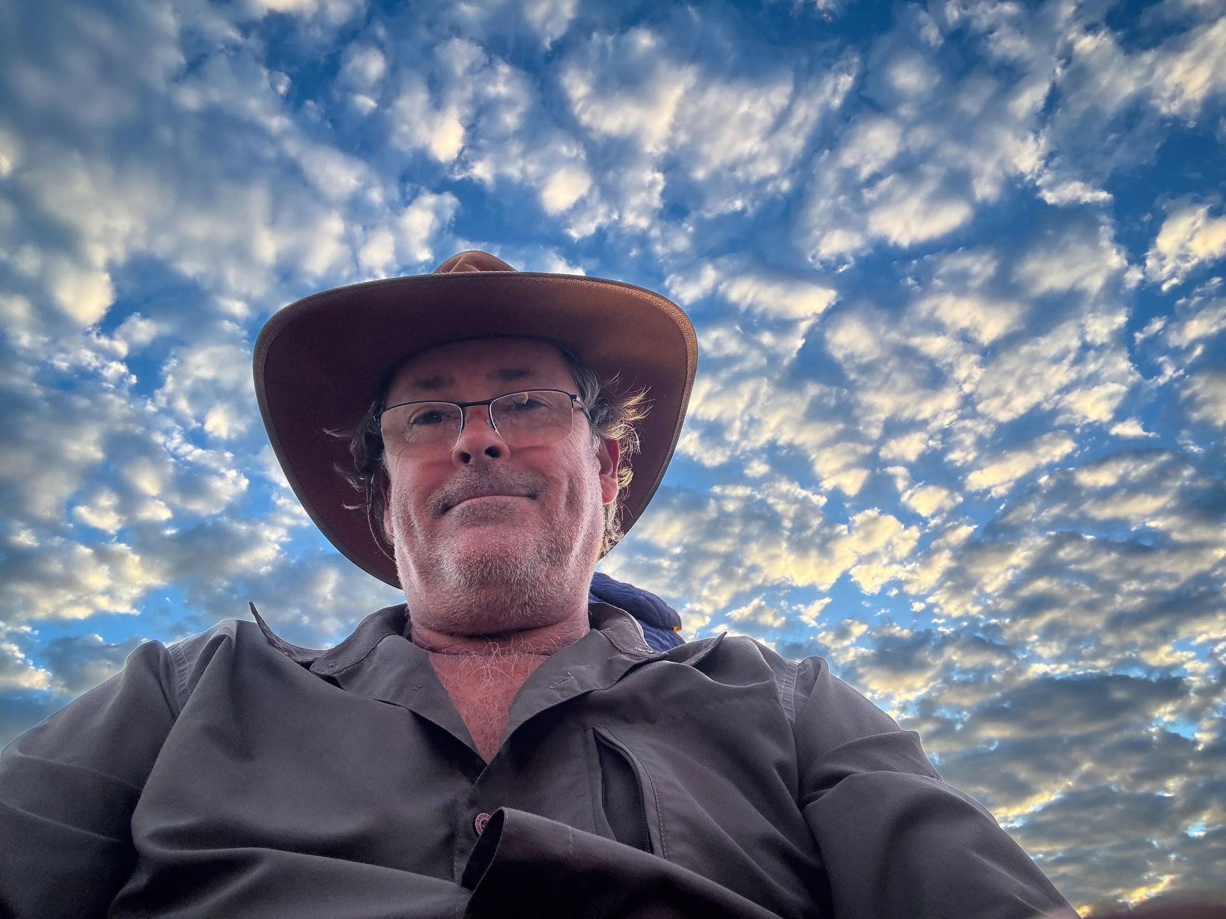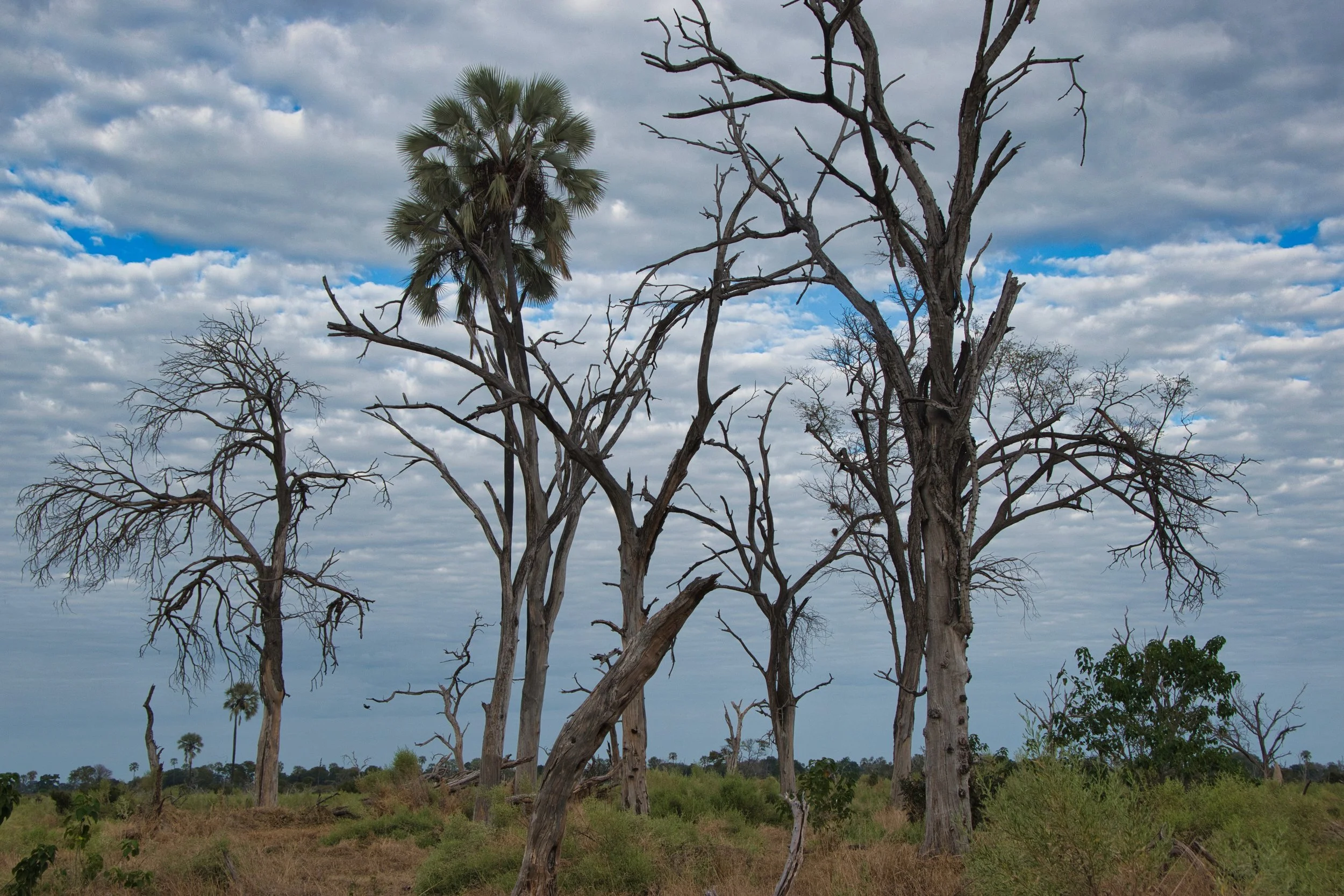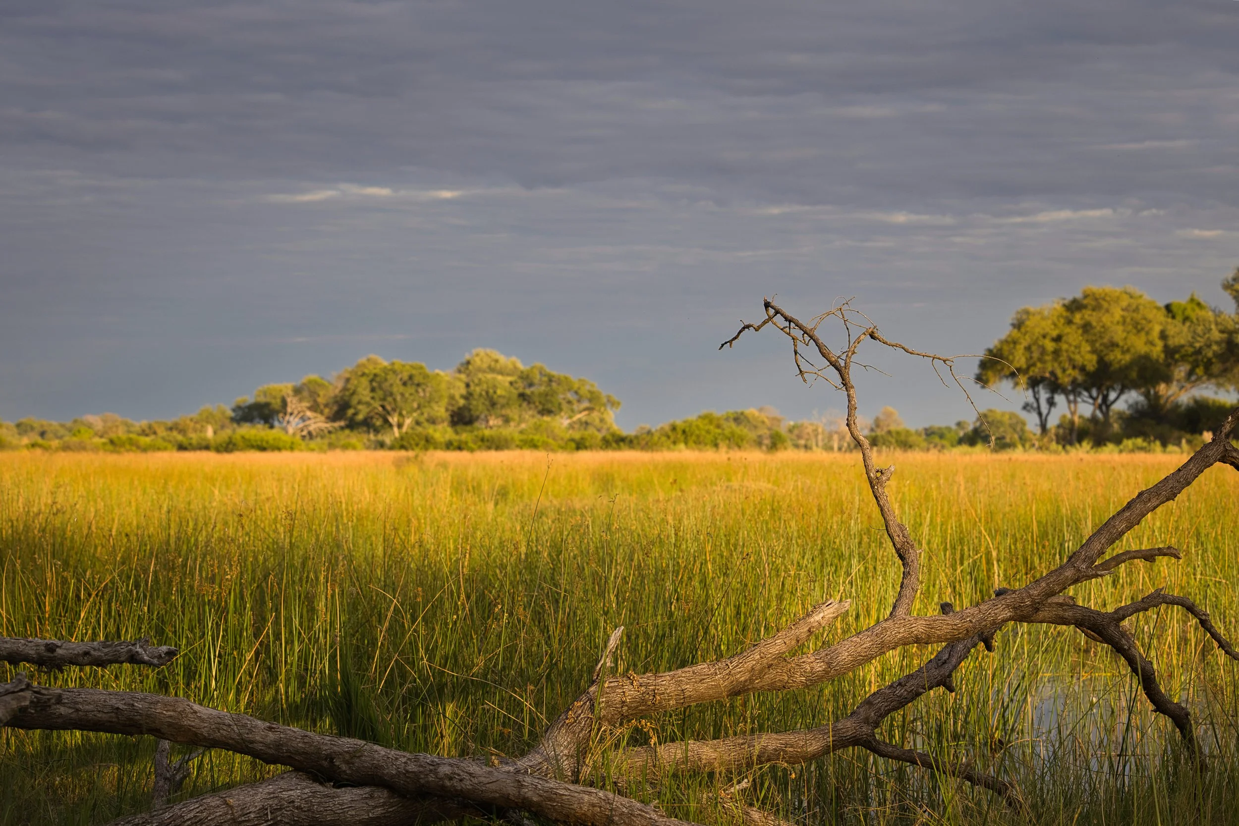 As yesterday finished so today would start but with the first leg via mokoro. With the vivid colours of sunrise faded what remained was a brilliant blue sky matted by altocumulus cloud formations tinged by a golden brush at their upper reaches. North of camp we poled for only a short while before disembarking to start our foot safari. Westward a bank of heavy clouds defied other sectors of sky fighting with the rising sun to produce the most stunning palate of golden light framed against a grey tempest backdrop.