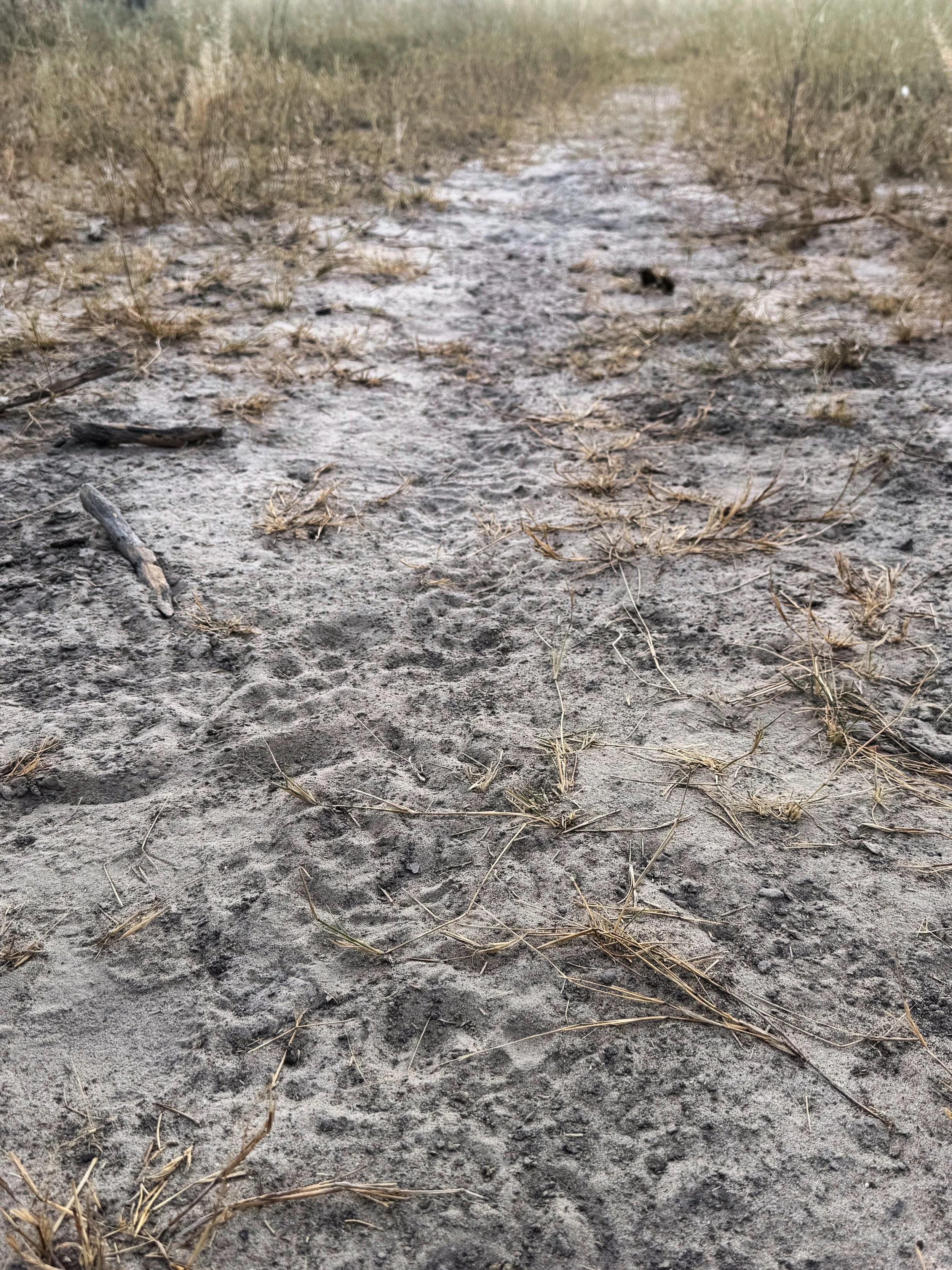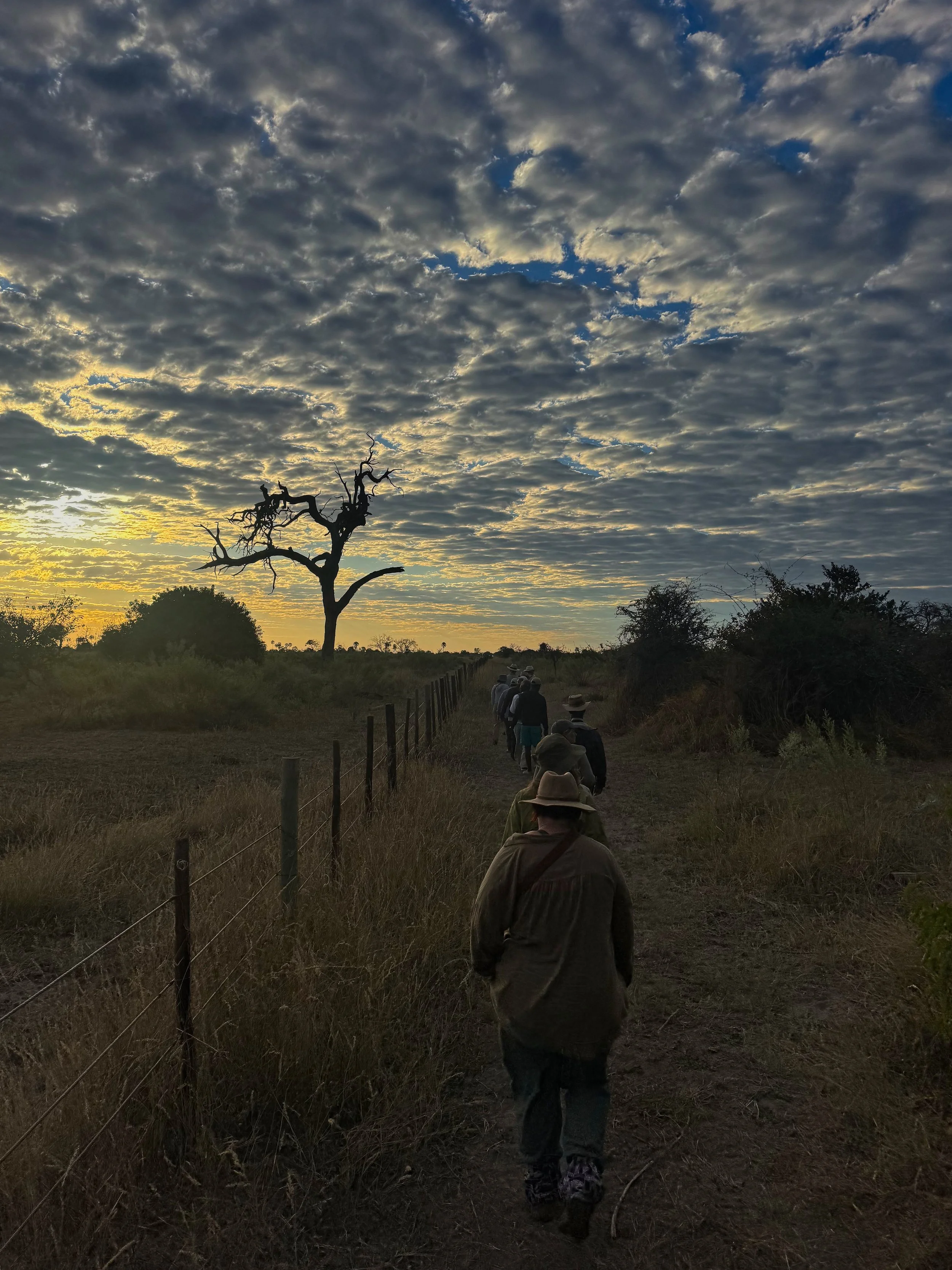 The walk would prove spectacular covering maybe 6km in total and after leaving the river we followed a veterinary fence designed to control the spread of diseases like foot-and-mouth between wildlife and cattle. While intended to protect livestock and facilitate Botswana's beef export industry, they have been criticised for disrupting wildlife migrations and causing harm to various animal species. We found a suitable gap to cross over and immediately came upon a giraffe skeleton. Death is of course natural in the African wild but there was something forlorn about these oversized bones felled in a manner distinguishing the very animal they belonged to.