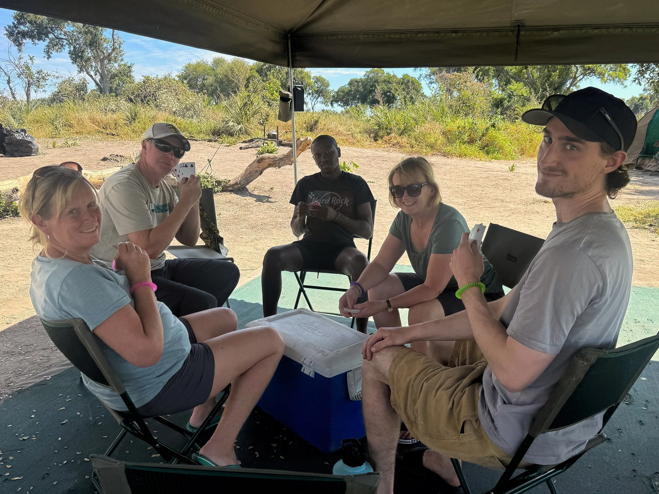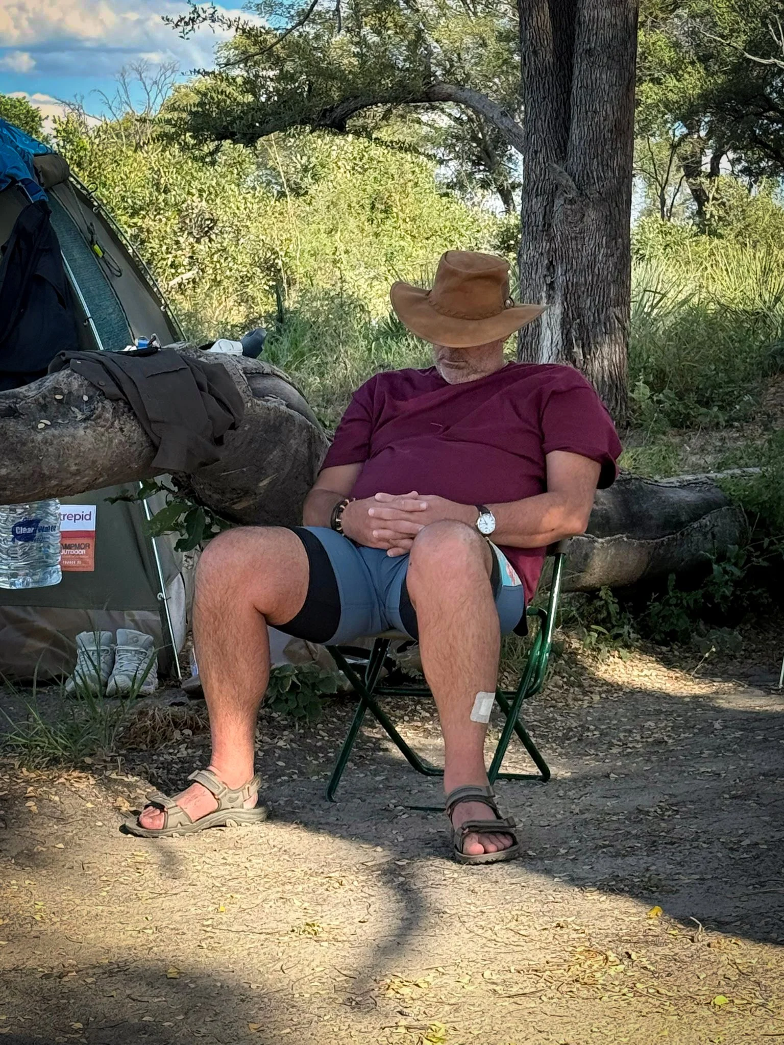 We returned to camp mid morning to the welcomed advice that today would be a freebie with no immediate plans and we could do whatever we pleased. Some napped, others watched elephants and a few played cards or caught up on their books. Fatpap cooled himself down by the river and spied our resident elephant, Stampy, starting to make his move. The herd mostly stayed on the far bank of the river with one bull always standing point a little closer regardless of numbers. Omnipresent, we named him Stampy, and today he was on our side of the river just behind the tents. Fatpap followed as he meandered through the camp quickly grabbing his camera - and a guide - for a closer look. For 20 minutes within a distance less than 5 meters, this majestic creature ate his way around Fatpap raising his enormous eyes only on the odd occasion. It truly was a magical moment for the slimmest bloke in the room for once.
