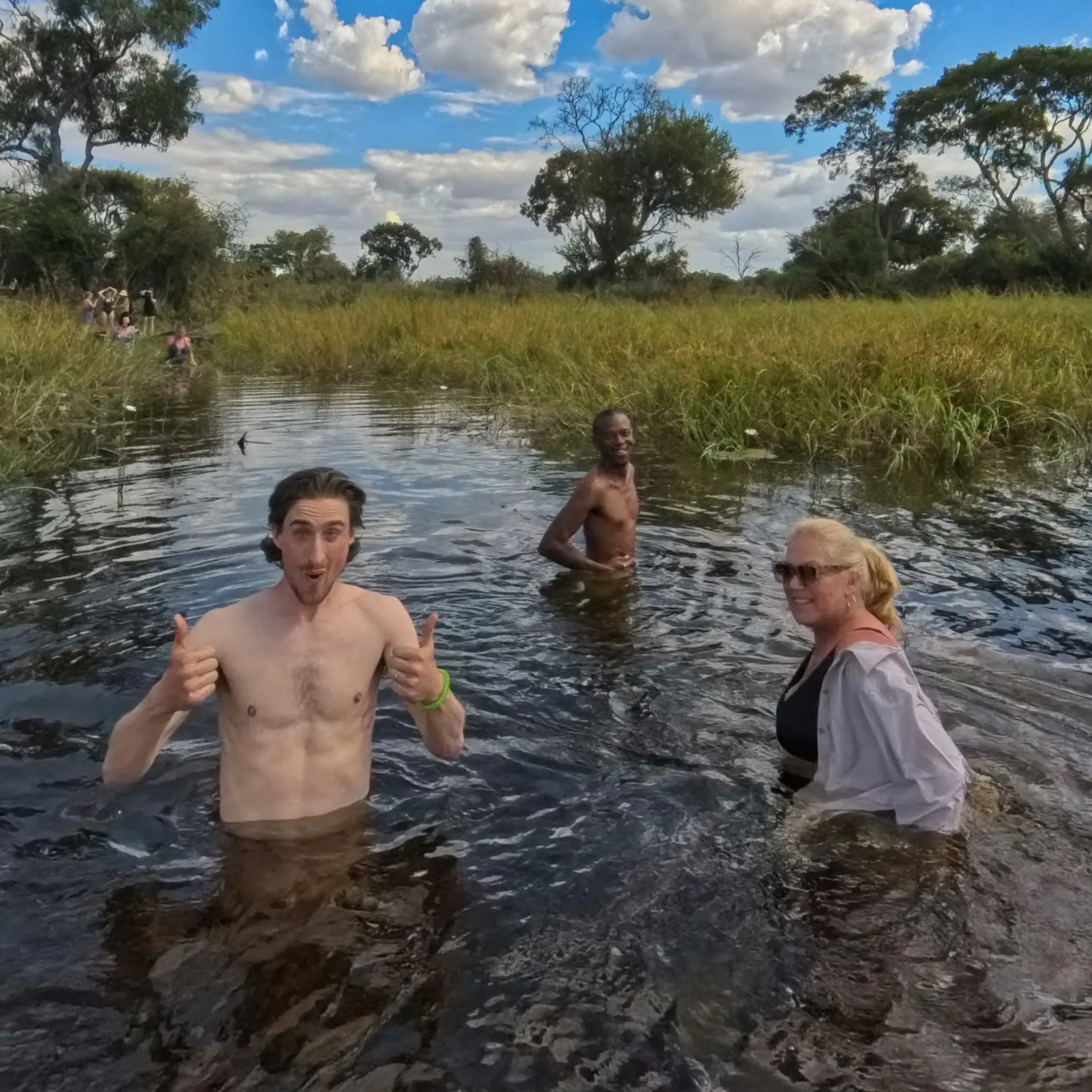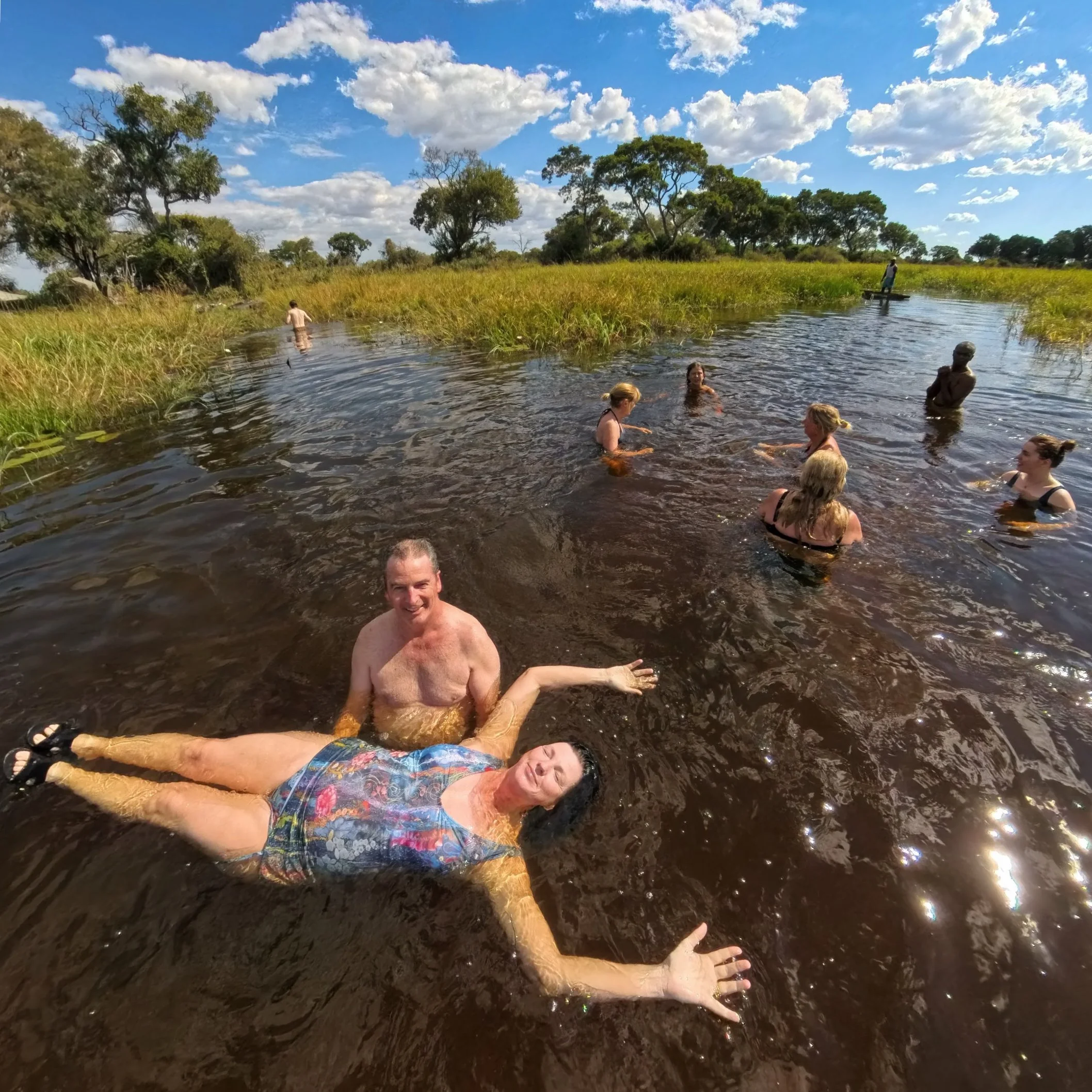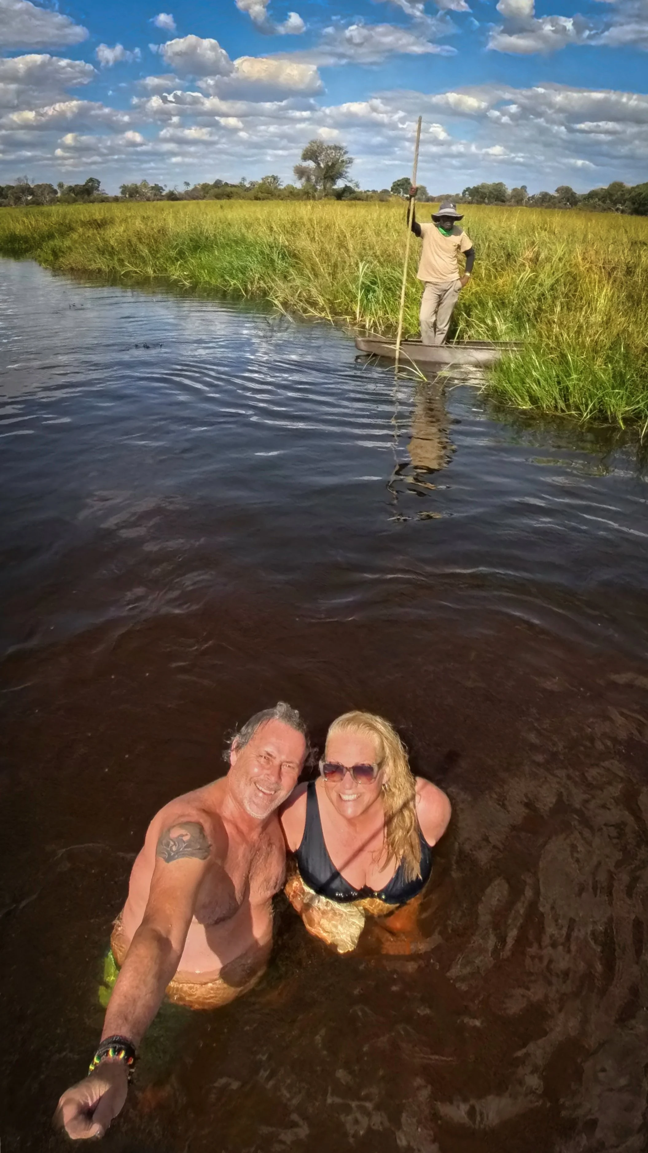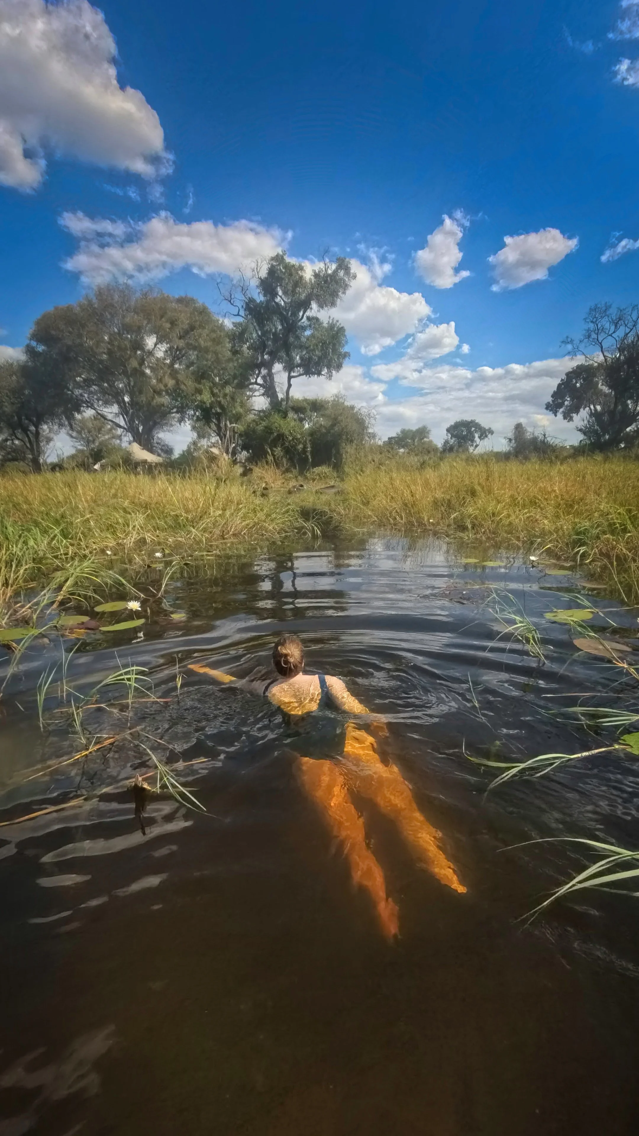 After lunch all but a few opted for an Okavango dip and braved the hippos and water temperature for a chance to see Duncan’s Canadian Camouflage in all its glory. The water while coolish was refreshingly clean and after 2 days without showering the ideal remedy for the dust and bugs. Away from the entanglement of reeds found at the banks, the river floor was soft sand and pleasing under foot while a noticeable current drifted beneath that if unanchored could easily sweep one down river. The most iconic part of this experience though was the need to have 2 polers and their mokoros stationed 10 metres up and down stream on hippo watch. Hippo watch! Africa just never stopped amazing.