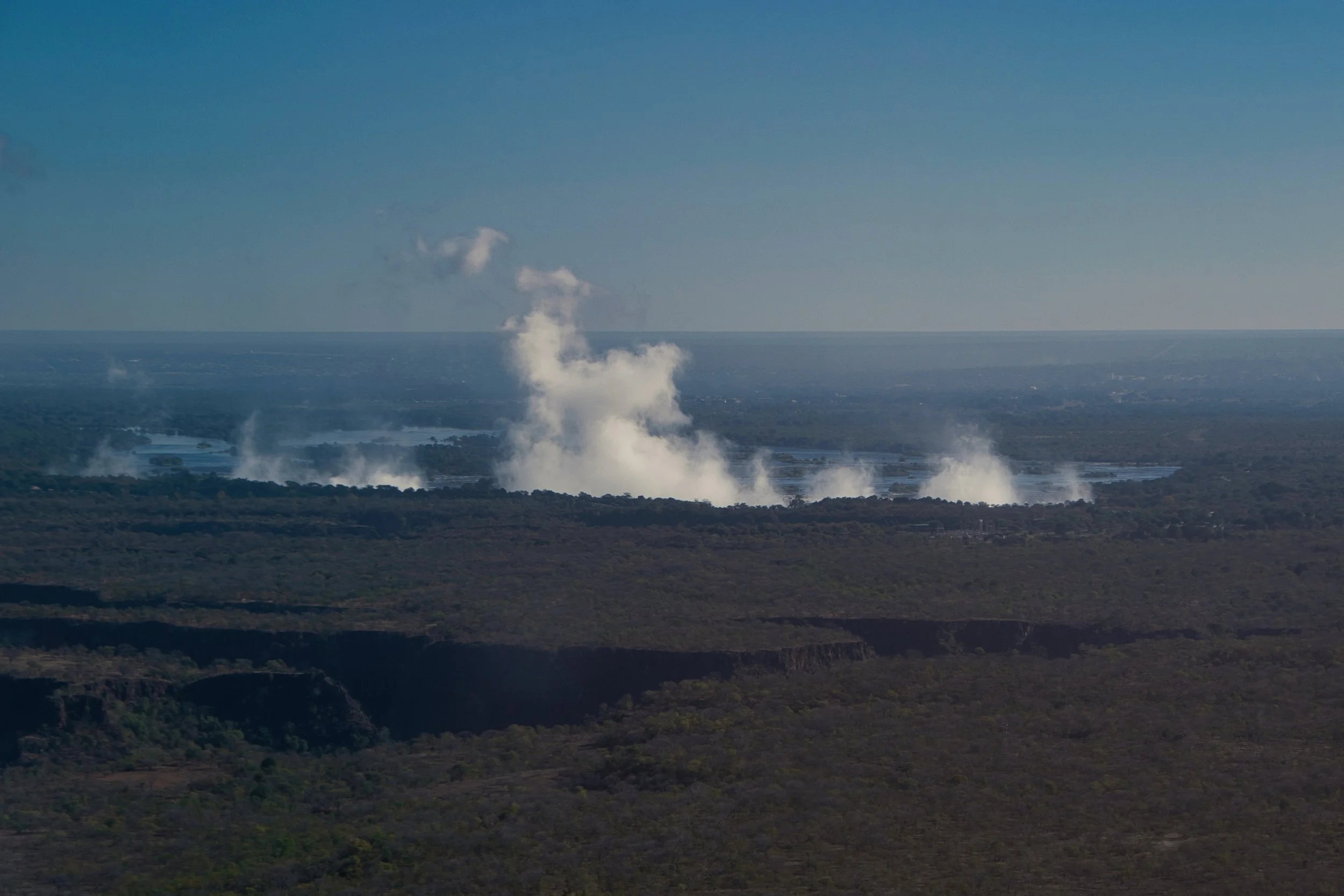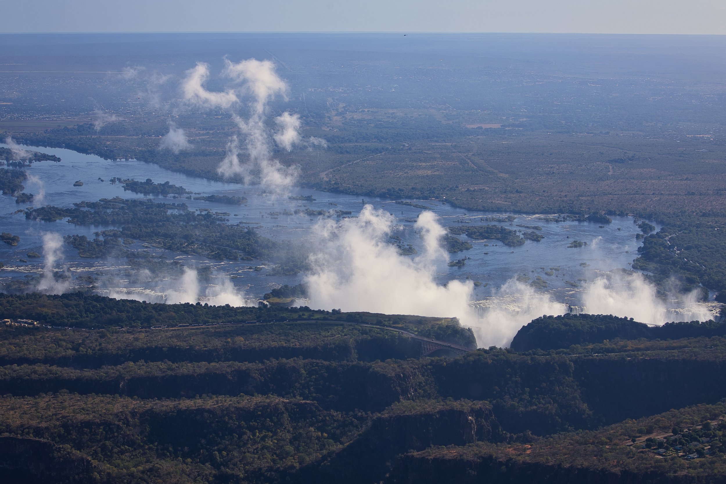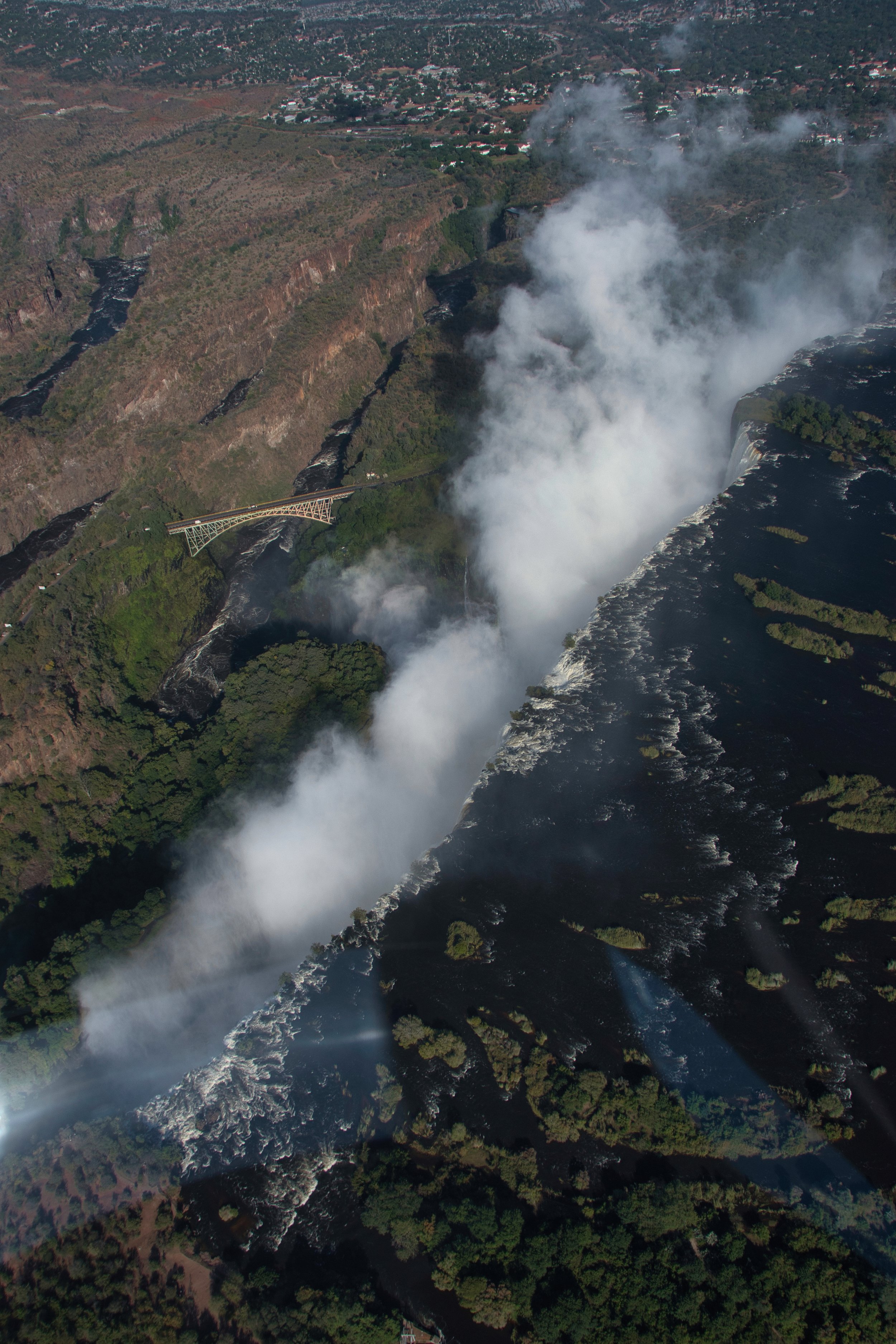 David Livingstone was the first recorded European to view the falls in November 1855 from an island in the middle of the upstream river now oddly known as Livingstone Island. Naming his discovery in honour of Queen Victoria, he made reference to an older name, Chongwe, meaning "the place of the rainbow"as a nod to the constant spray. From our flight this spray was visible for miles and rose from the crack in the earths surface like a steaming New York subway vent on natures steroids.