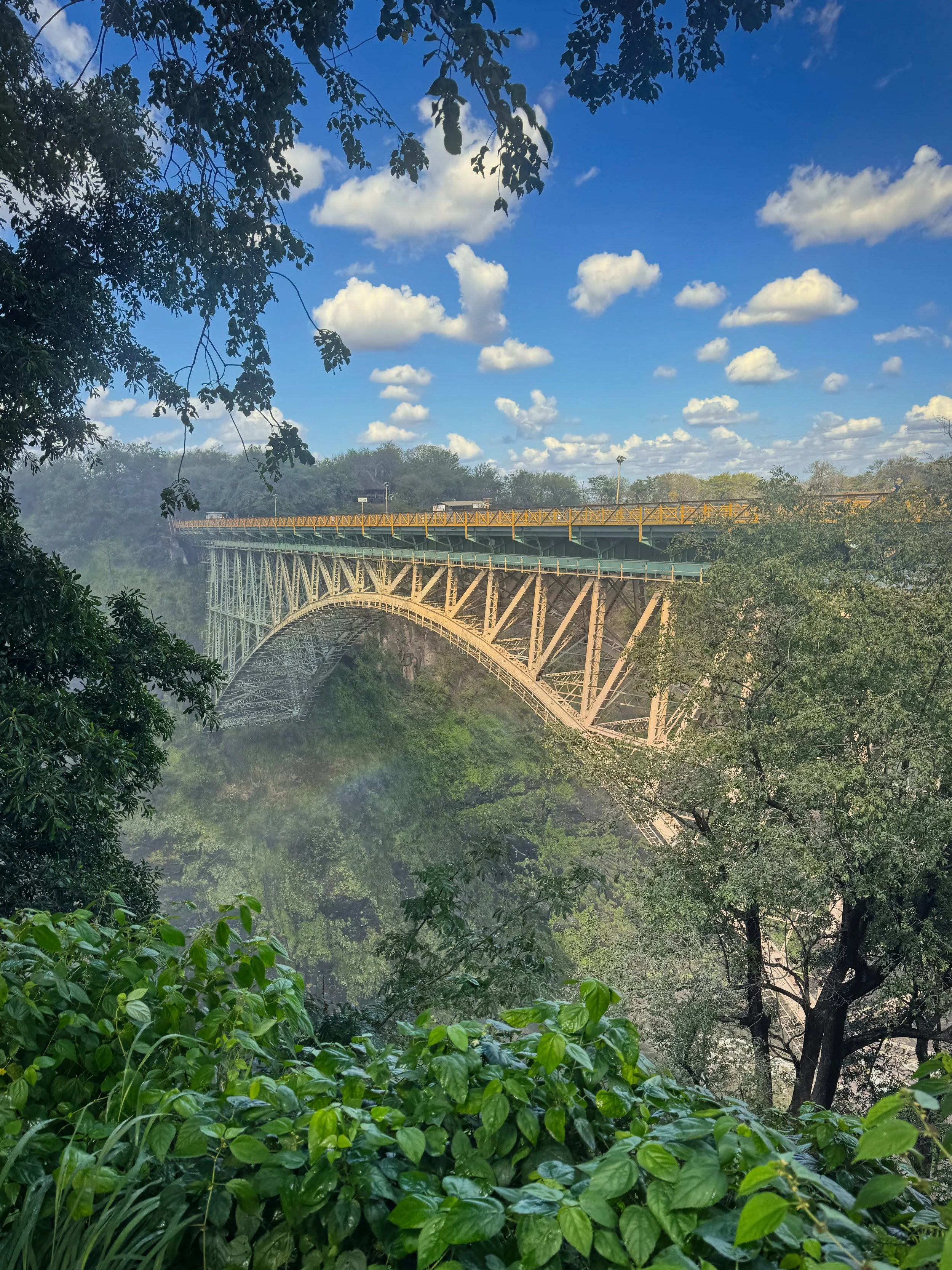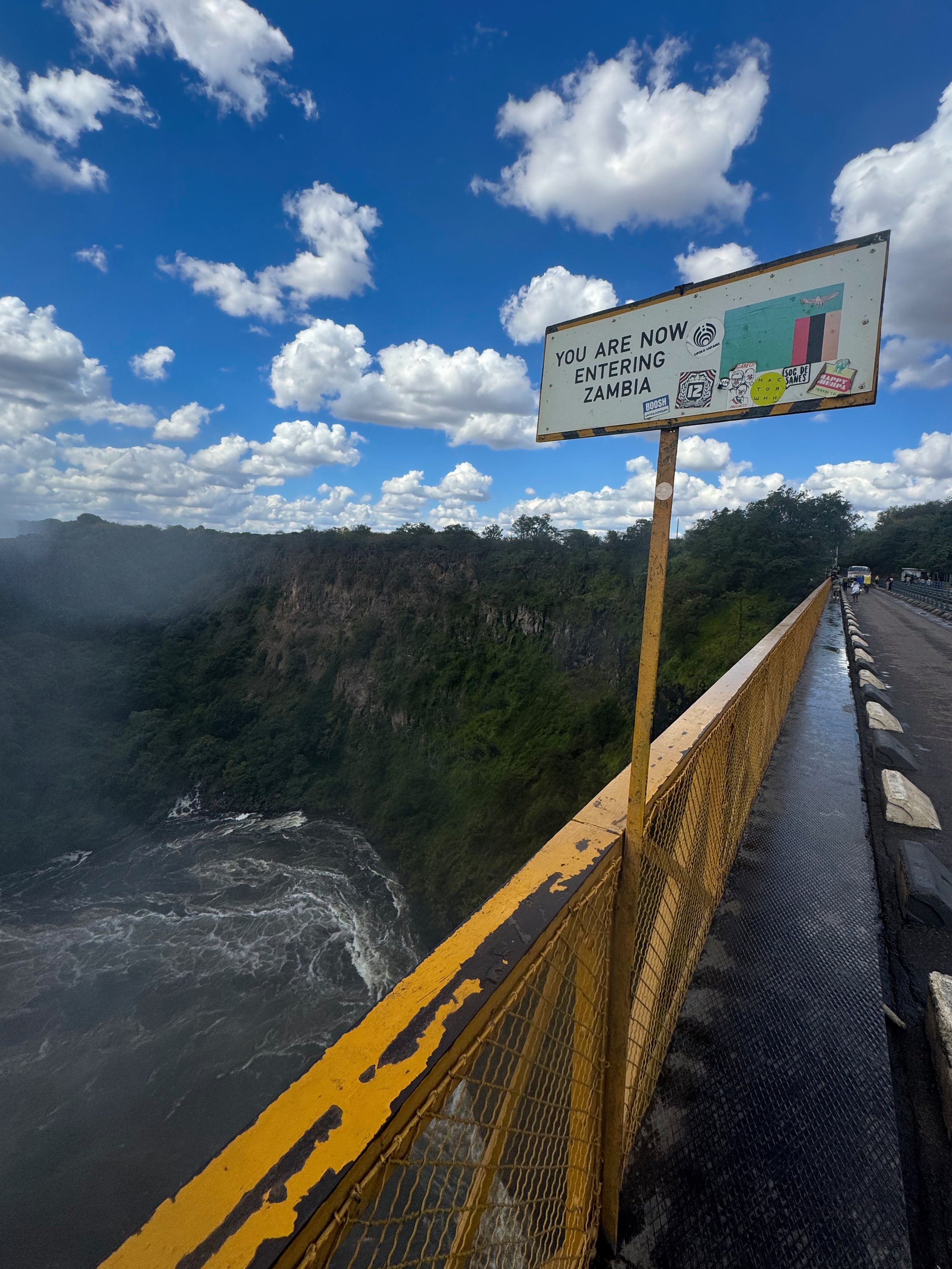 Conceived in 1900 and completed in 1905, the bridge was the brainchild of Cecil John Rhodes and his vision of linking what are now Zambia and Zimbabwe for trading purposes. The single span design was selected to not distract from the natural beauty of the site and began from opposite ends to meet in the middle. Today it is more famous for Bungee jumping and Zip Lining across the gorge which Cerys boldly did the day before. For over 100 years this bridge has been the only rail link from Zimbabwe to Zambia as well as carrying vehicles and foot traffic. The gorge is actually considered to be no-mans land with border posts on either side so Fatpap goofed around a bit straddling both countries for a photo op.