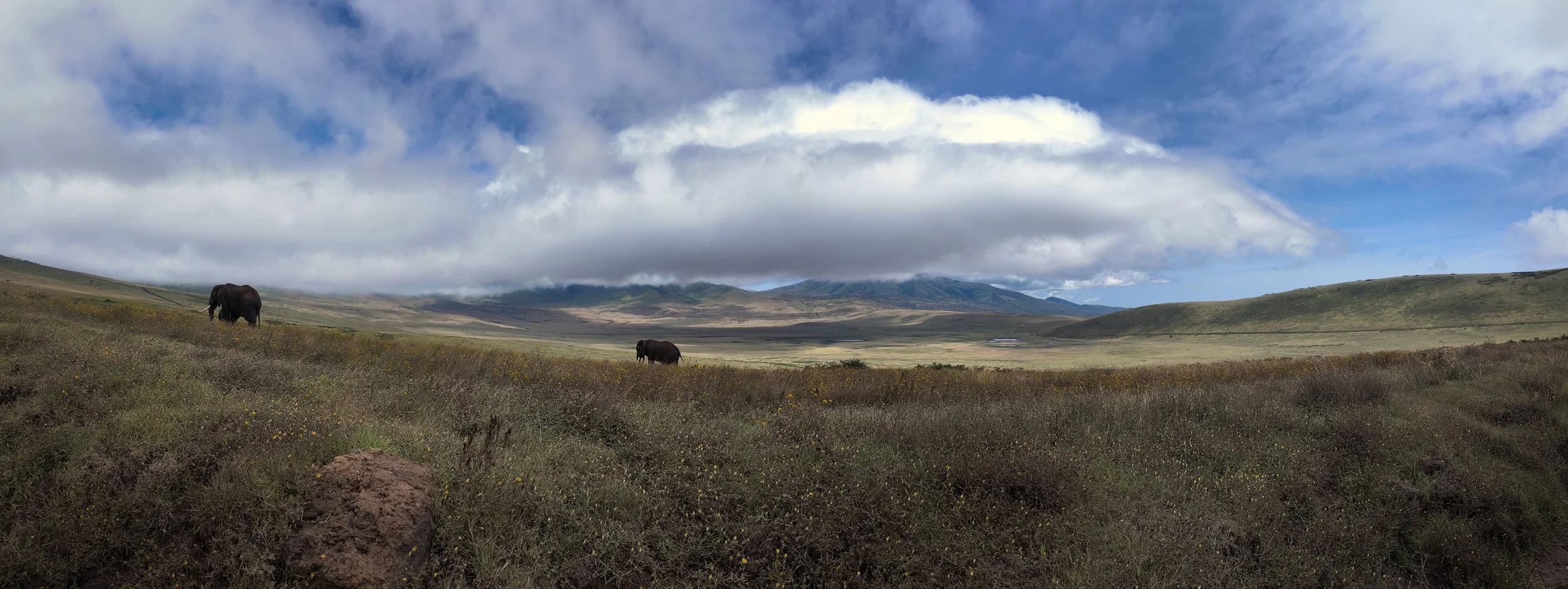 Coming down to the floor of the plain we spied villages etched into the windward side of the rolling hills and pulled into a lookout point. It was surprisingly cold, and with early clouds still sweeping across the top of the crater making it look more like a Scottish moor than an African plain.