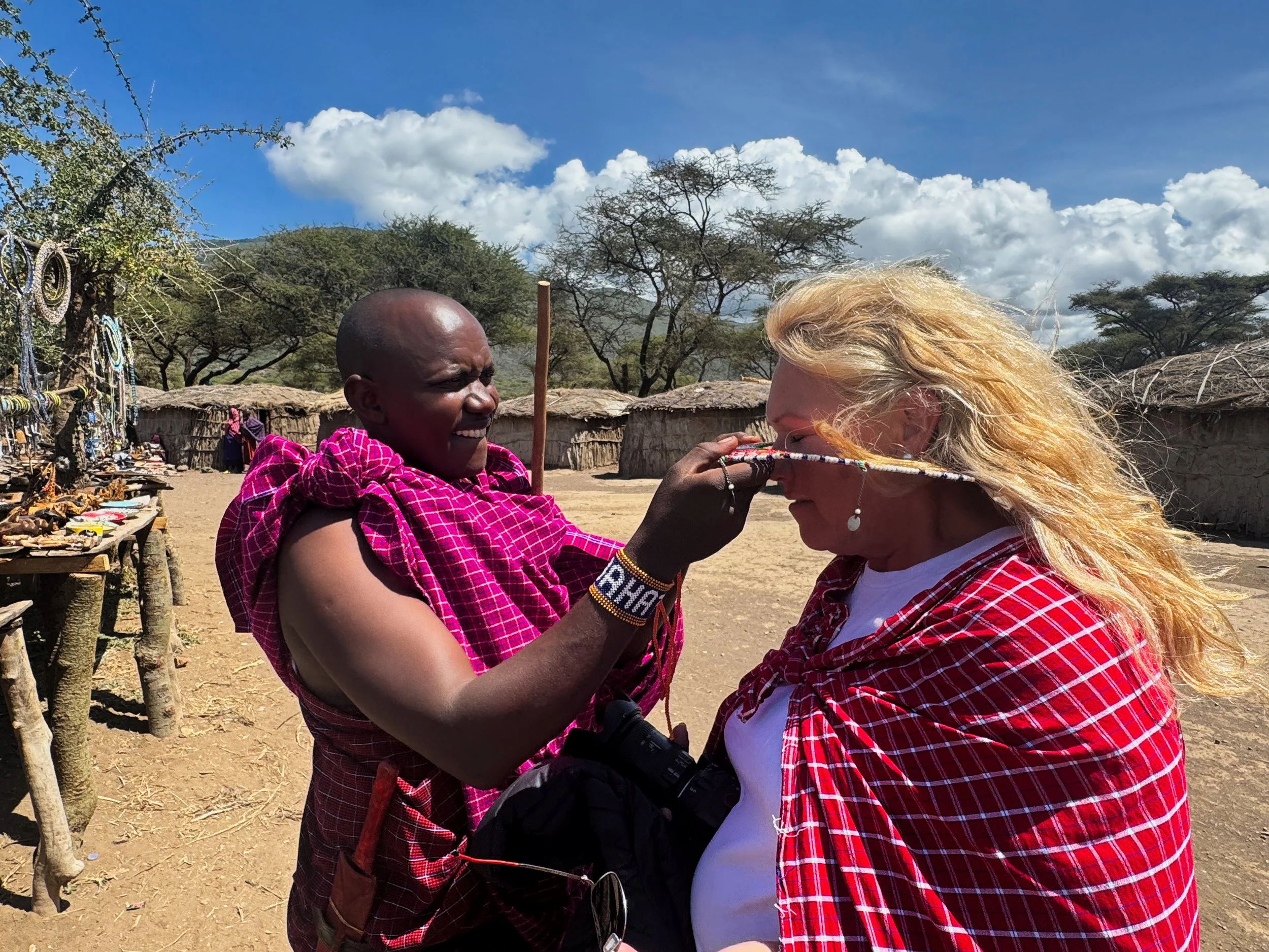 Masai villages are ringed by family huts that are in turn ringed by an outer fence aligned to the direction of prevailing winds. From across the plains eddies whip up dirt and debris and after hundreds of years these villages have been oriented based on these winds. As gold card carrying, pre-paid members of the elite Masai society, Fatpap and Lyndall were singled out, appropriately adorned in native colours and personally escorted by the tribal leader into his home to hear the history, and way of life of the villagers and their onward struggles to survive.