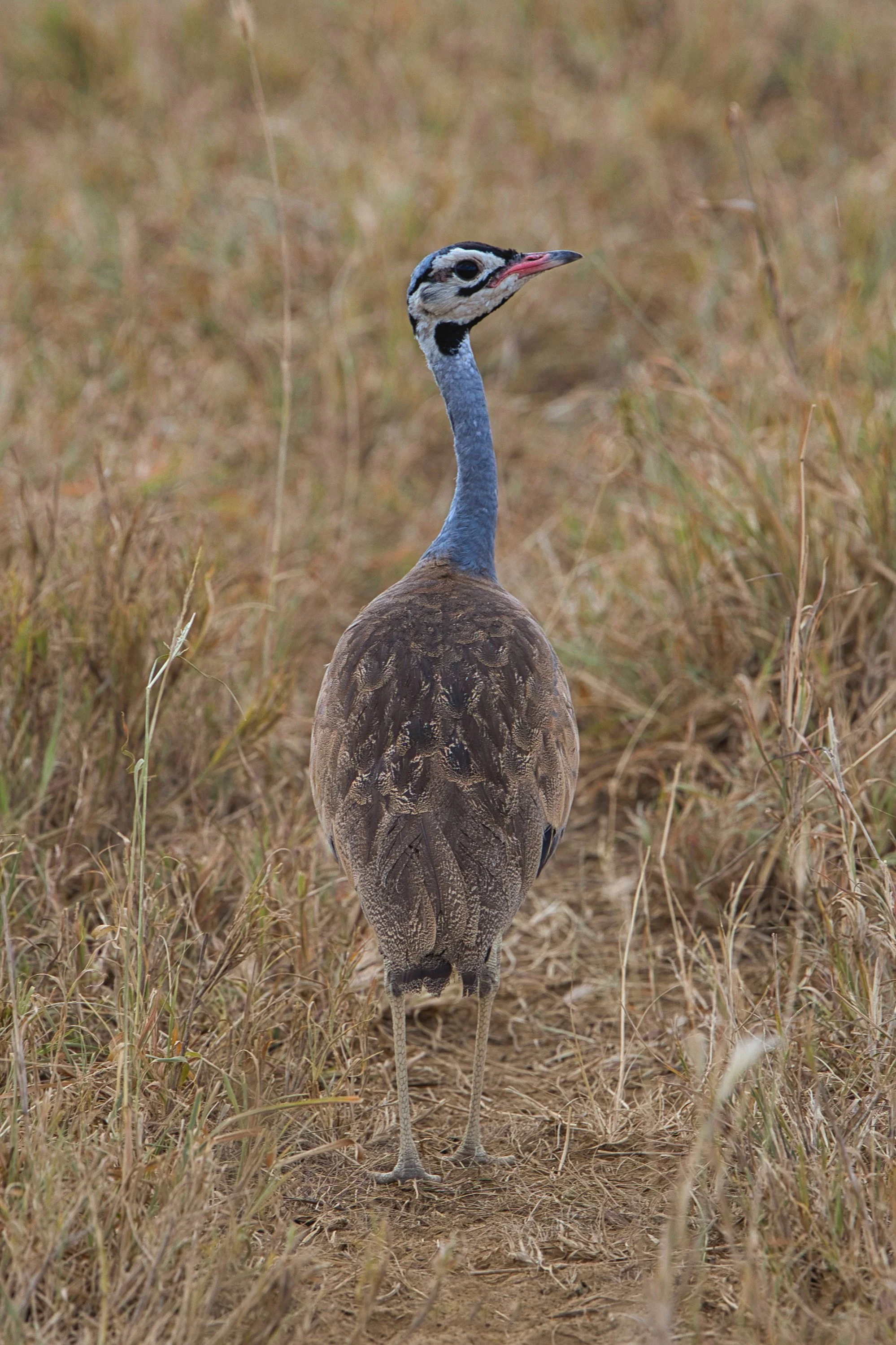 Possessing large eyes 50 mm across and long eyelashes, the Masai Ostrich have exceptional vision despite their relatively small heads compared to their body. The skin on the neck and thighs of the male Masai is bare and pink in colour, which intensifies to an almost reddish hue during mating season which we suspect was the case during this ménage à trois. Their large size prevents the capability of flight but this is compensated by their exceptionally long and muscular legs allowing for maximum running speeds of up to 70 km/h.