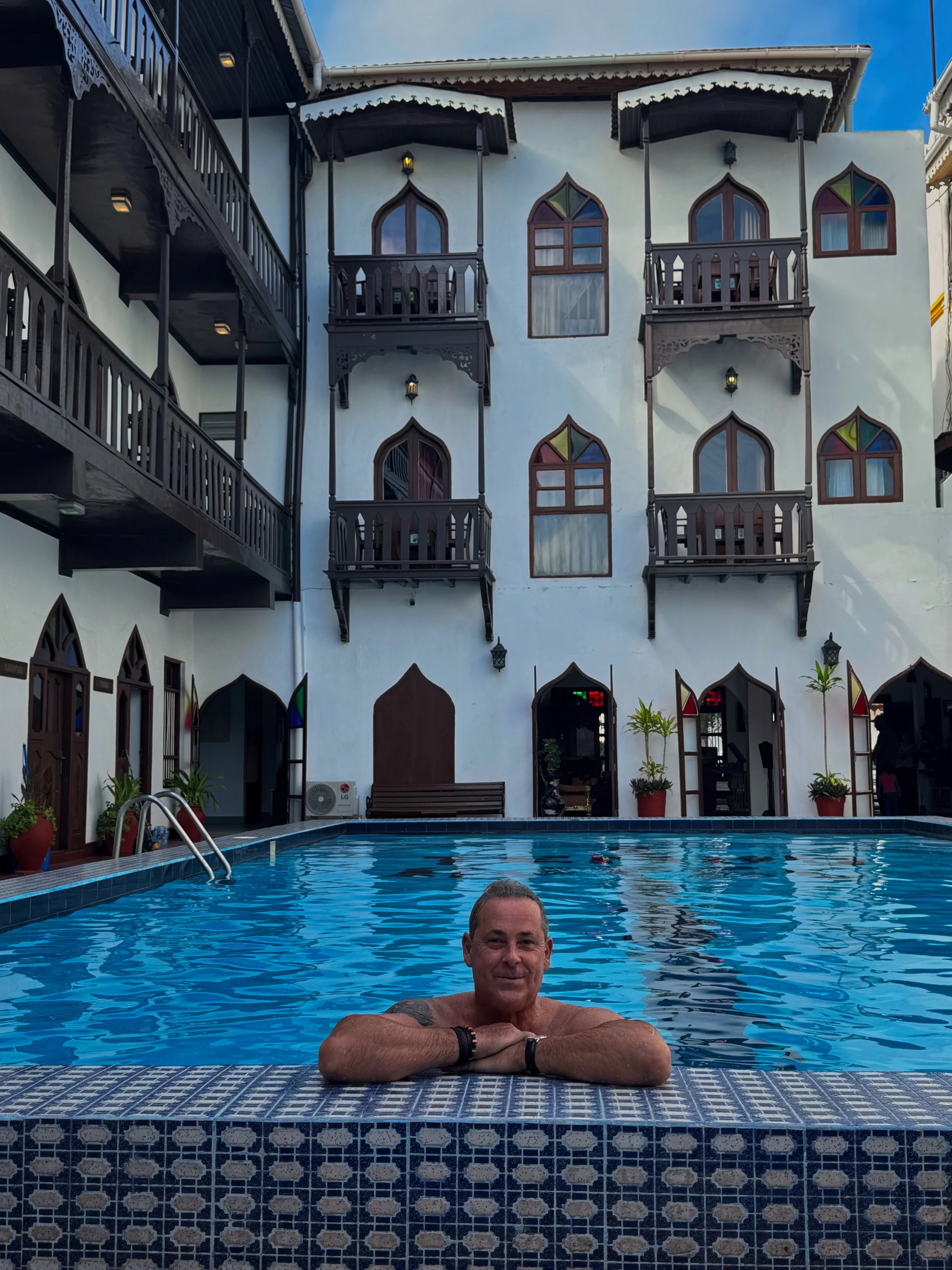 Found online during the planning stage, this hotel leapt from the pages almost beckoning us to book a room so thats exactly what we did. The Tembo was the first beachfront hotel in Stone Town and converted from the original Tembo House built in 1834 and one of the first stone buildings in Stone Town. It has a history of varied use over its life including the American Consulate from 1834 to 1884 then the trading offices of Cowasjee Dinshaw & Partners, the largest trading company in the Indian Ocean. The building's name, Tembo, is derived from the Swahili word for elephant and has been host to notable guests including Mahatma Gandhi, Indira Gandhi, and Freddie Mercury while their offical website has recently been updated to include Fatpap and The Wine Wench among those illustrious figures.