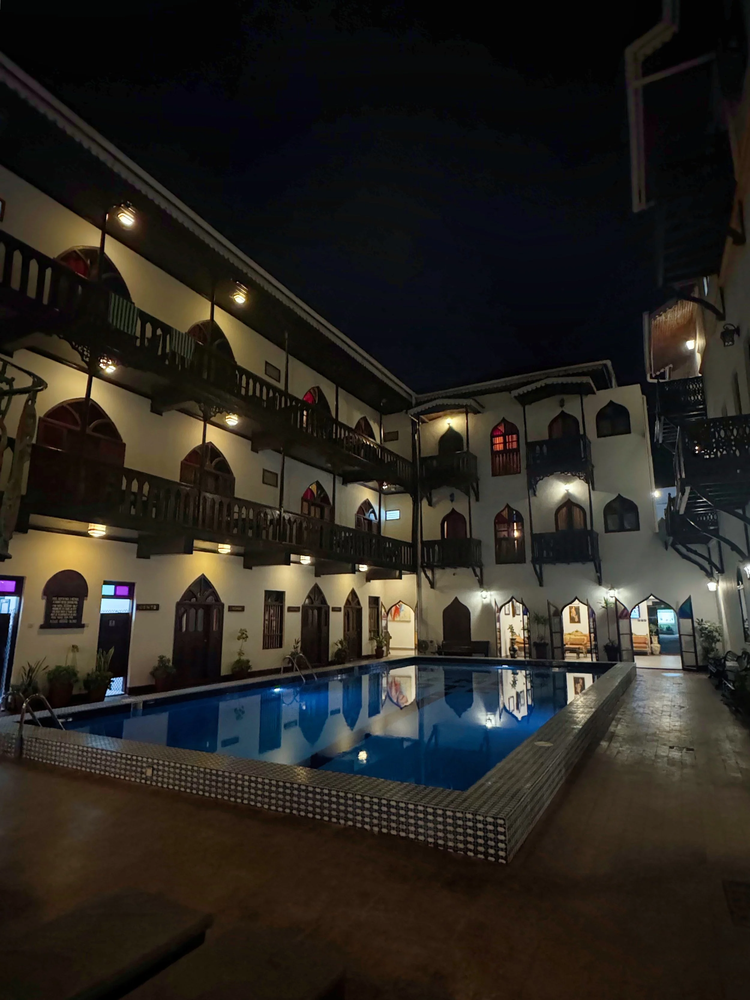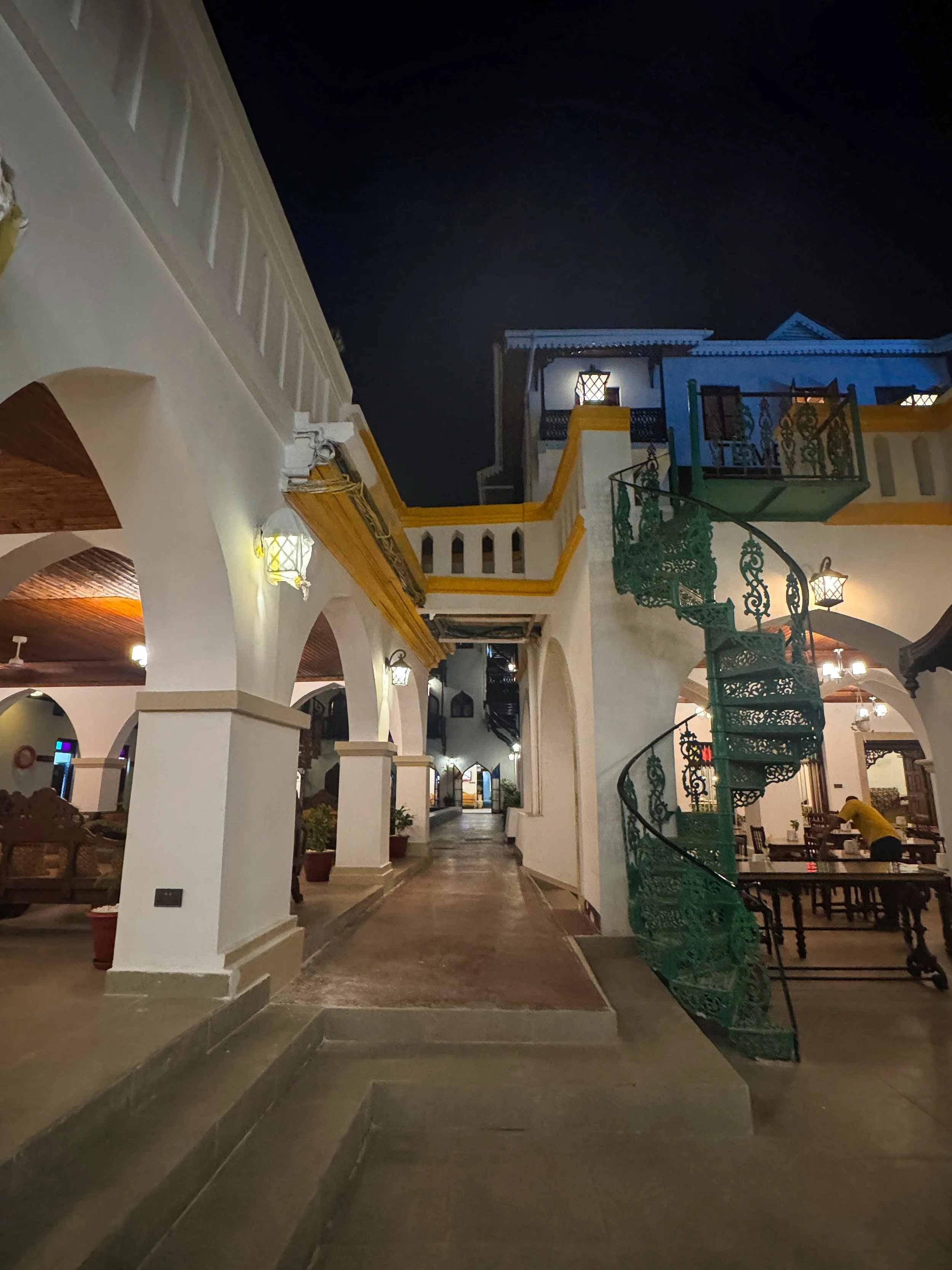 We were shown to our second floor room which like the hotel itself was a unique blend of Swahili and colonial architectural styles featuring antique furniture, four-poster beds and mosquito nets together with our own balcony looking straight across the beach and over the Indian Ocean. The place was absolutely beautiful and everything the reviews promised it would be. As a synthesis of Swahili, Arab, and European influences, the structure was organised around a central Arabian-style courtyard with curved arches framing open doorways and windows with stained glass panels casting colourful, evocative light throughout its interior. We didn’t want to leave but as you’ll learn were forced to.