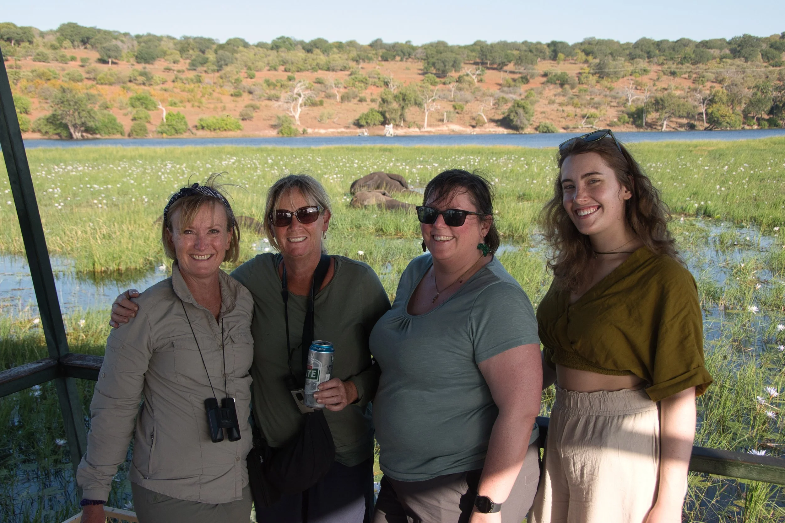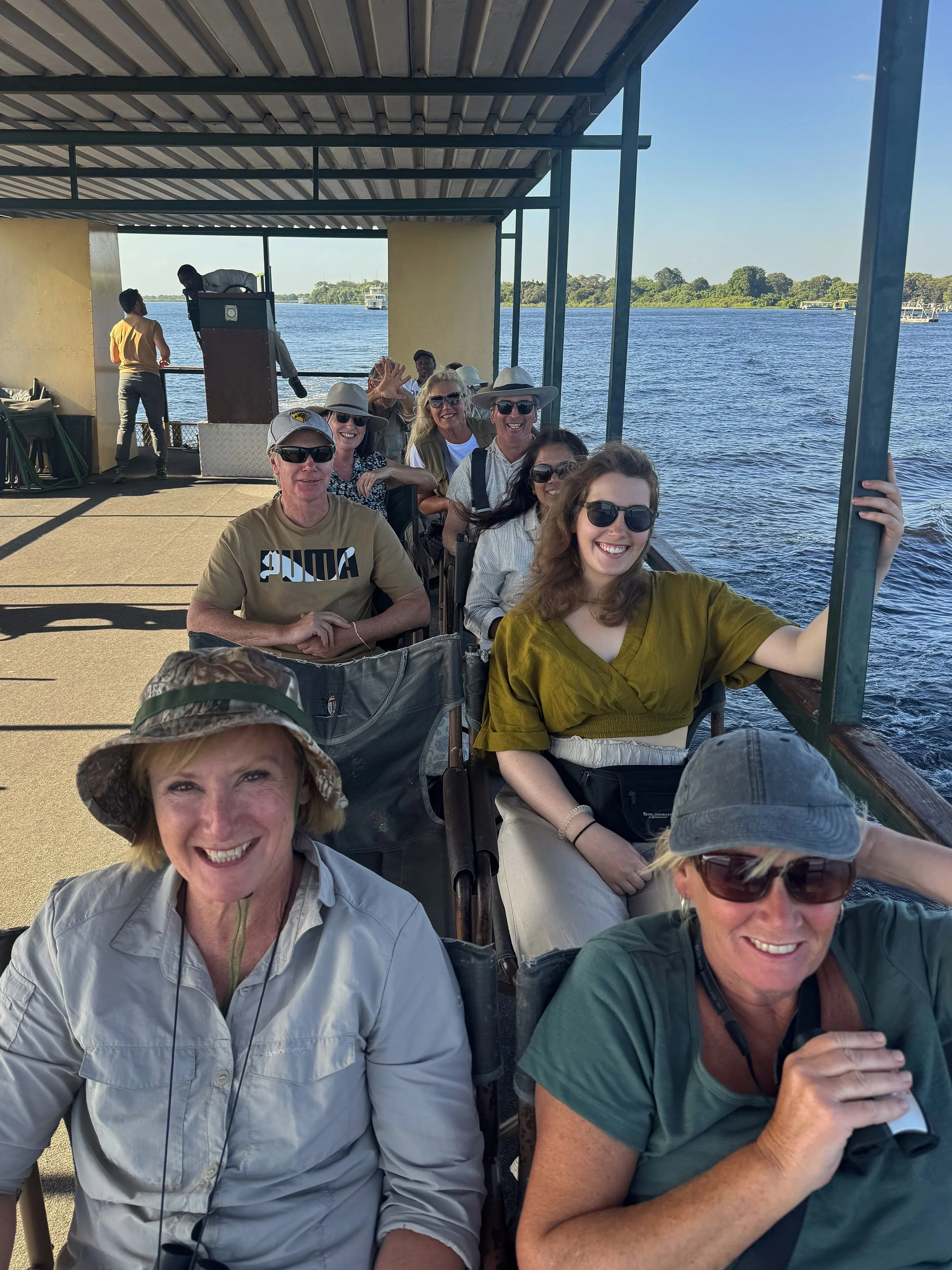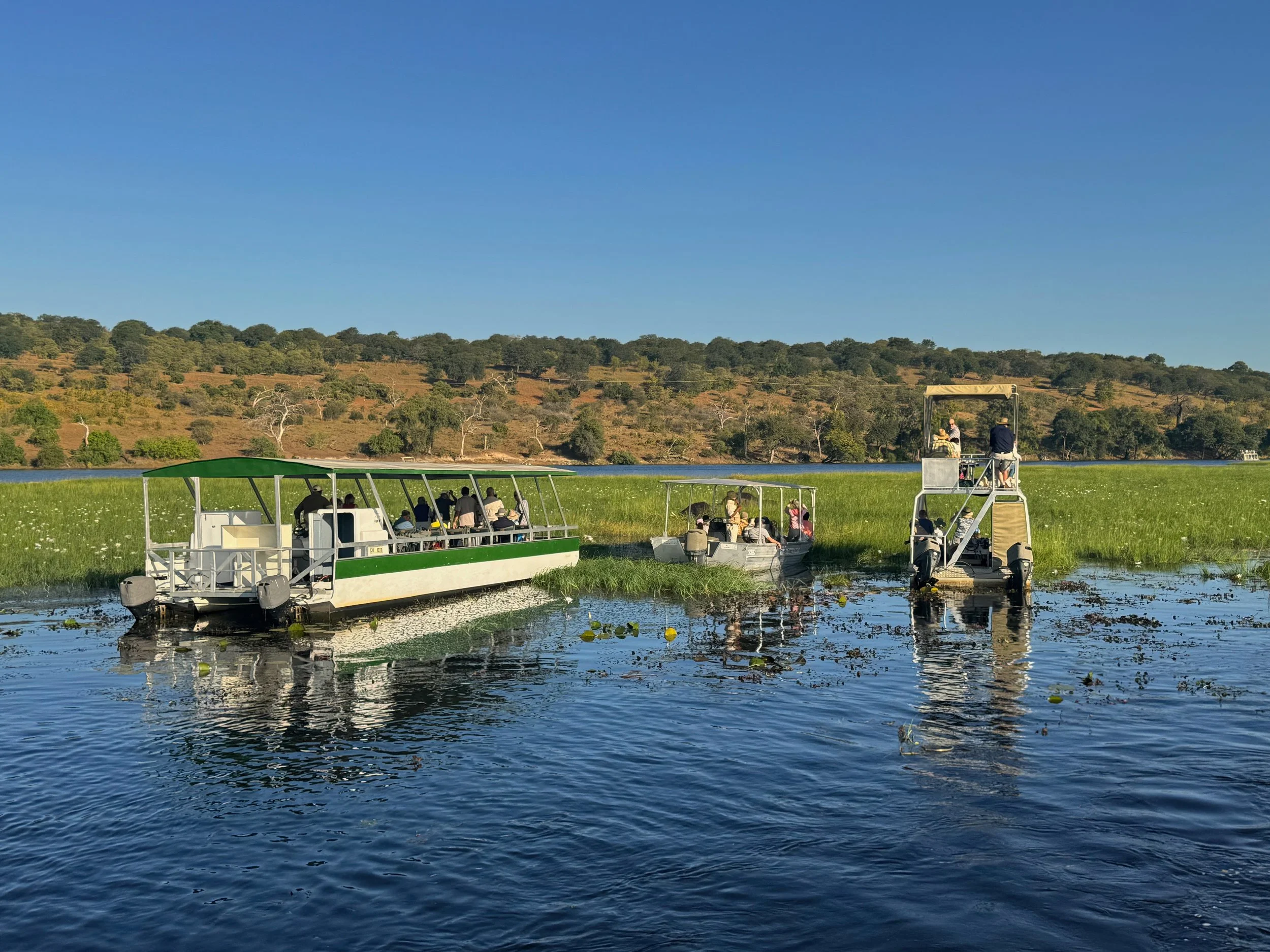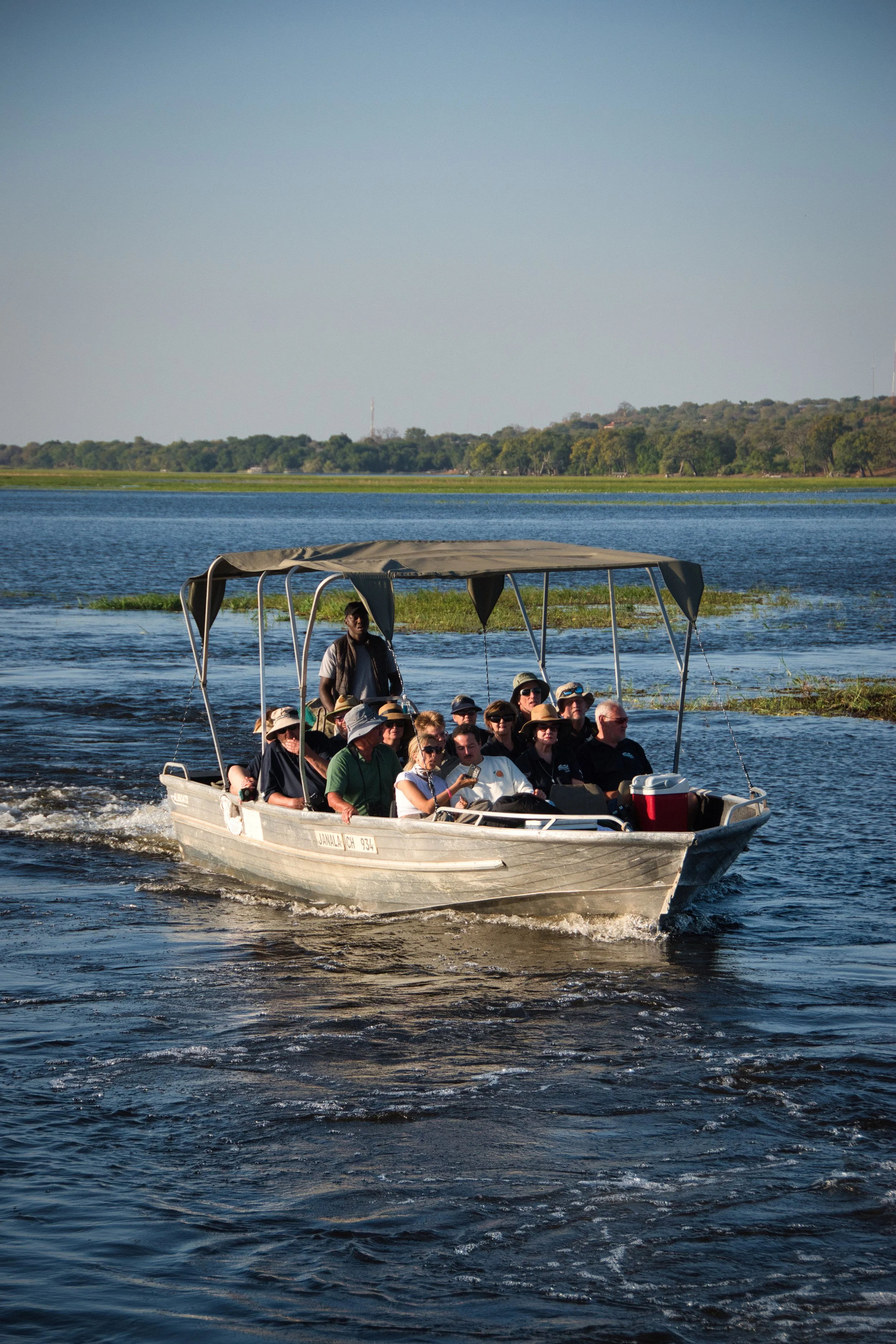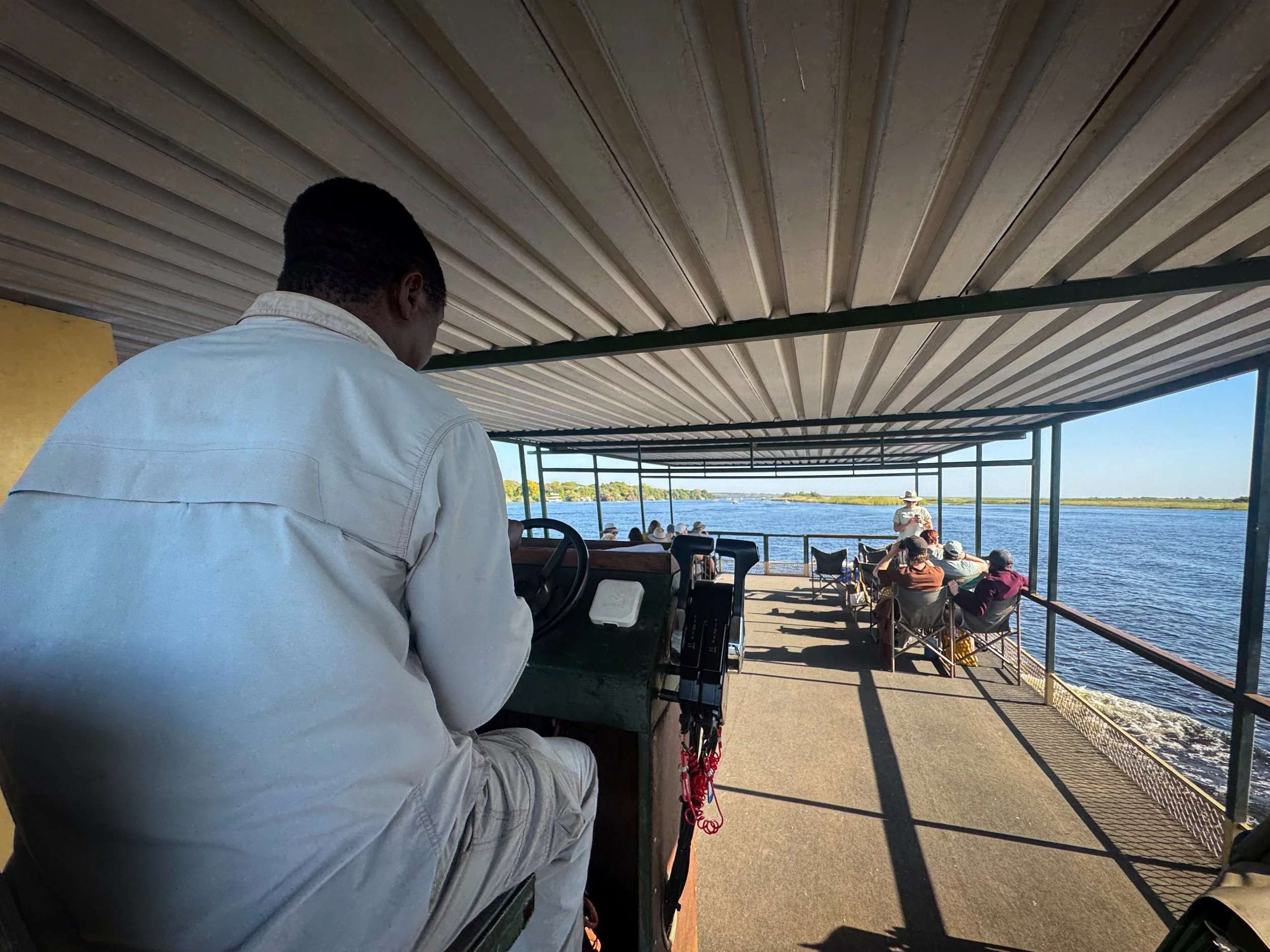 As was now our custom, transport arrived to take us down to the river where we boarded a registrable, if not motley looking punt for our planned river cruise. Having safely loaded the esky and appropriately arranged the deck chairs, we pushed back from the dock with the outboard donks churring up the murky water beneath. Quickly ripping the lids from our chosen drinks we began the westward journey upstream splitting the Chobe River with Botswana to our left and Namibia to our right. Only 4 kilometres downstream at the confluence of the Zambezi and Chobe Rivers was the "African Four Corners" where the borders of Zambia, Zimbabwe, Botswana, and Namibia all meet creating the only international quadripoint in the world.