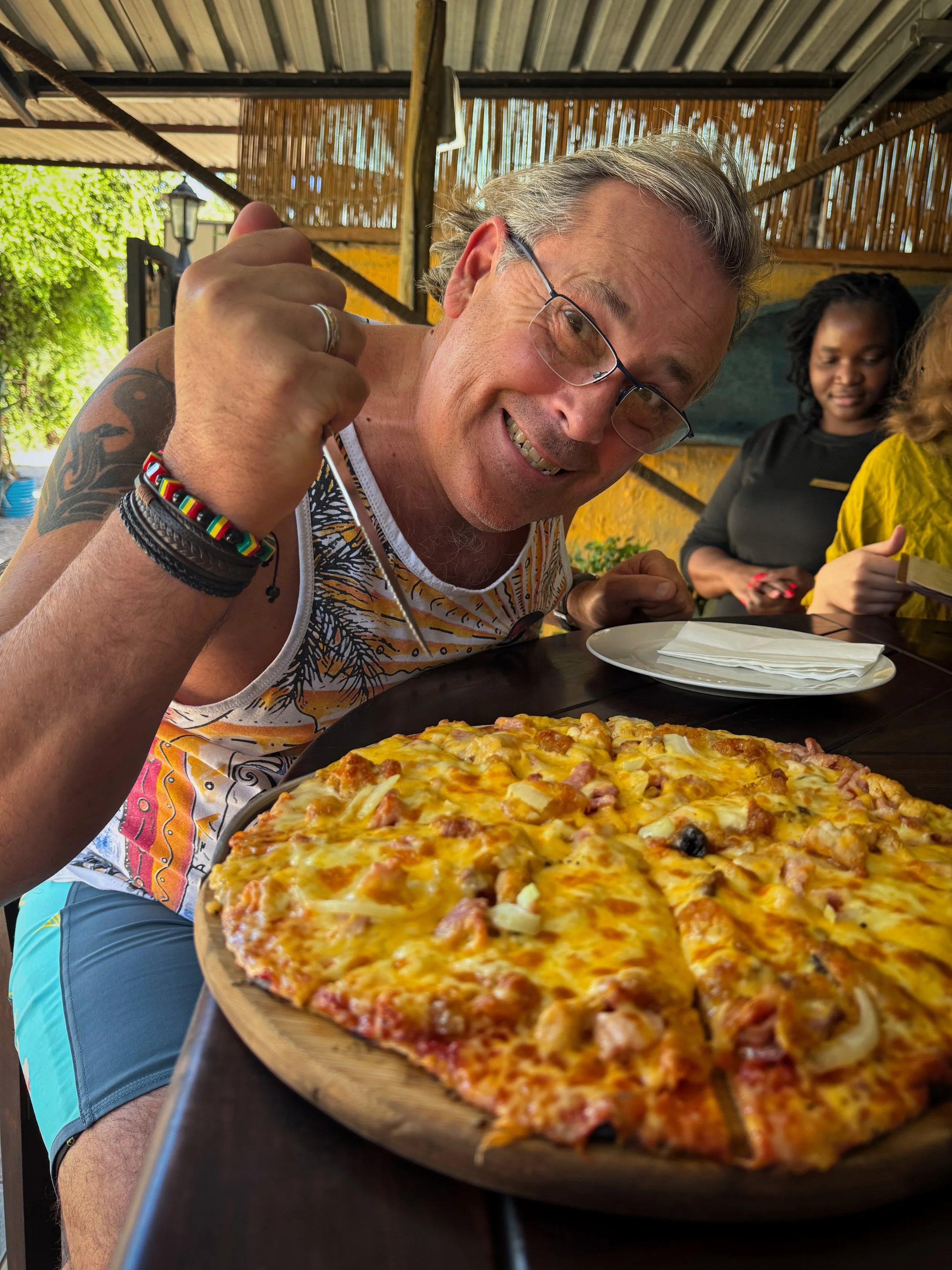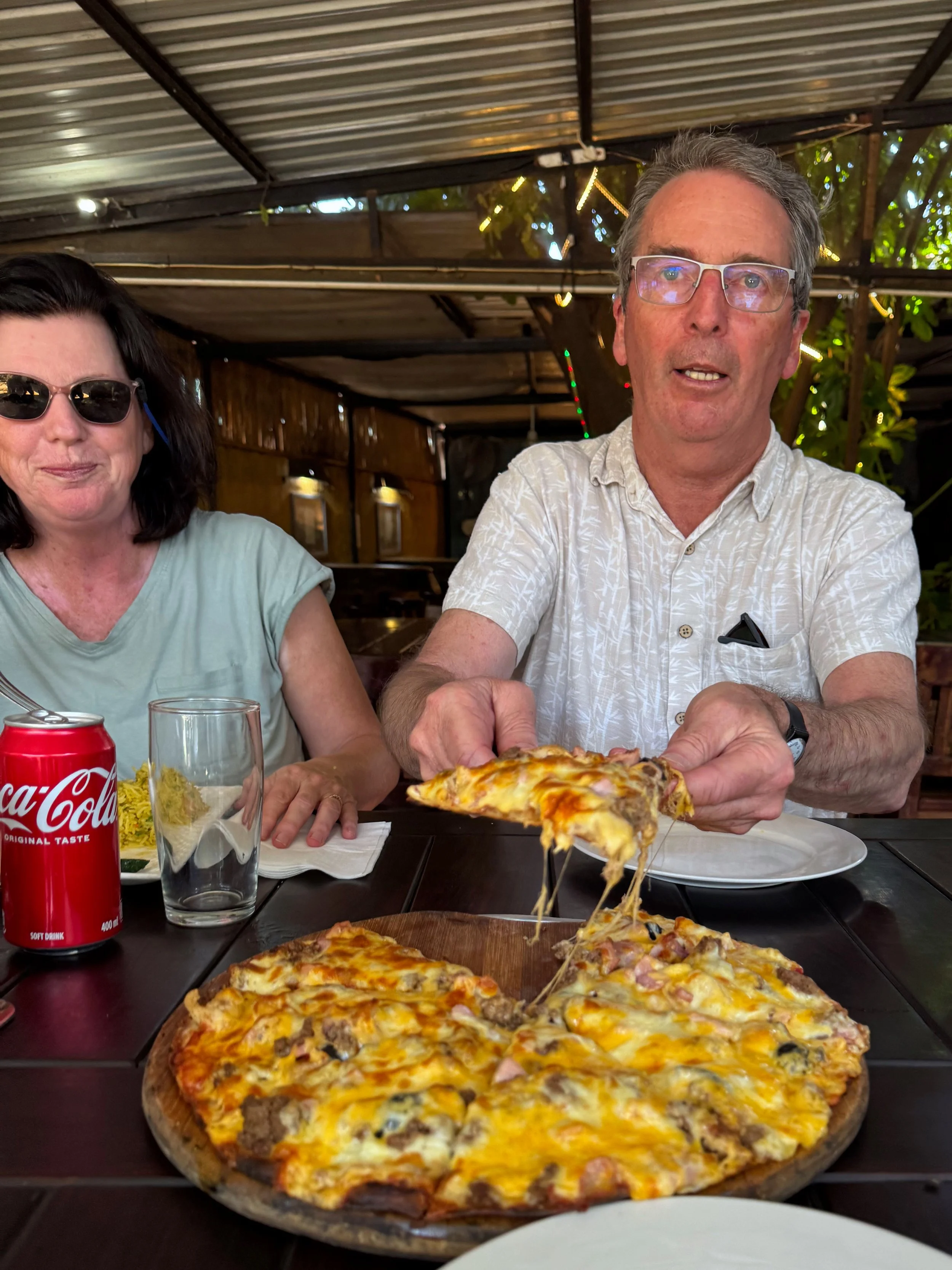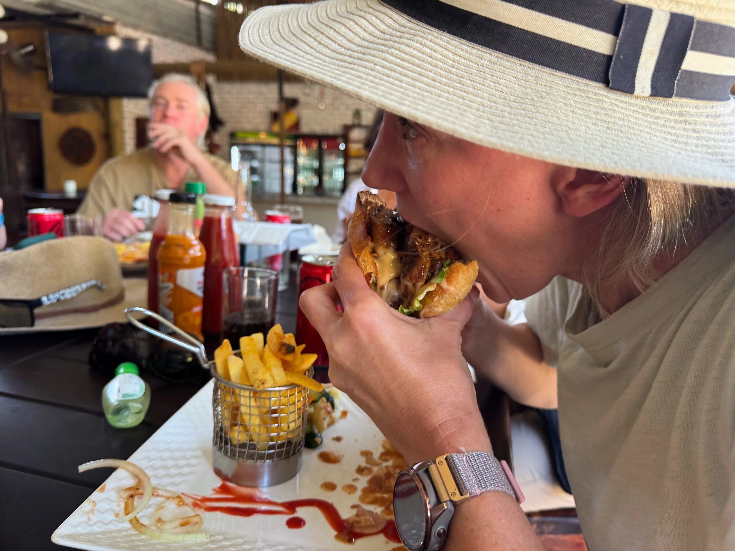 We arrived into the township of Kasane right around midday and got the safarists out of camp on time while we put their tents up for them. With everything established the way we liked it, we checked out the pool, which like a 12 year marriage had clearly been neglected of late, so it was lunch at Thebe Restaurant, the onsite eatery at our digs, the Thebe River Safari Lodge. Some good old fashioned greasy burgers were available which as evidenced below, Ricki added to her collection inhaled thus far on tour while Antony and Fatpap split a simply brilliant crocodile pizza. A few drinks under the very warm sun made for a perfect afternoon before the big show later in the day.