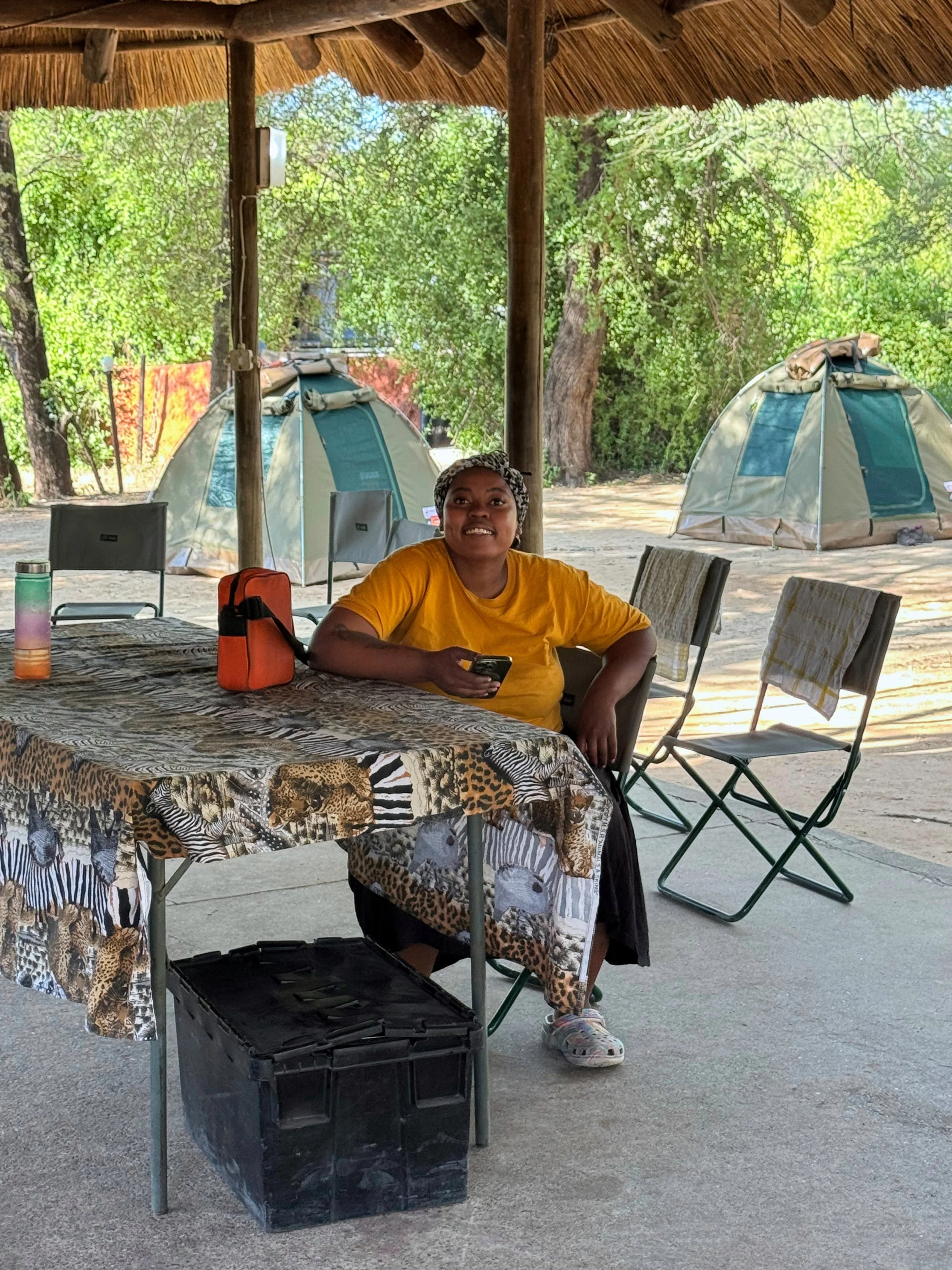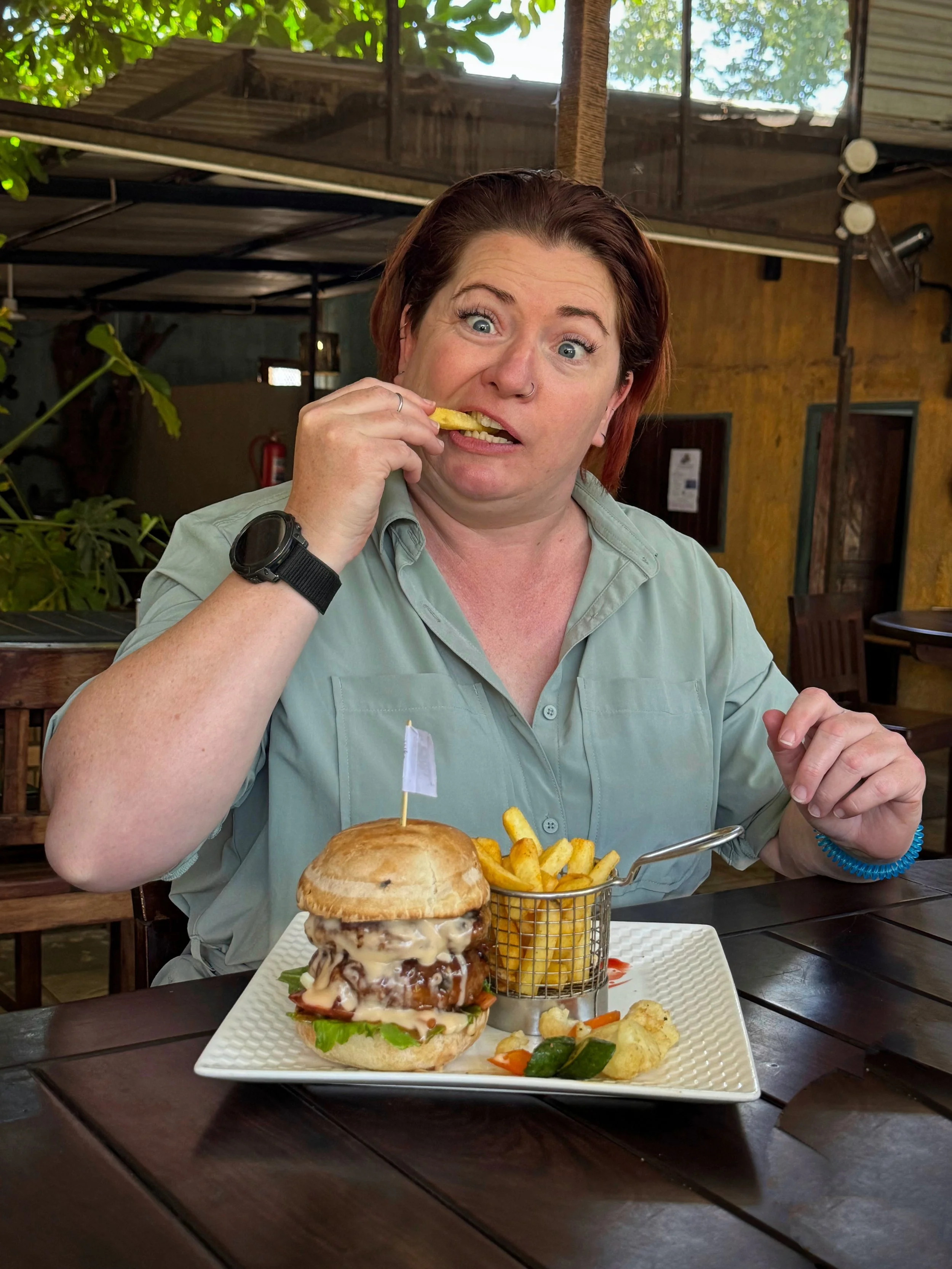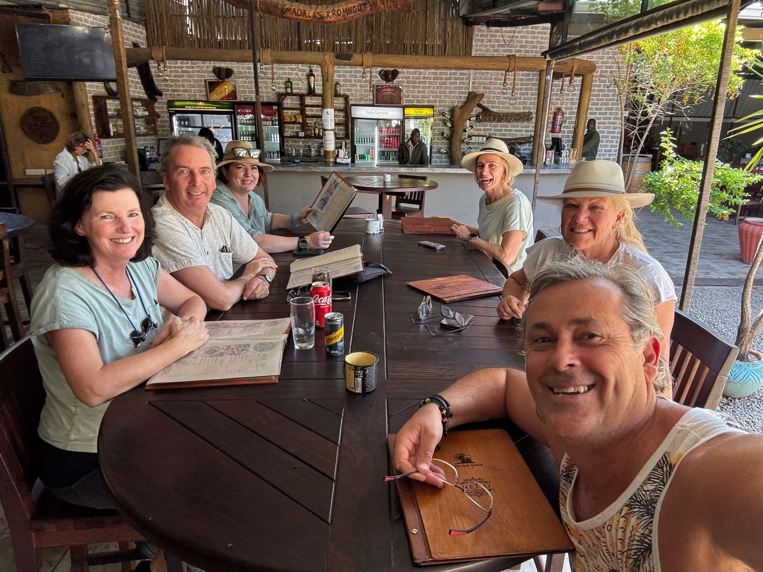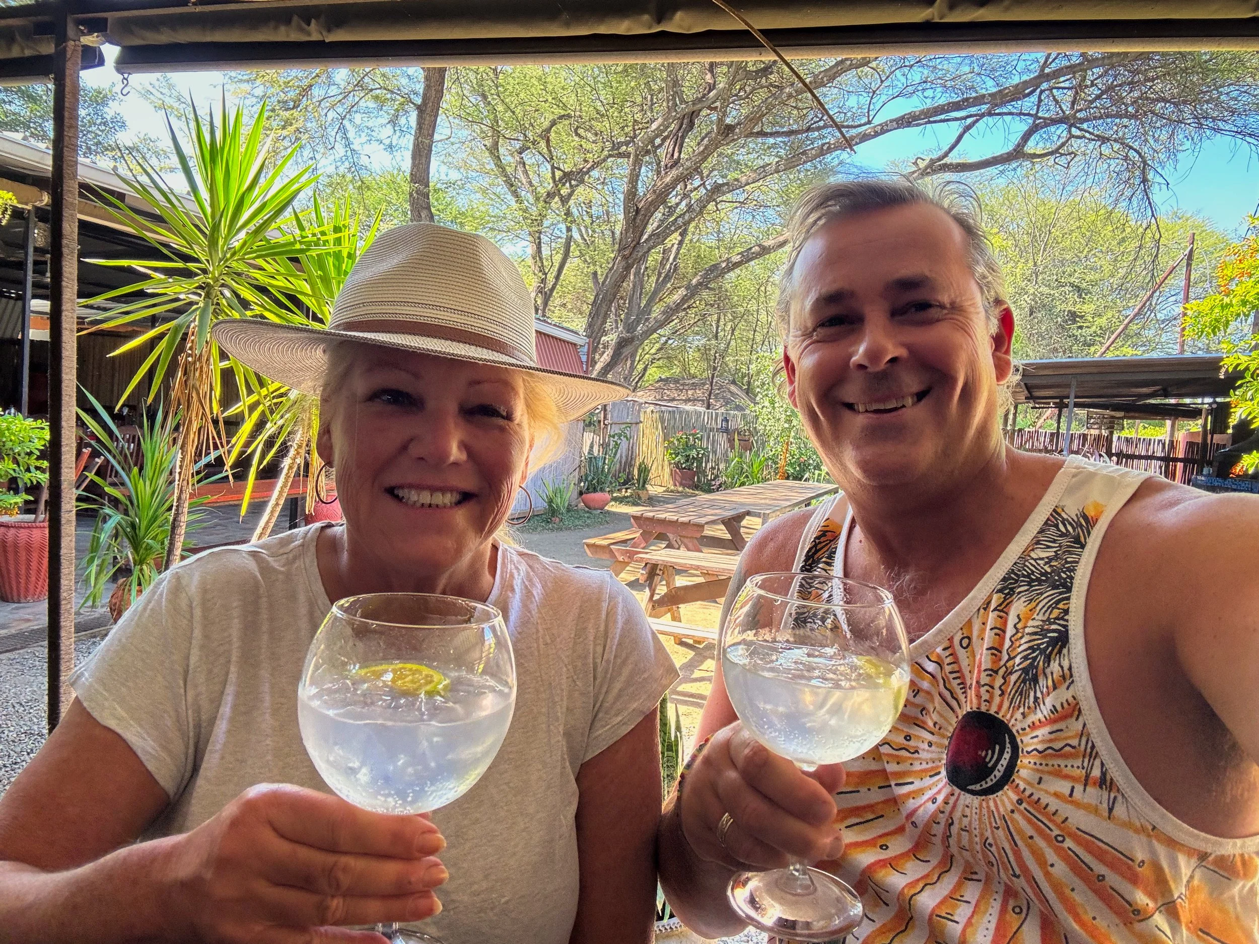 We arrived into the township of Kasane right around midday and got the safarists out of camp on time while we put their tents up for them. With everything established the way we liked it, we checked out the pool, which like a 12 year marriage had clearly been neglected of late, so it was lunch at Thebe Restaurant, the onsite eatery at our digs, the Thebe River Safari Lodge. Some good old fashioned greasy burgers were available which as evidenced below, Ricki added to her collection inhaled thus far on tour while Antony and Fatpap split a simply brilliant crocodile pizza. A few drinks under the very warm sun made for a perfect afternoon before the big show later in the day.