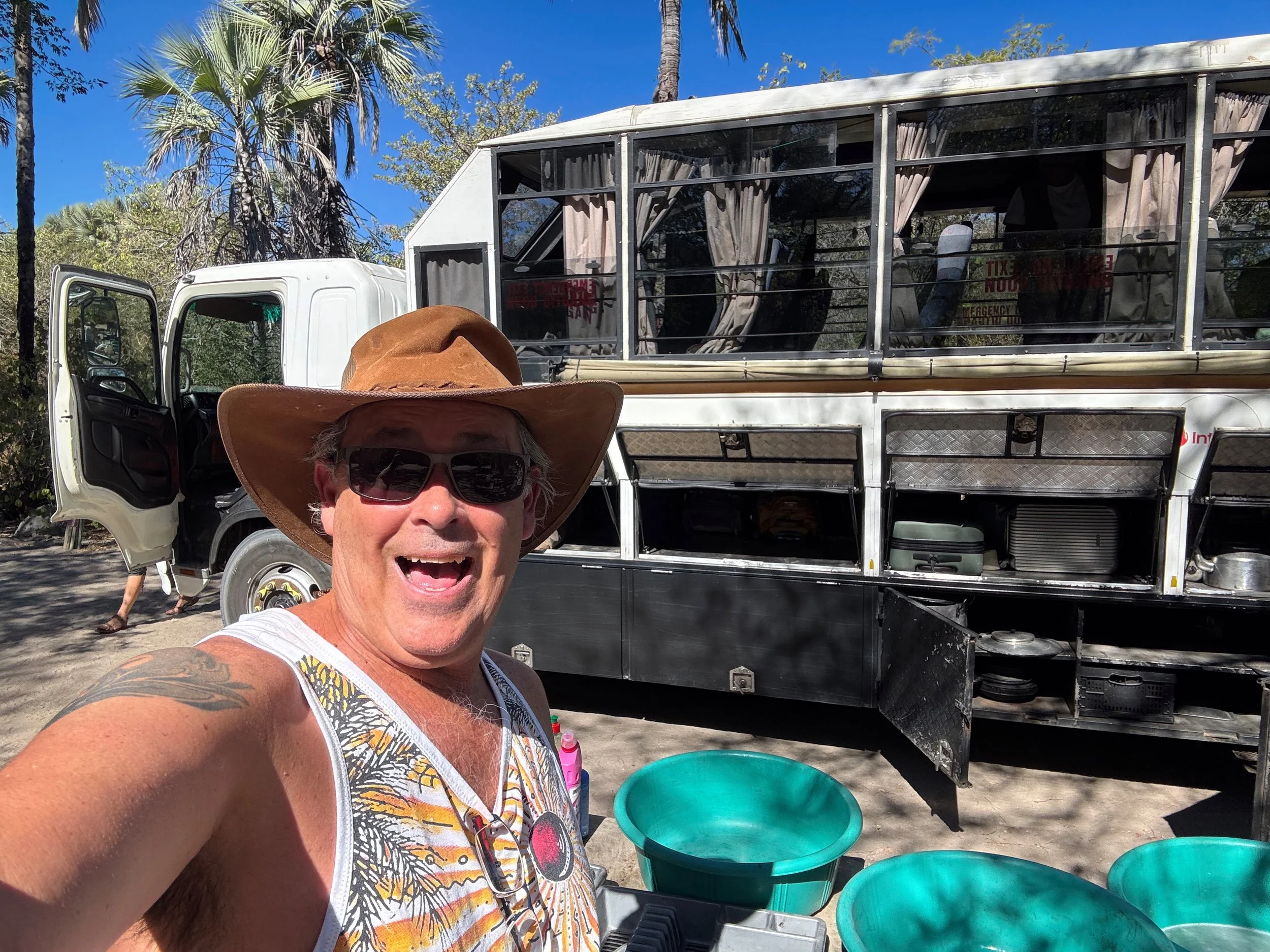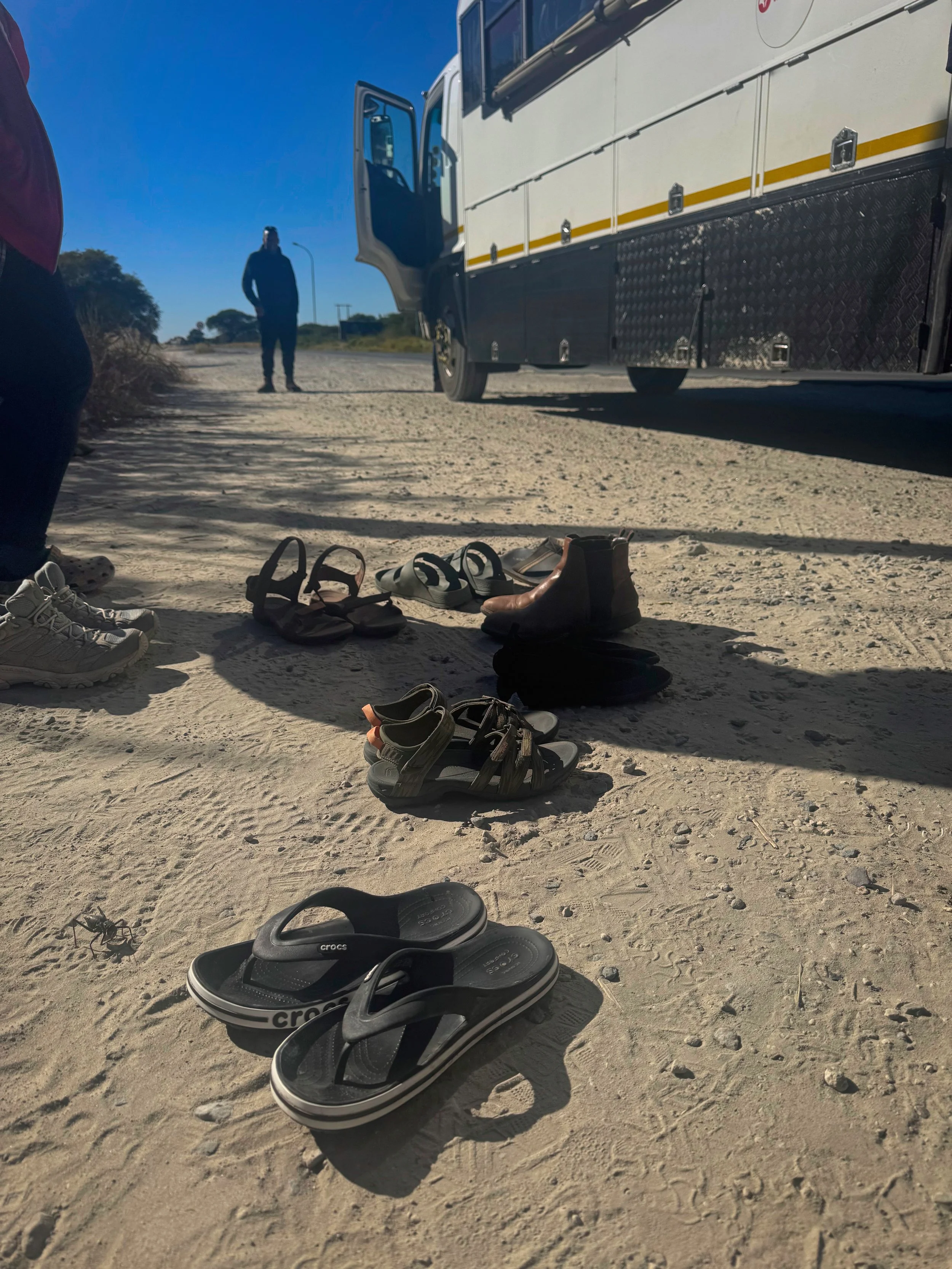 Packed up we headed off to Nata, a small village in Botswana's central district with a population approaching 8,000. Its biggest claim to fame is being home to the Nata Bird Sanctuary and our primary reason for visiting. At a distance of 300km, or about 5 hrs away, we were granted a lazy start which meant a full breakfast, a full shower, and full daylight when packing away the tents. It was a cruisy run compared to our first 2 days with the only formality going through a disinfectant dip station, one of many throughout Botswana, used to mitigate the spread of foot and mouth disease. Mr B guided the Wilderbus through a shallow trough covering the tyres but we were required to disembark and walk through a smaller version wearing our shoes. However, the Botwasnan government know full well no visitor travels with only one pair of shoes and Richard was adamant on our departure that we have our second pair unpacked and readily on hand to save any delay.