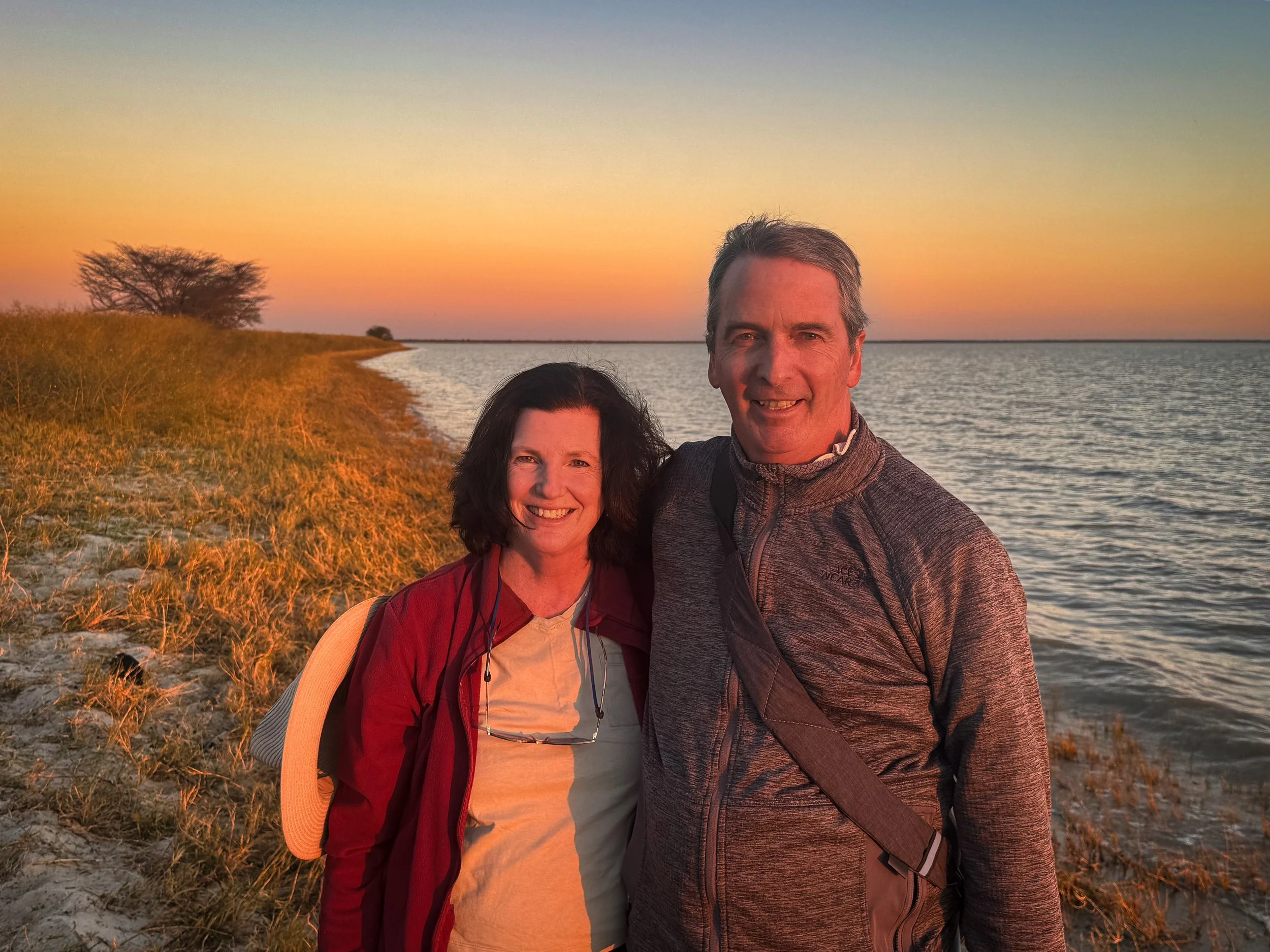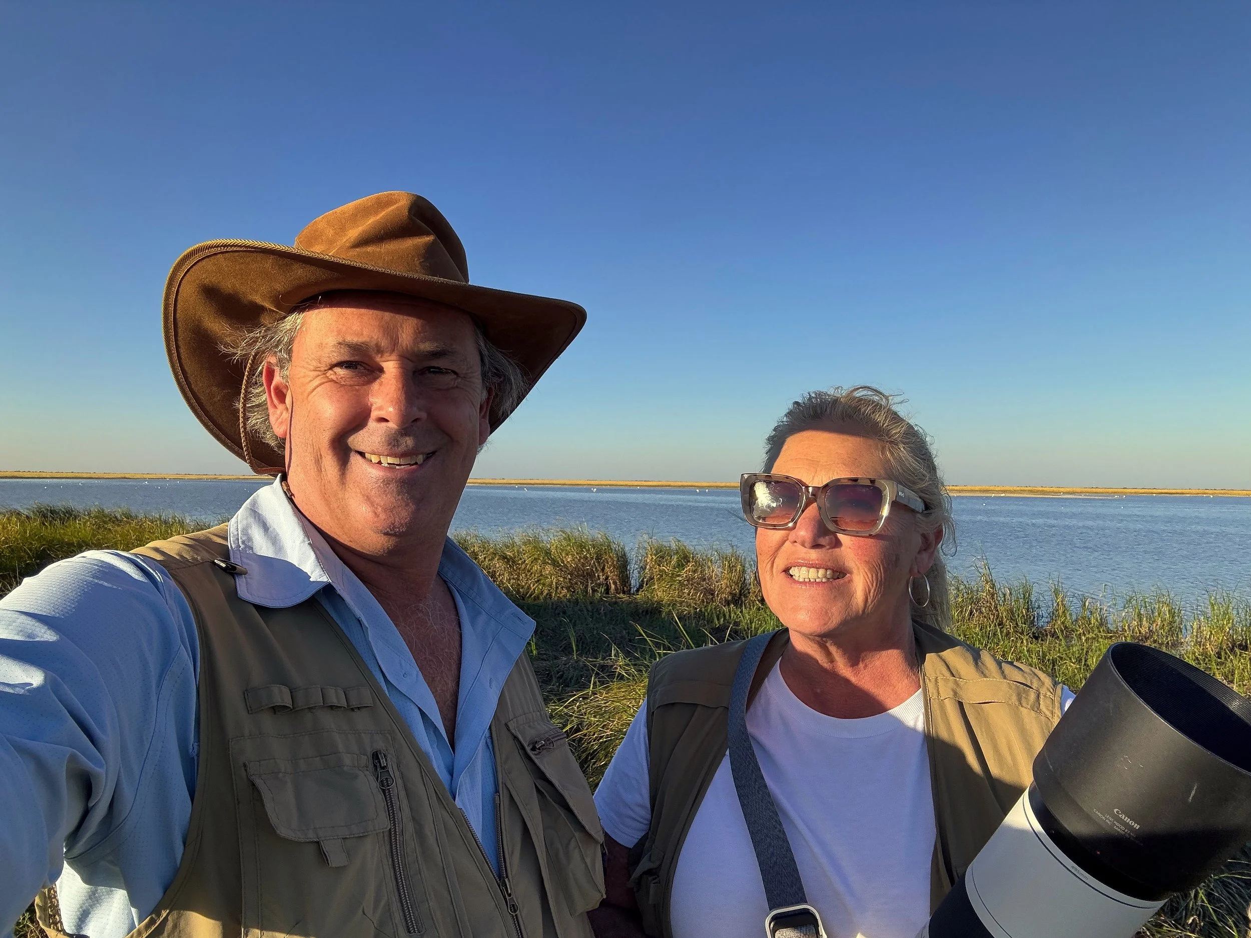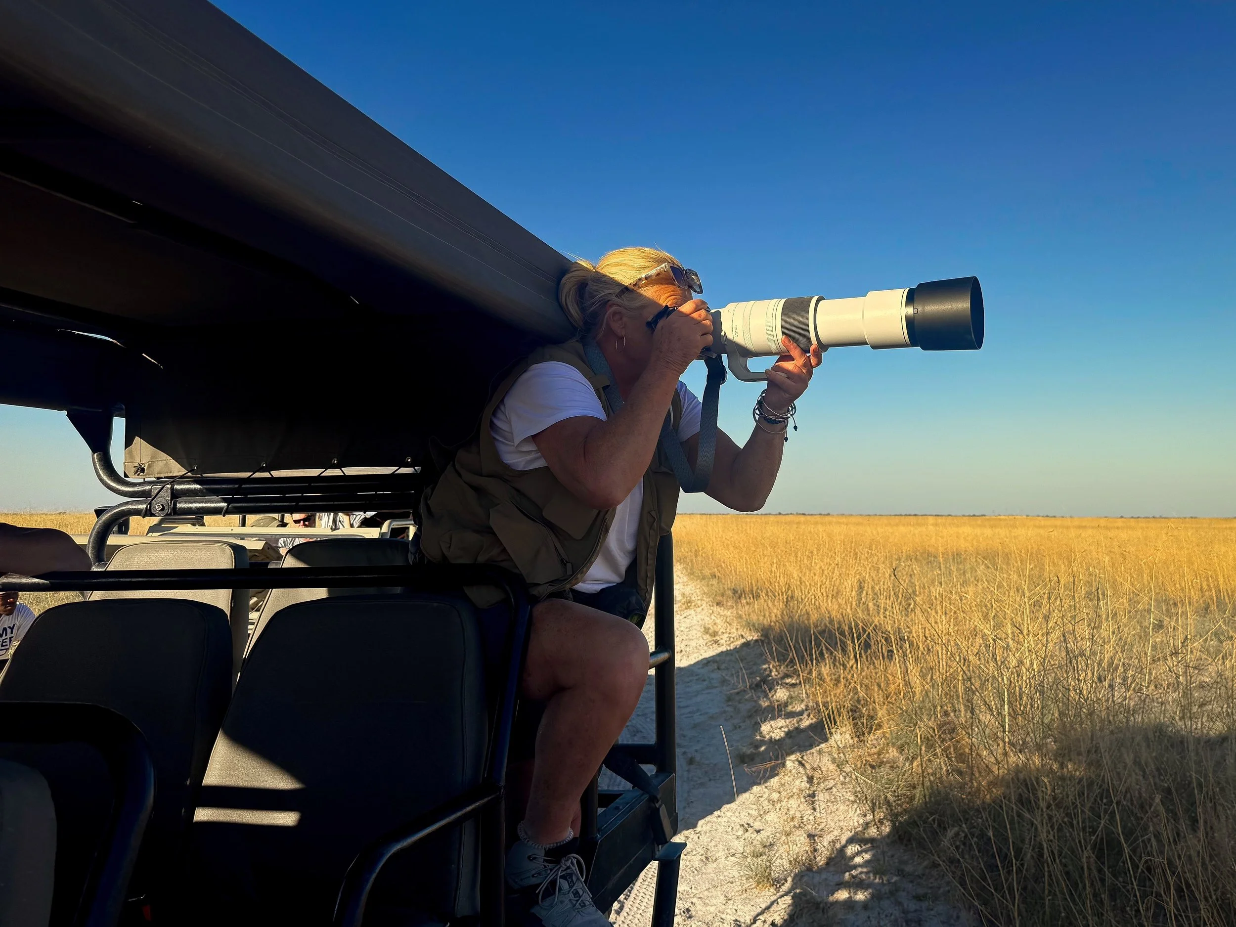 On entering the sanctuary it was singularly flat and barren with grasses being the dominant vegetation among clumps of shrubs and tress. Sticking only to the tracks we witnessed zebra, wildebeest, ostrich and just a few of the 165 bird species on offer. Driving though to the lakes edge, we covered the last 100 metre on foot for an up close and personal date with the hundreds on flamingoes feeding on the brine shrimps, worms, and tiny crustaceans plentiful in the warm shallow waters. Lyndall was of course in conservationist heaven, the flamingo being high on her African species list after missing them in Argentina, and on the shores of the Sua Pan she stood perched among the rushes putting her new Moon Bazooka to good use. Knowing her for forty years, Fatpap is pretty sure he’s never seen her happier.