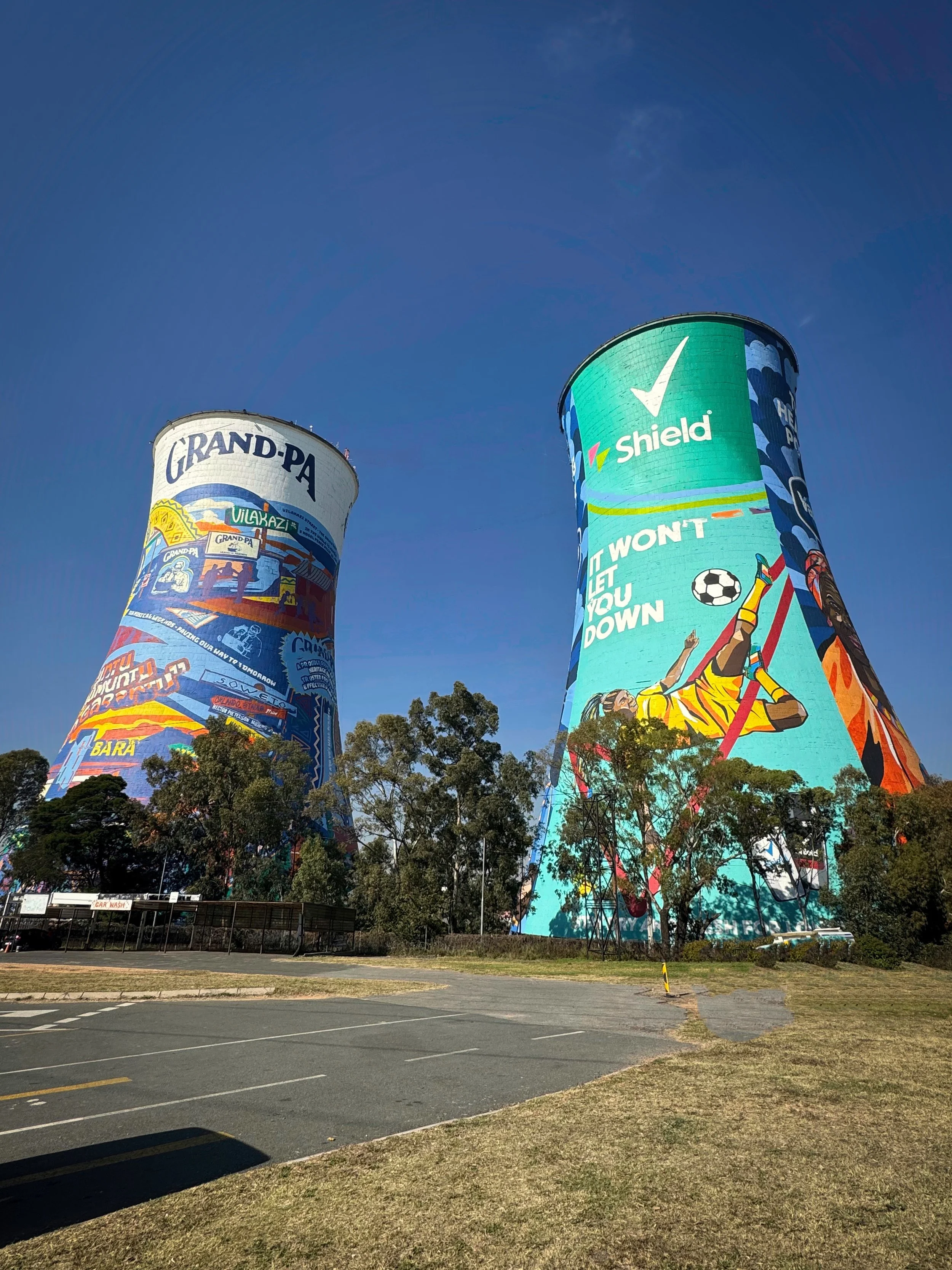 The station was decommissioned in 1998 after 56 years of service and in 2006 work began on transforming the site into an entertainment and business centre. The two cooling towers are now a prominent landmark in Soweto and can be seen from most vantage points throughout the township. Both are painted, one as an advertising billboard the other displaying the largest mural painting in South Africa and both are joined by a gangway used for bungee and BASE jumping. While the Orlando Towers will never remotely compare to the one leaning in Pisa or that of Eiffel, there was something very special about these two disused concrete behemoths making them equally impressive in their own South African way.