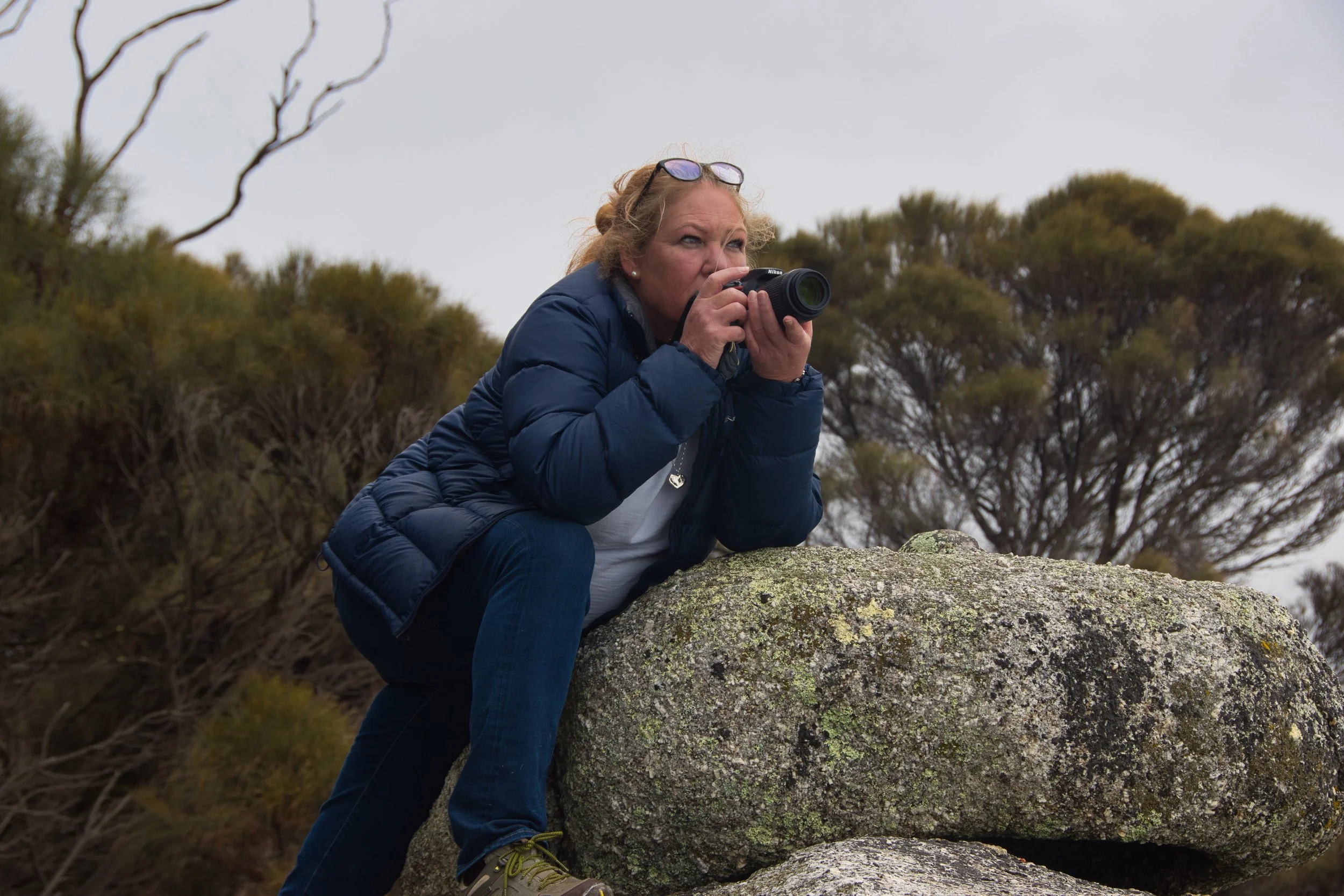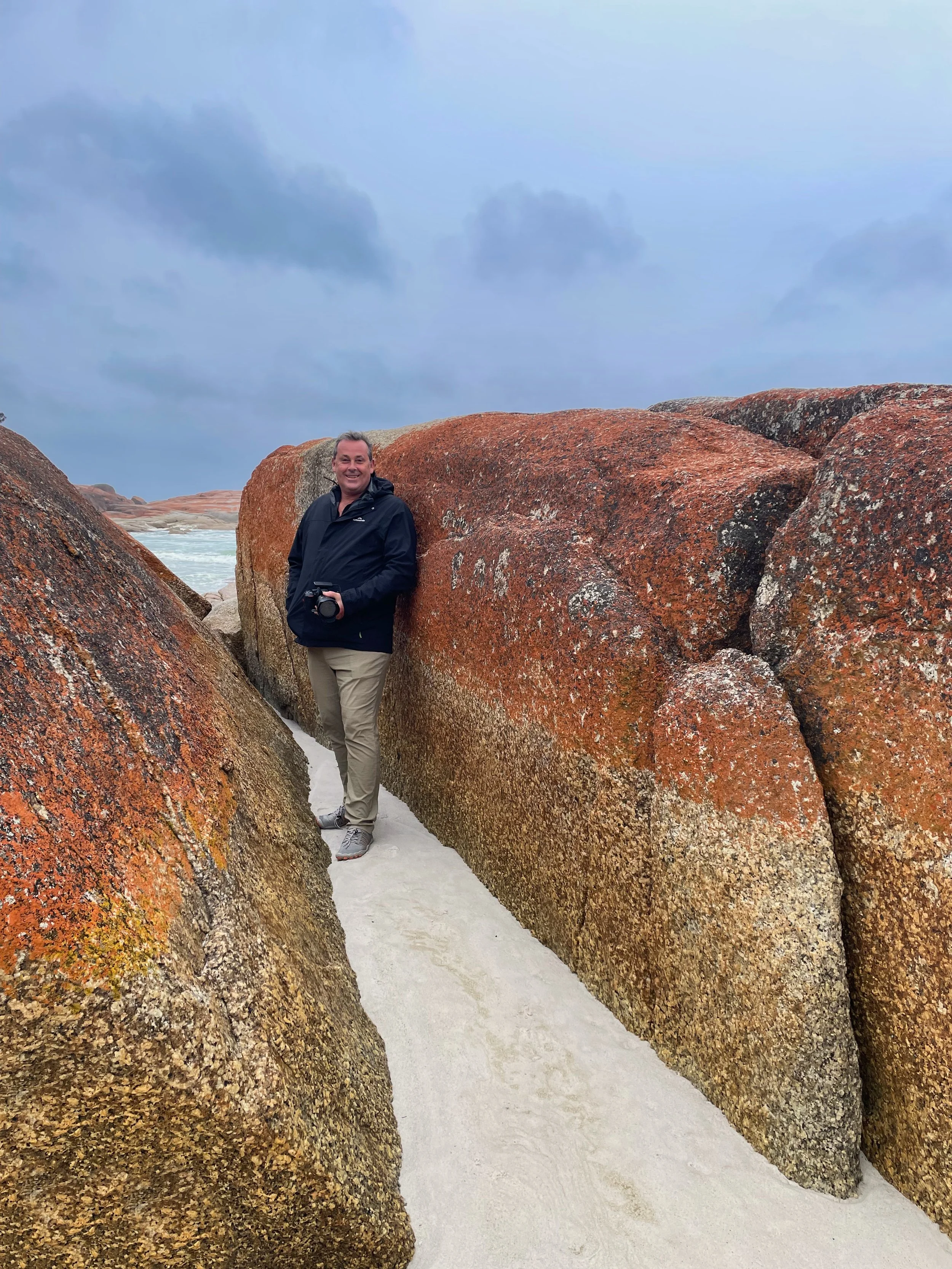 World renowned for its extraordinary clear blue seas and brilliant white beaches, we unfortunately didn’t see the bay at its best. The raging wind and swell did its darnedest to hide the turquoise waters, however the orange lichen-cloaked boulders were difficult to miss. Even without bright sunshine these iconic rock formations were a standout and feature heavily in our photographs of the session.