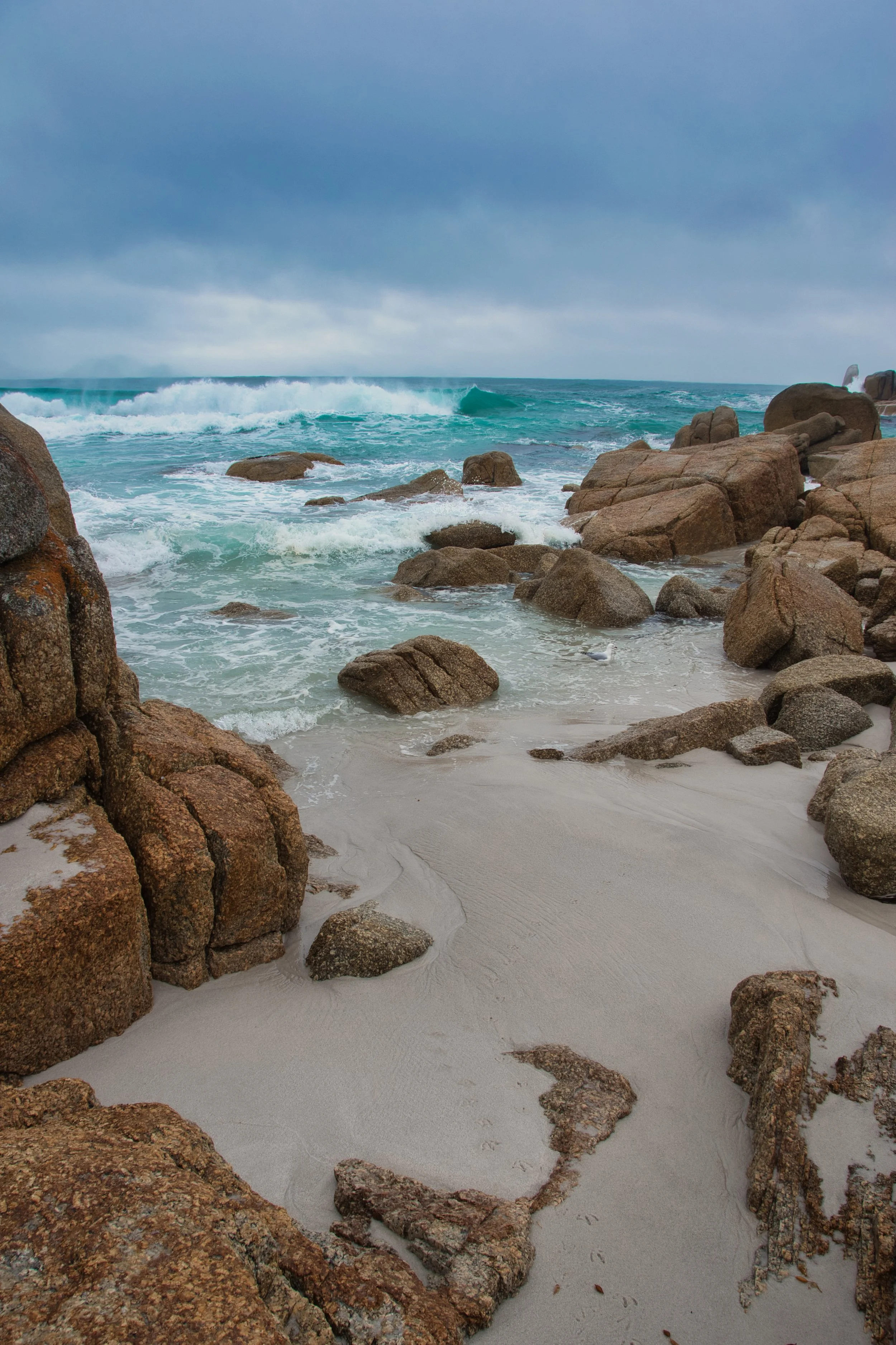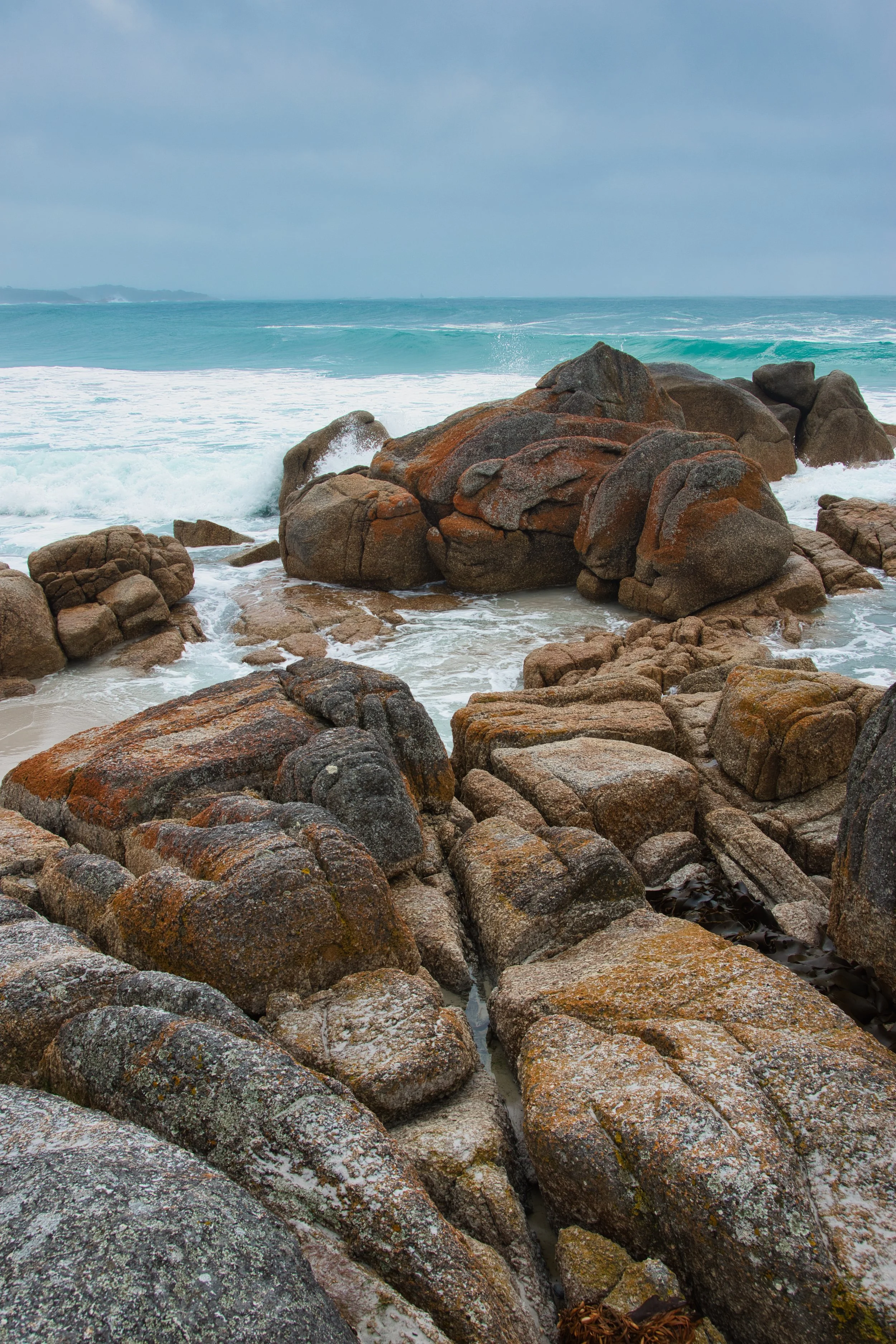 By late morning the weather looked nothing but worse, so we packed up, taking all of 4 minutes, and moved northward a whopping 5km to our next free camping location known as Cosy Corner South. Like most free camps, you only need to circle the grounds once to find your own slice of paradise. Ours was a hedge rowed nook sheltered from the winds but affording a full view of the beach only 5 metres away. Around lunch time the rain stopped but not the wind. We grabbed our cameras and set off to explore the snow white sands, rusty lichen stained rocks and turquoise waters of the Bay of Fires. Despite the wind and sporadic light rains, we pushed over each new headland discovering tracks buried within the bushland to the west of each.