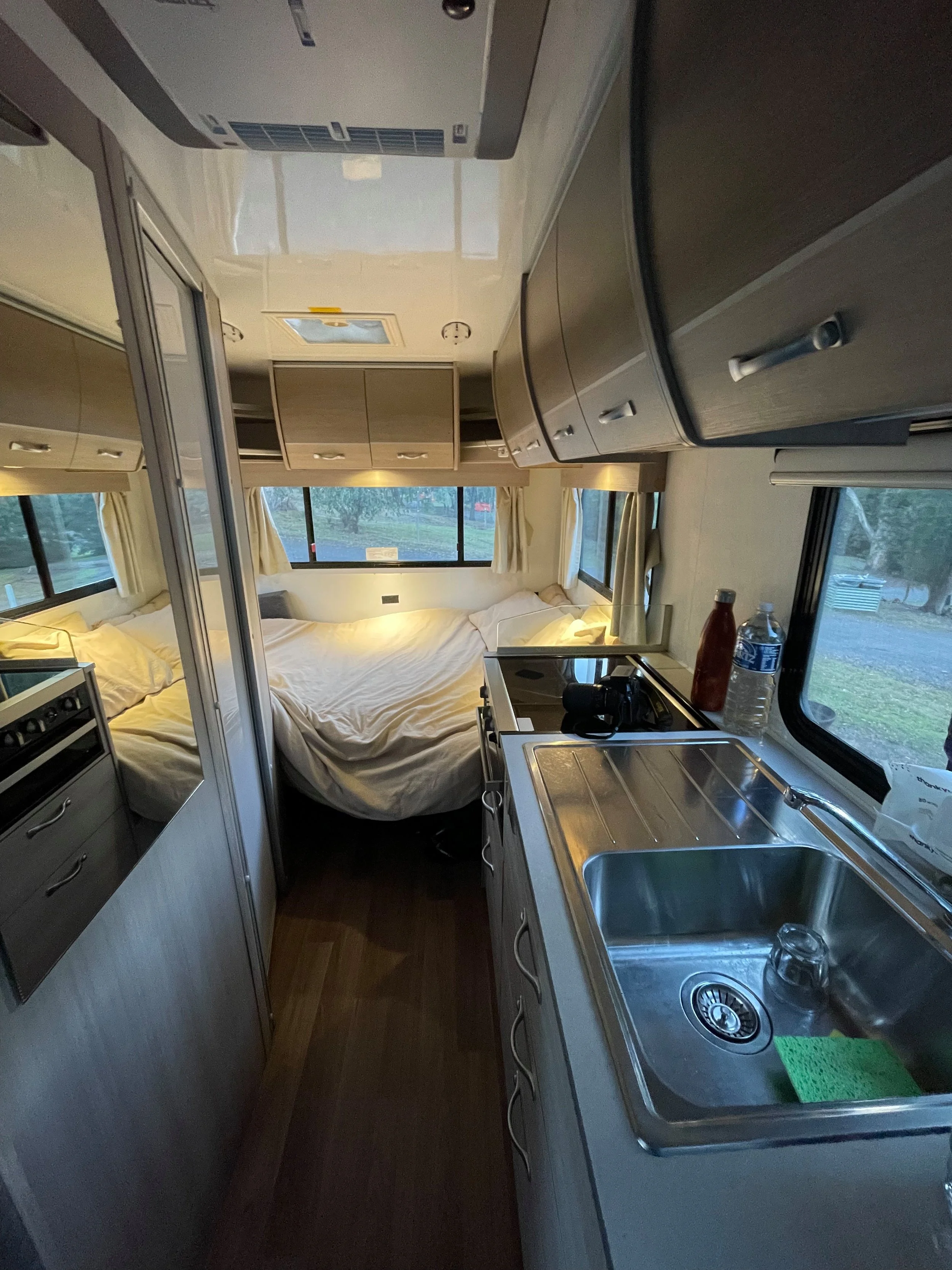 The cabin was like many vans, automatic, comfortable, easy to drive, built in satellite navigation, and good clear vision to witness all the sights along the way. While the engine was a little gutless for the size of its carried home, driving was a breeze and we are never in a hurry anyway. Once you get 80 km/h set in your mind, you soon forget any other inefficiencies. Above the cabin was a double bed we used for camera equipment storage, and further behind, a permanently set up dinette with easy access to a ¾ size fridge/freezer and galley consisting of a 4 burner stove, deep sink and plenty of bench space.
