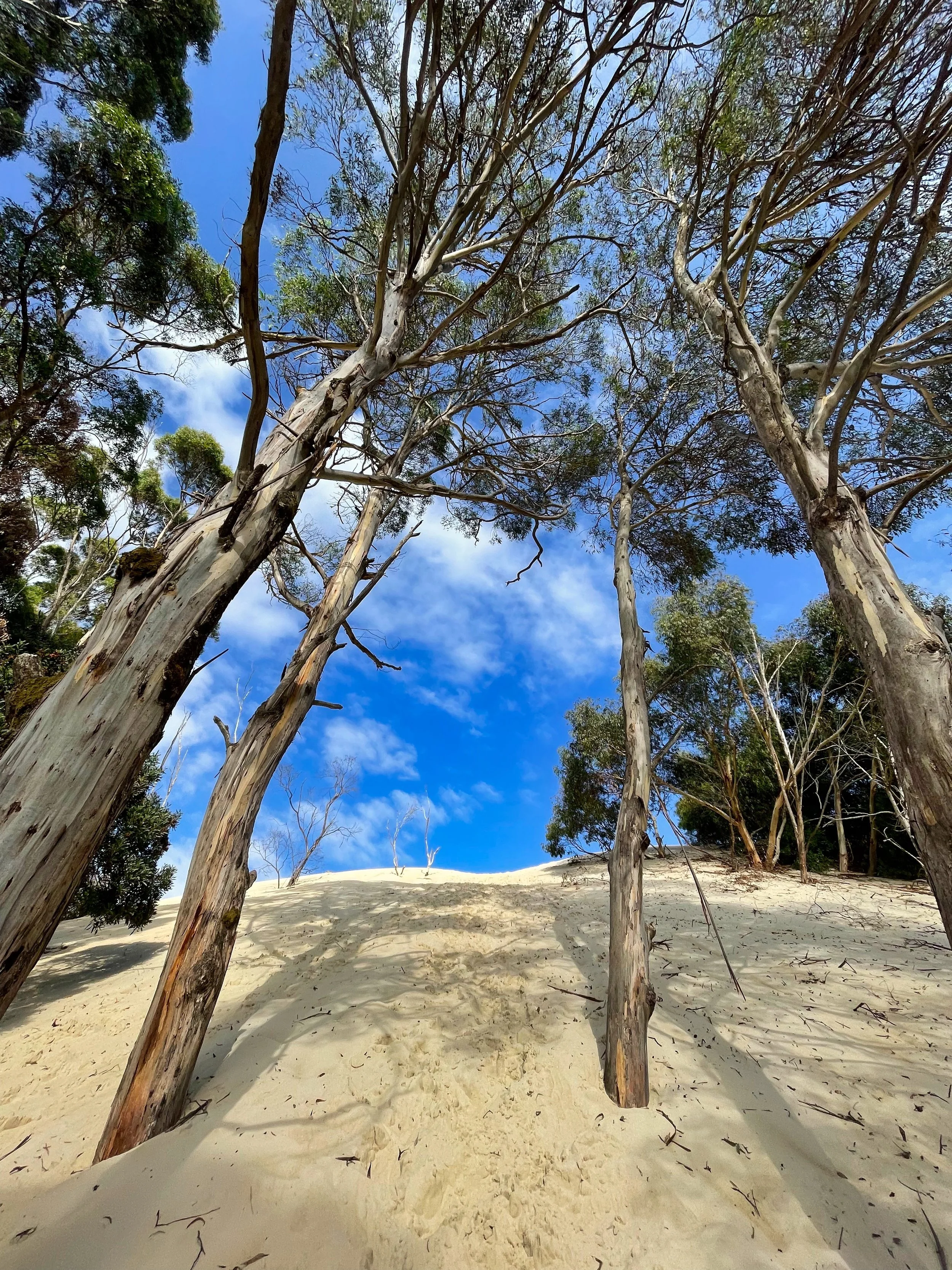 The first dune is a bitch. Steep, uneven, and tortuous on the calves. But atop this the sand levelled out and at this time of morning still held the multitude of varmint tracks made overnight. Wild dogs, fearal cats, wallaby and others imprinted the windswept sands leaving us to only imagine last nights escapades.