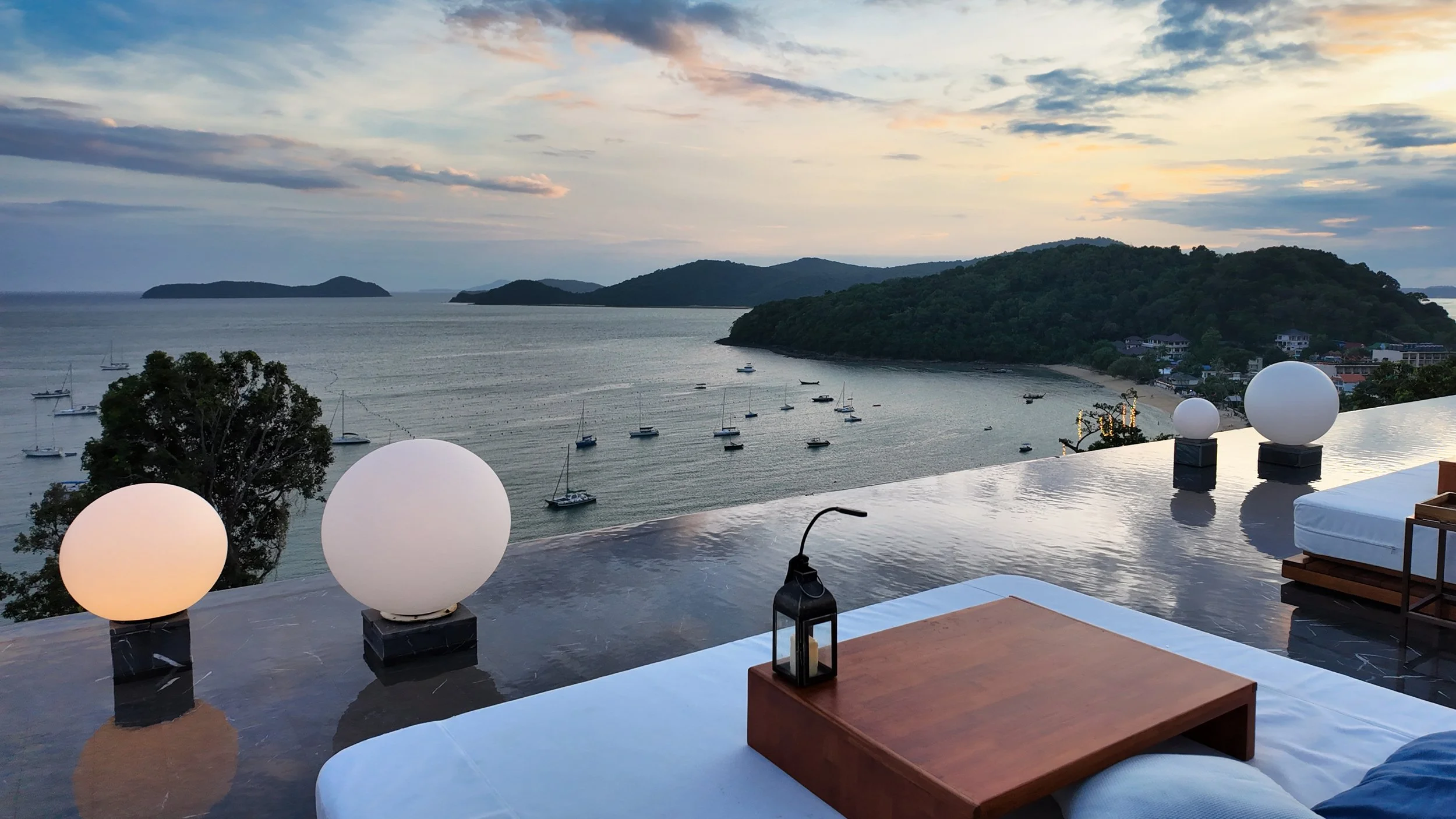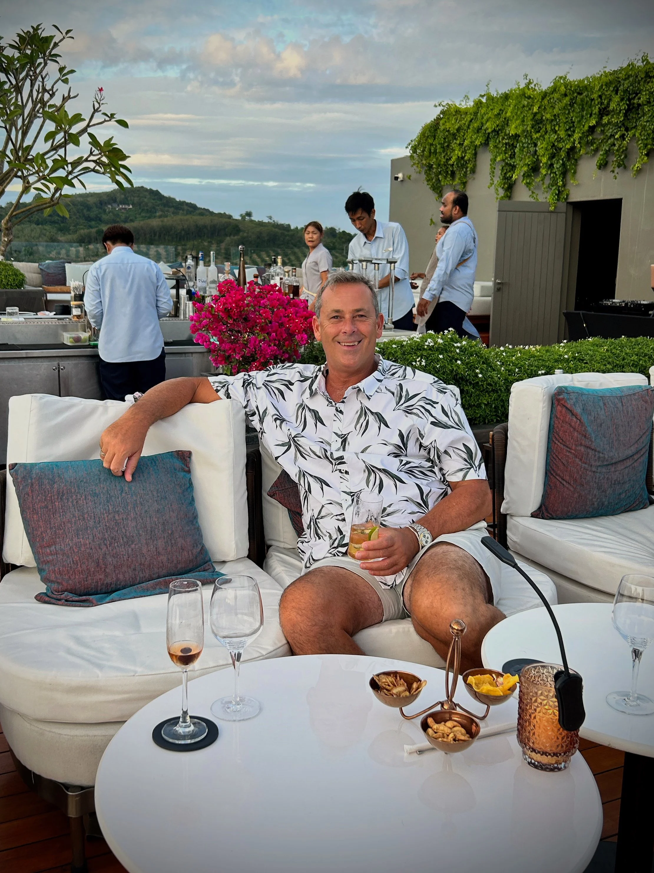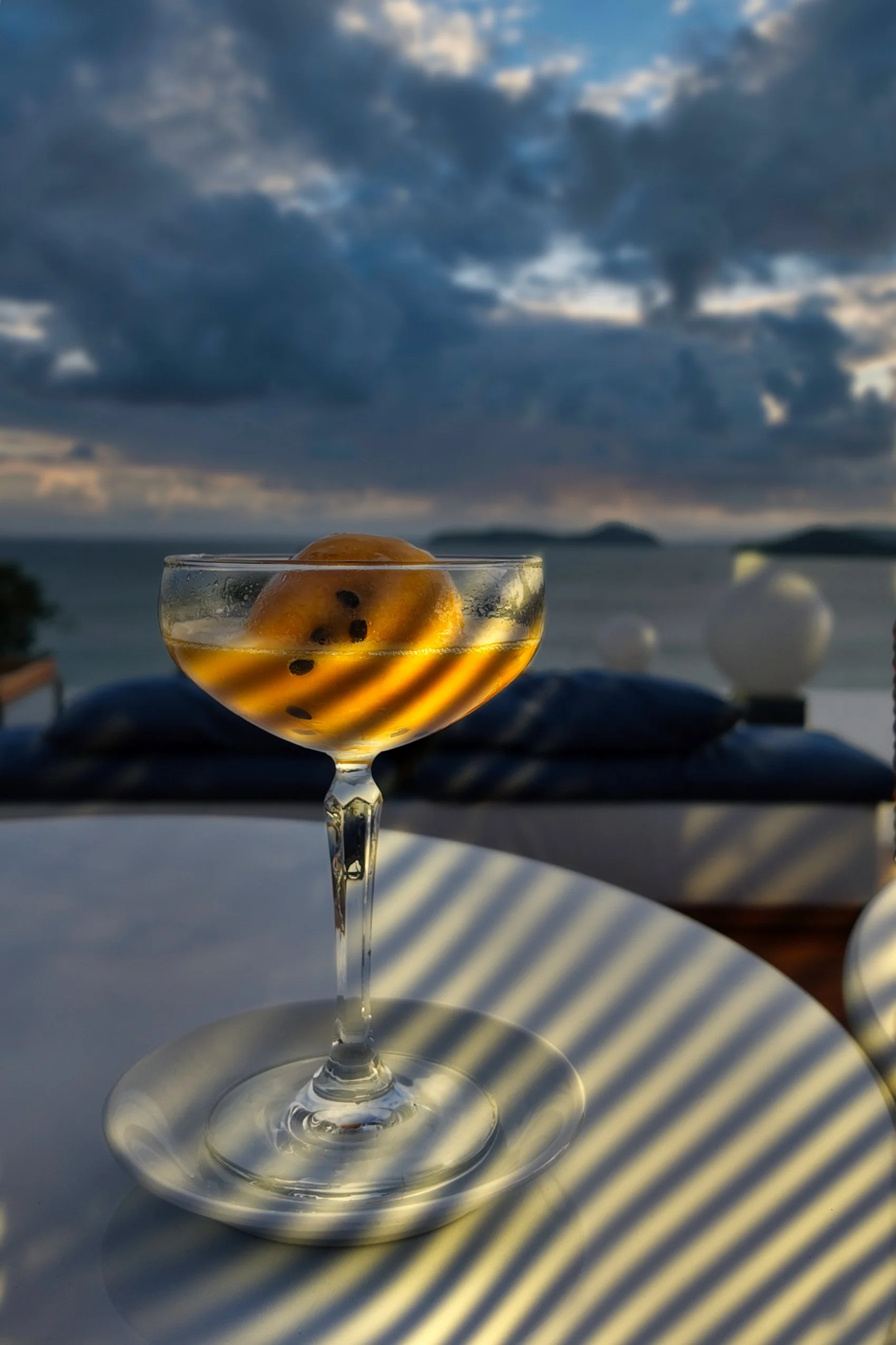 Upon arrival one is richly ushered into an electric golf cart to be chauffeured up the mountain and into an airy bar affording 180° views of Ao Yon Beach and the bay behind. Here a sublimely perfect passionfruit sorbet cocktail was served that slowly melted in the equatorial heat before taking a short elevator ride to the rooftop bar. Here is where the magic unravelled.