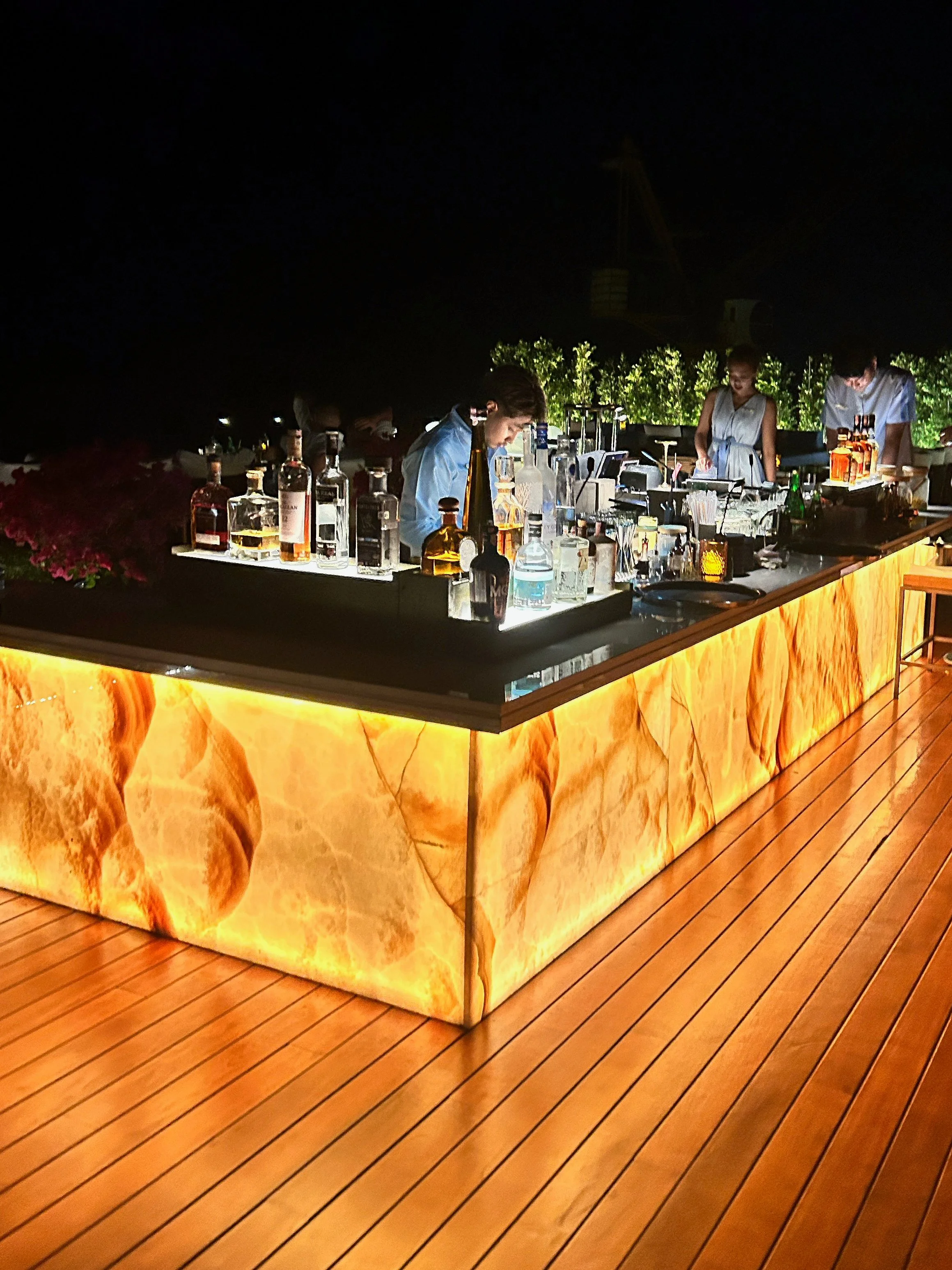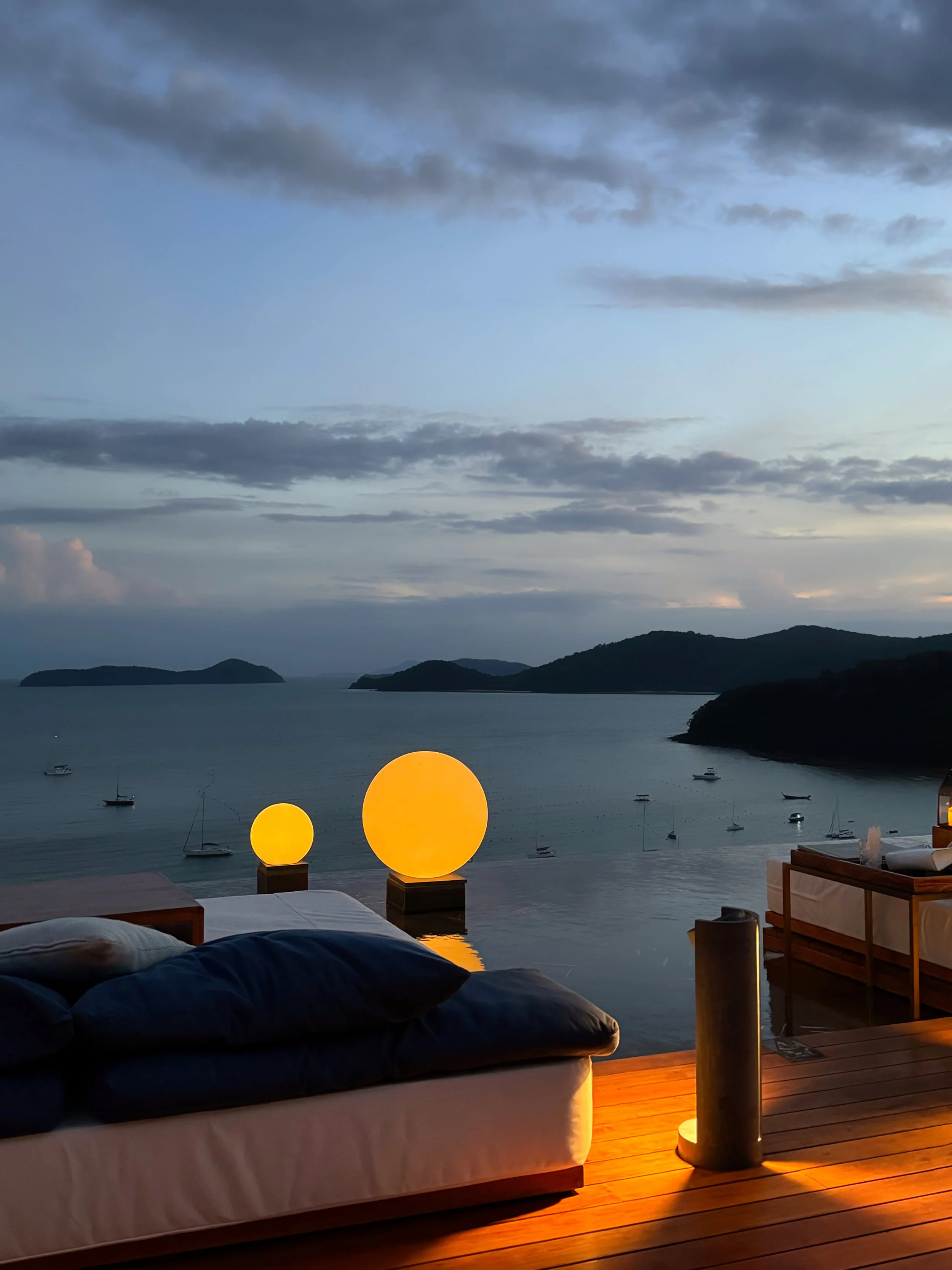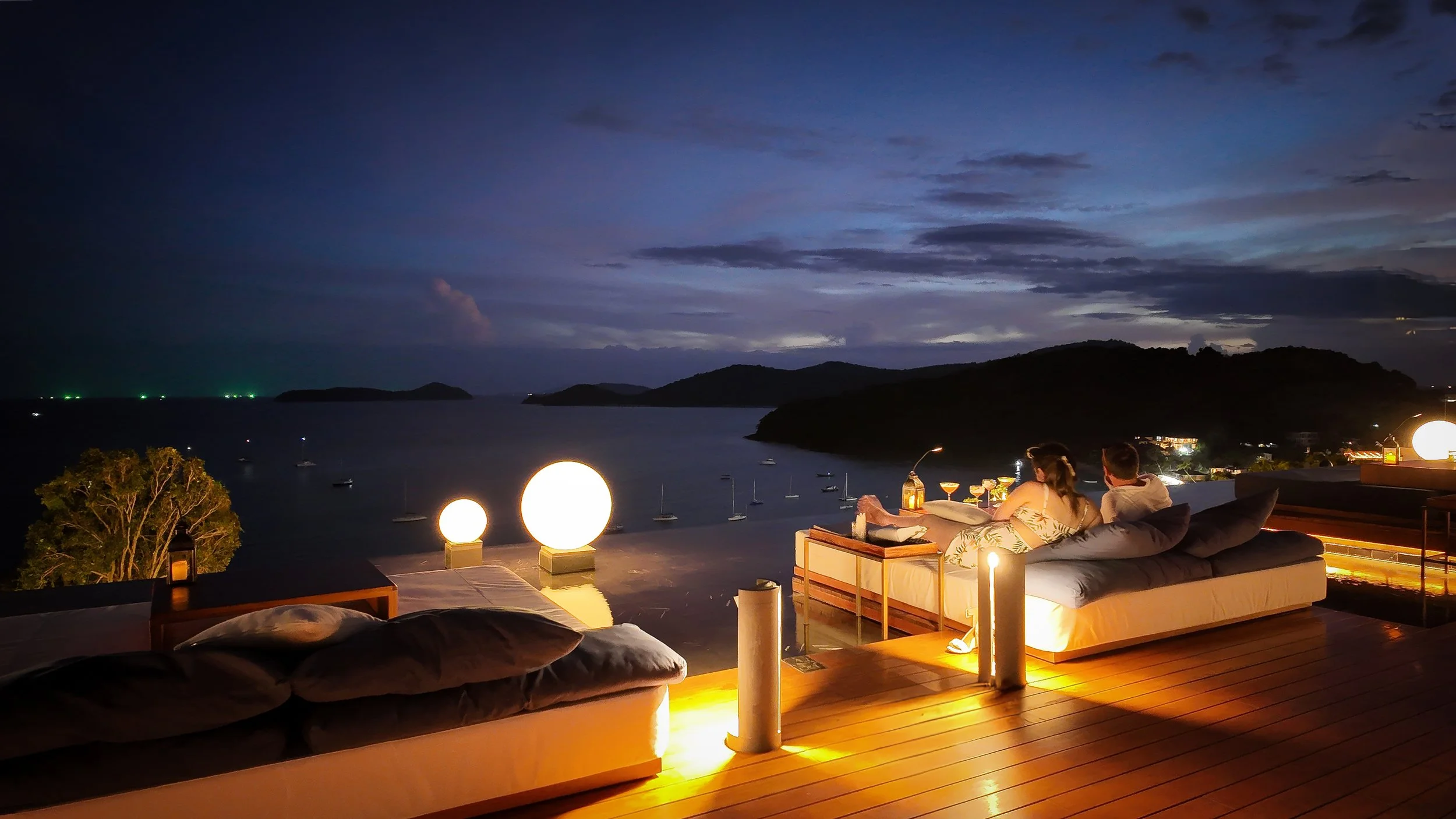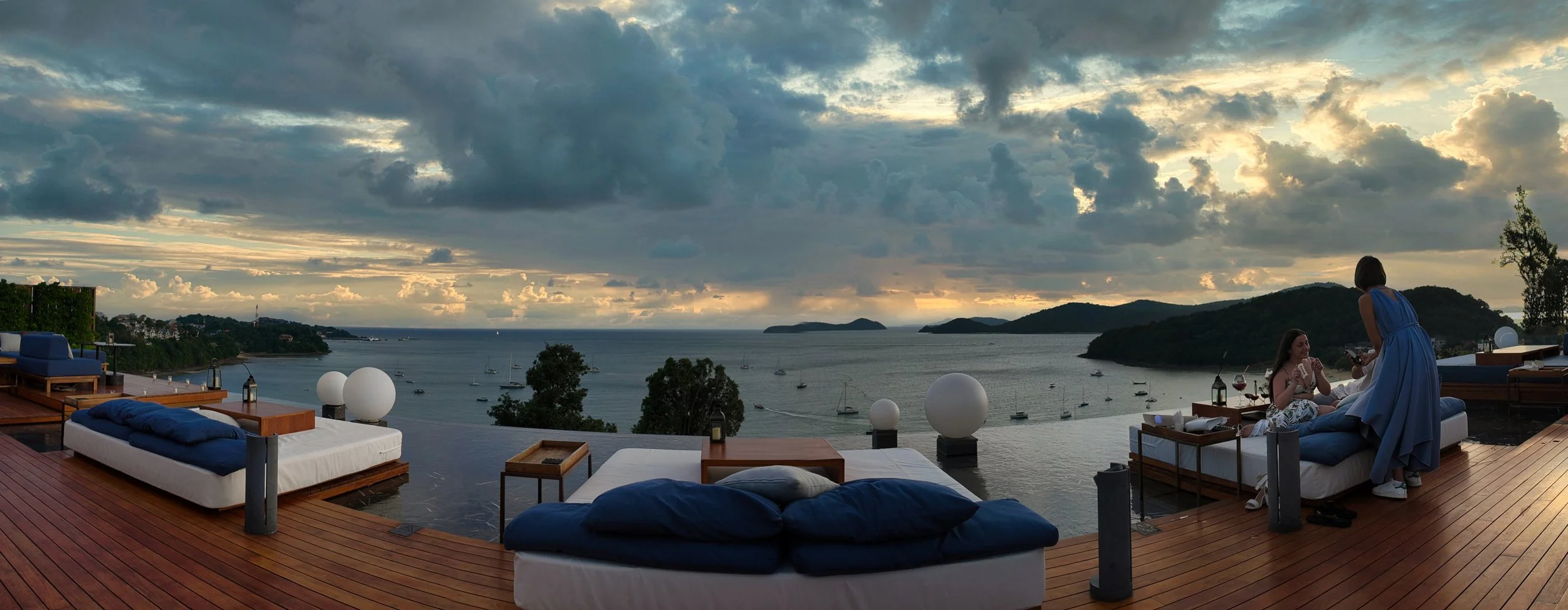 Upon arrival one is richly ushered into an electric golf cart to be chauffeured up the mountain and into an airy bar affording 180° views of Ao Yon Beach and the bay behind. Here a sublimely perfect passionfruit sorbet cocktail was served that slowly melted in the equatorial heat before taking a short elevator ride to the rooftop bar. Here is where the magic unravelled.