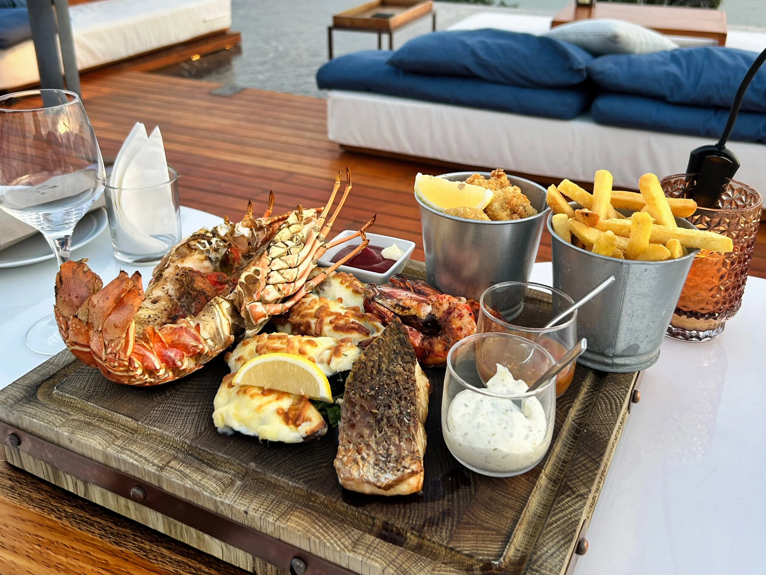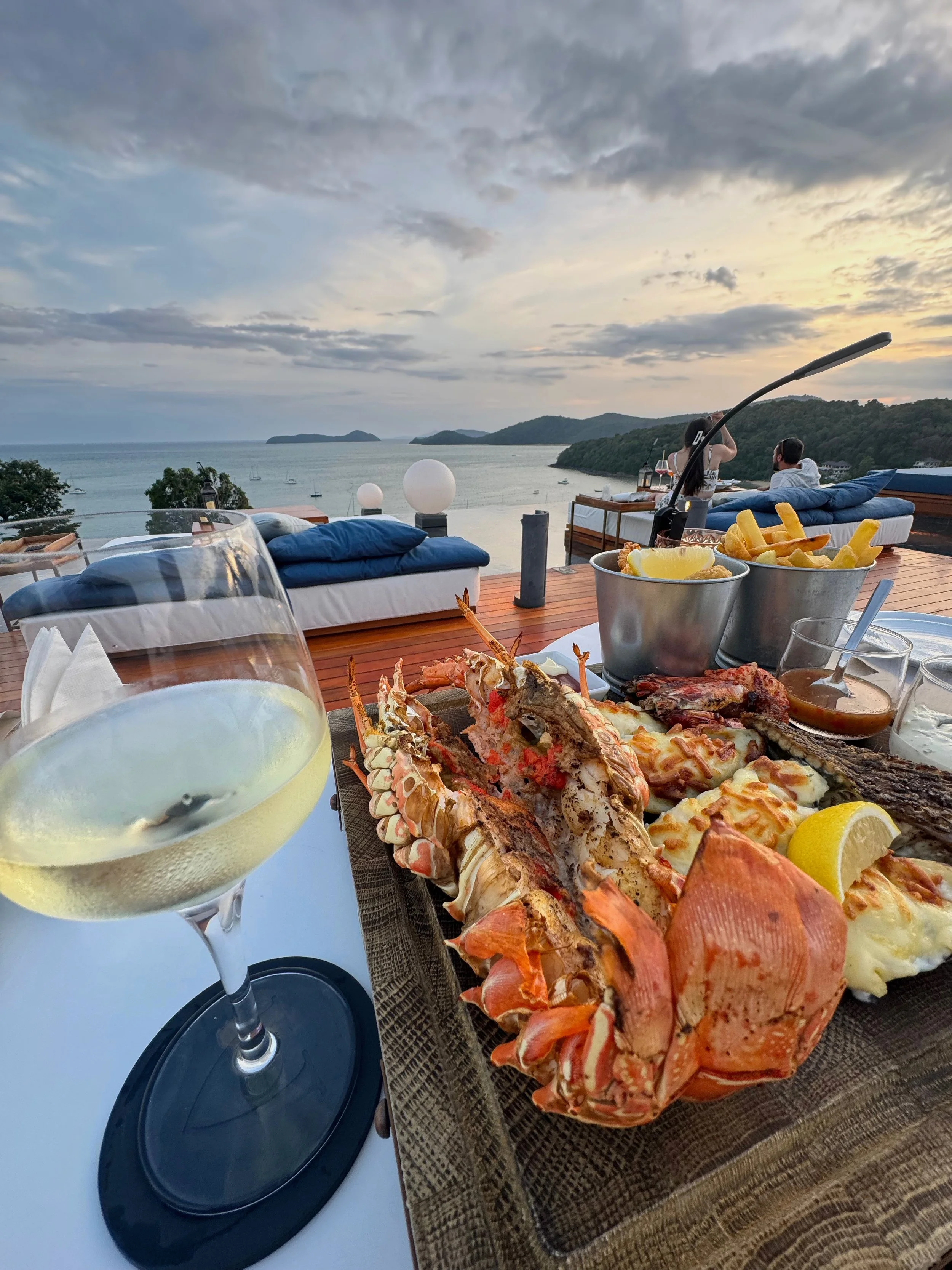 The sun slowly set and that promised Instagramable view constantly changed. The resident DJ leaked ever-so dulcet tones and the forever attentive staff offered drinks, snacks and aided selfies. To be polite another cocktail was enjoyed before a bottle of wine selected to accompany dinner. Here the house specialty could not be overlooked and an absolutely monstrous platter arrived brimming with local seafood delicacies. Muscles, calamari, snapper, lobster and chilli prawns slowly disappeared with the sun on the horizon as Fatpap contributed over-excessively to his name.